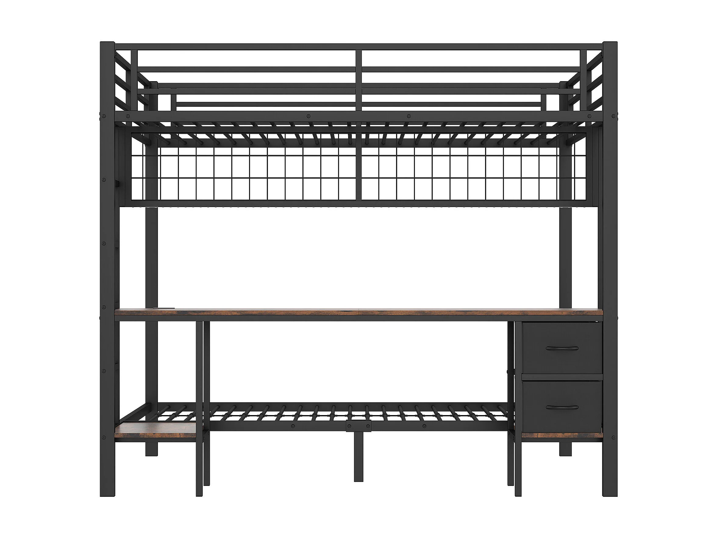 Letto a castello 90x200 cm e 140x200 cm con 2 cassetti, scrivania, LED e porte USB, nero