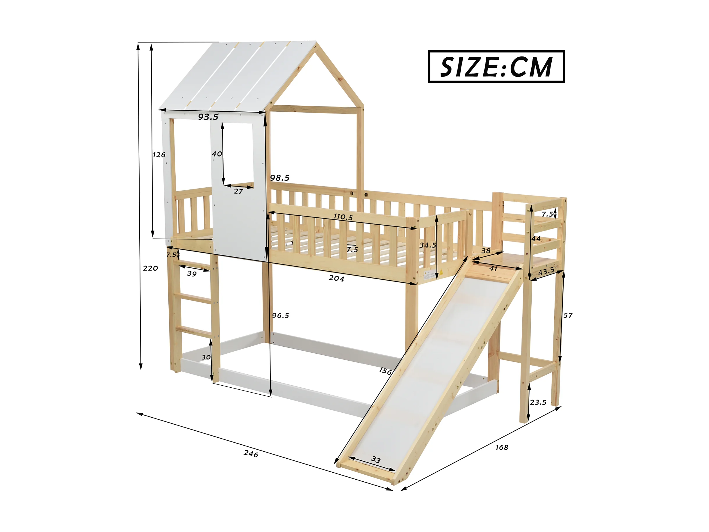 Letto a castello 90x200cm - letto a castello per bambini con scaletta, scivolo, tetto e finestra - anticaduta - letto in pino naturale + bianco