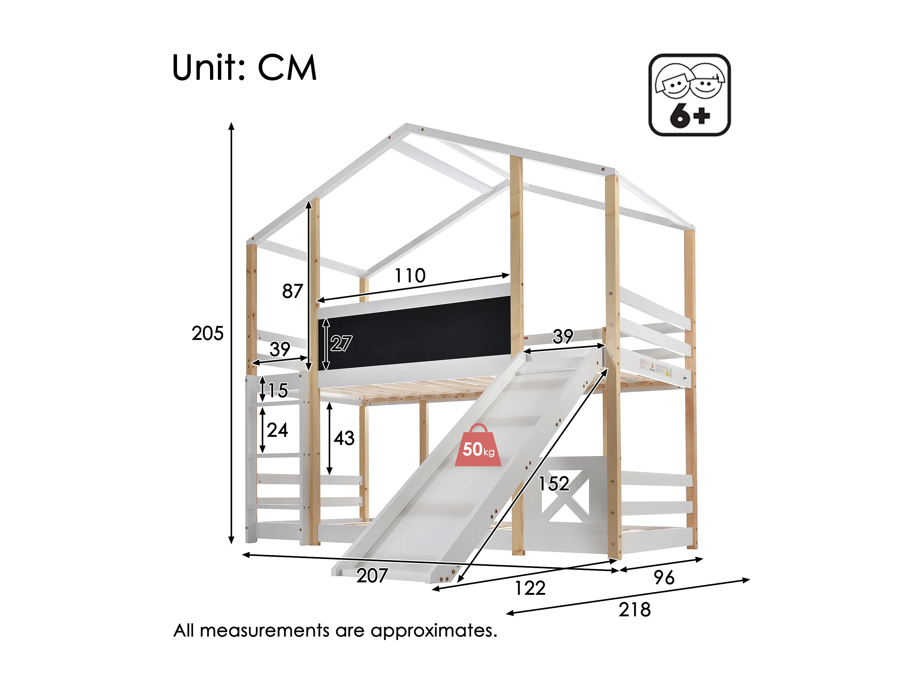 Letto a castello 90x200 cm Letto per bambini con scaletta e scivolo, rete a doghe - naturale e bianco (senza materasso)