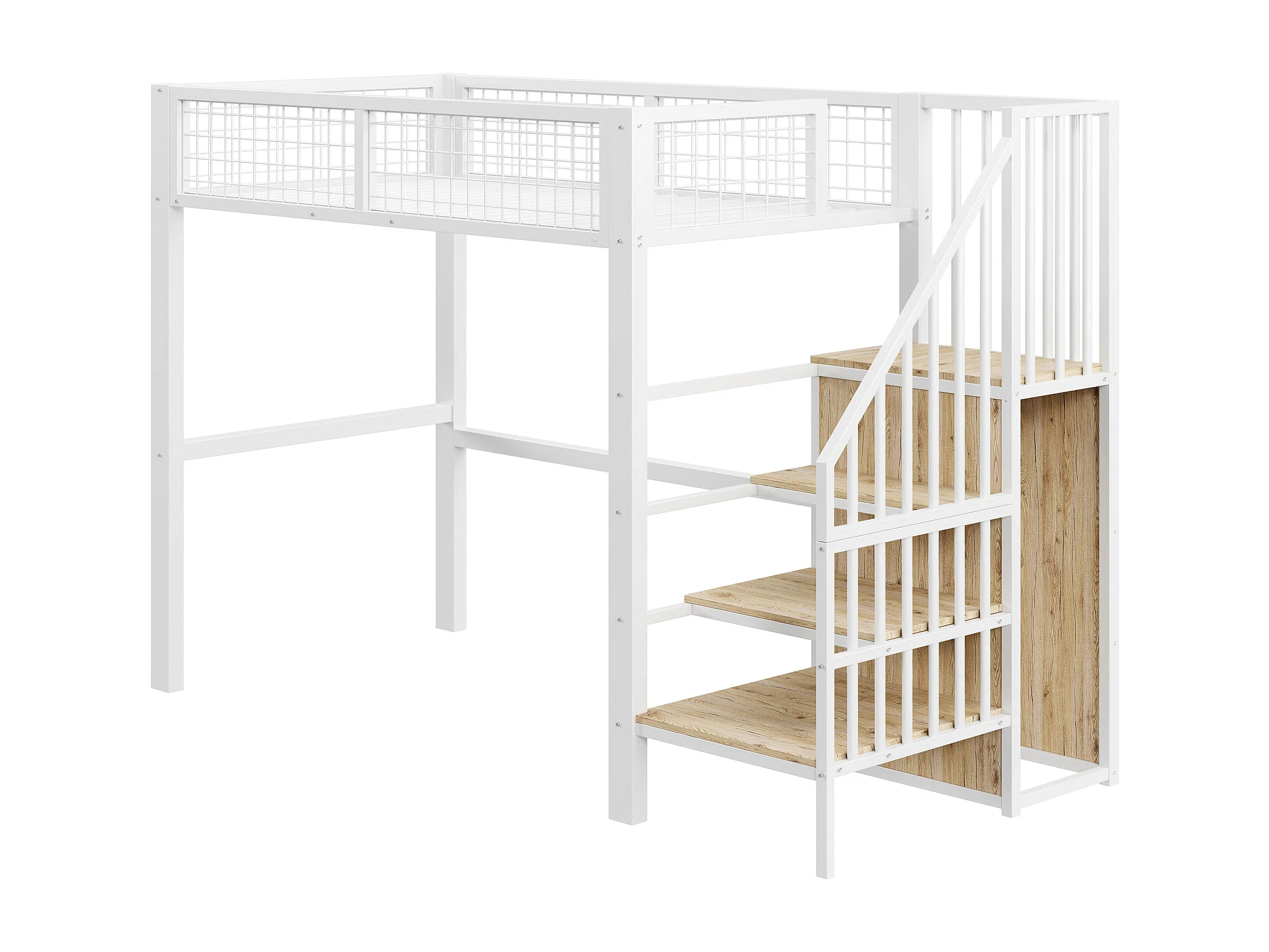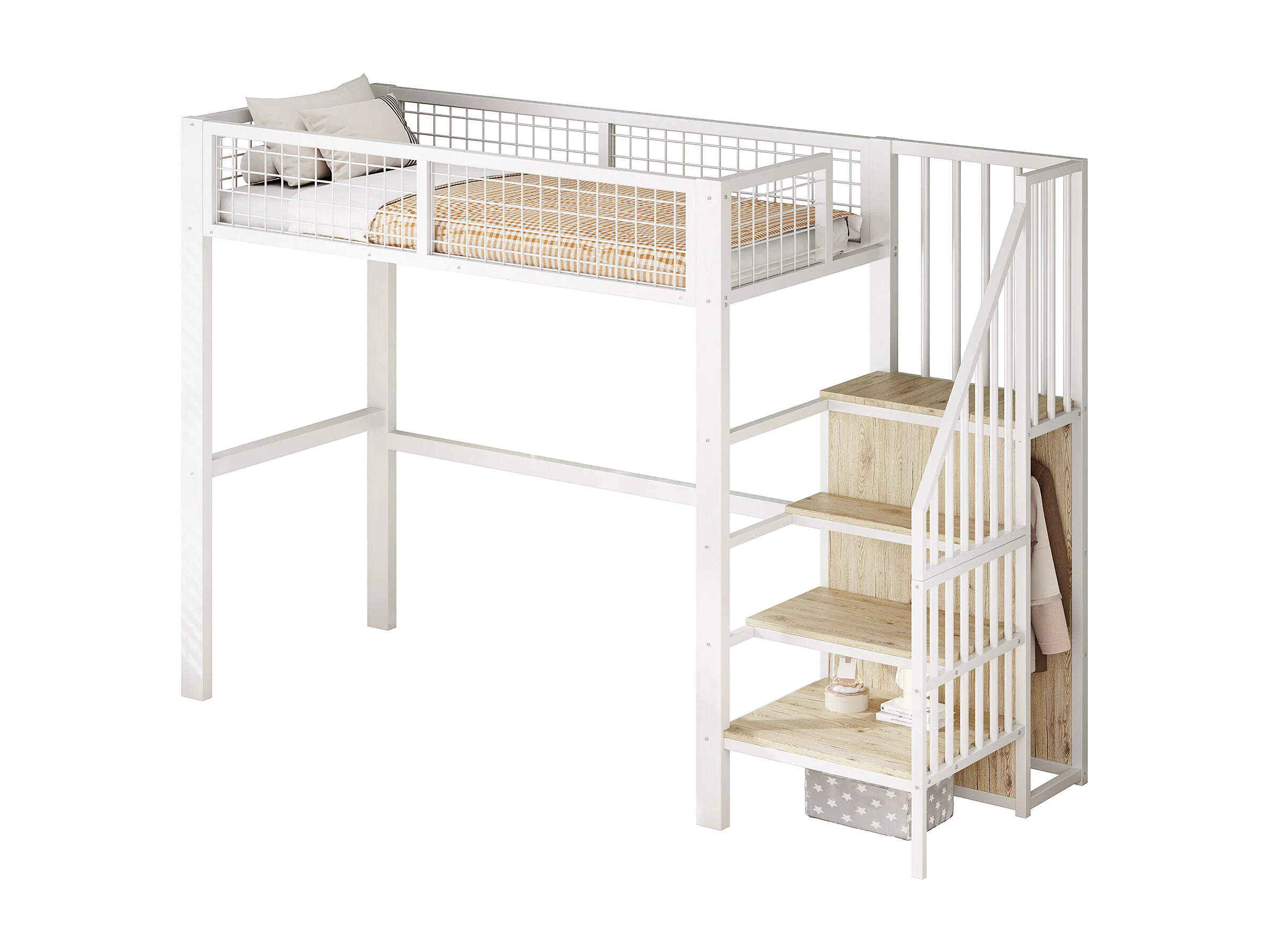 Letto a castello 90x200 con scaletta, struttura in metallo e vano contenitore, armadio, bianco (255x95x176 cm)
