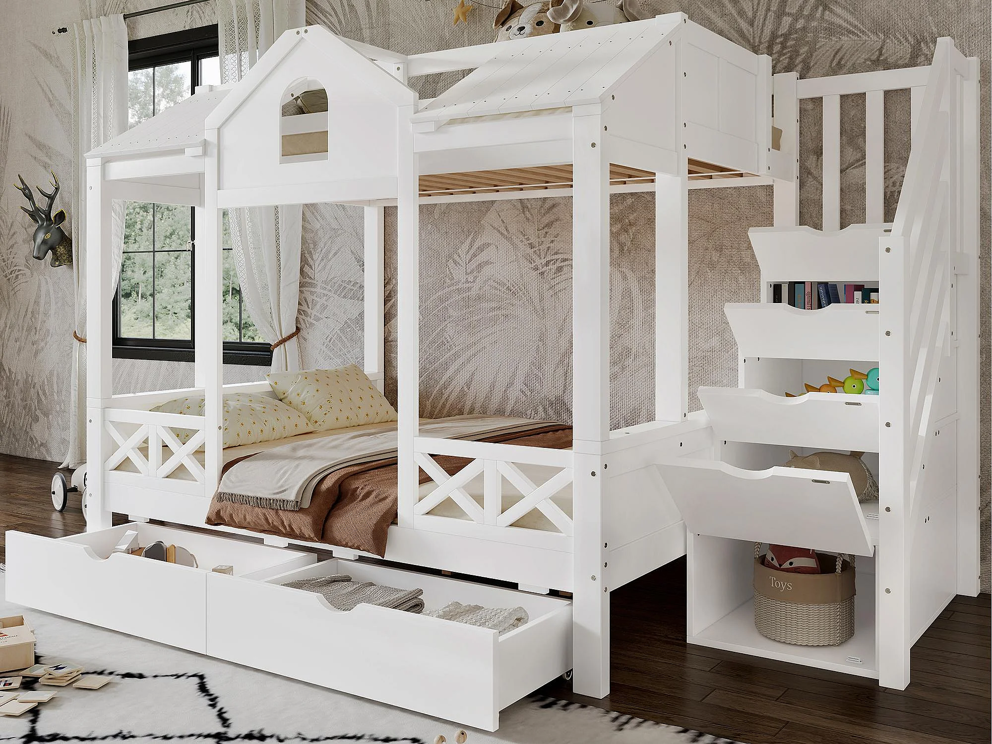 Letto a castello 90x200cm + 140x200cm - con 2 cassetti - con balaustre e finestre - scala con ripostiglio - Bianco (senza materasso)