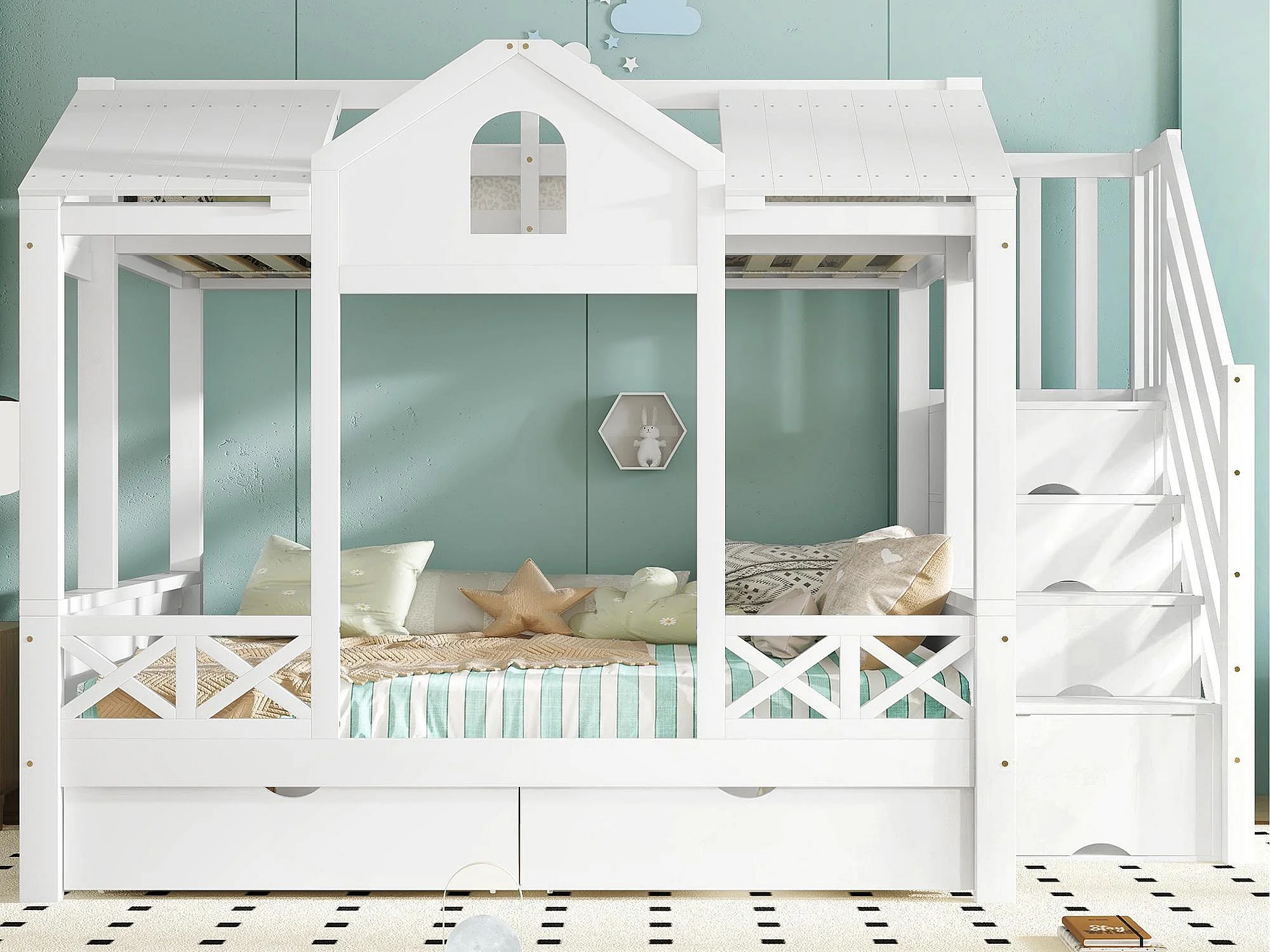 Letto a castello, letto per bambini con sponda di sicurezza a contrasto, due cassetti, finestra