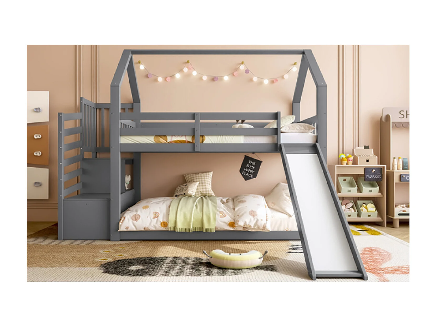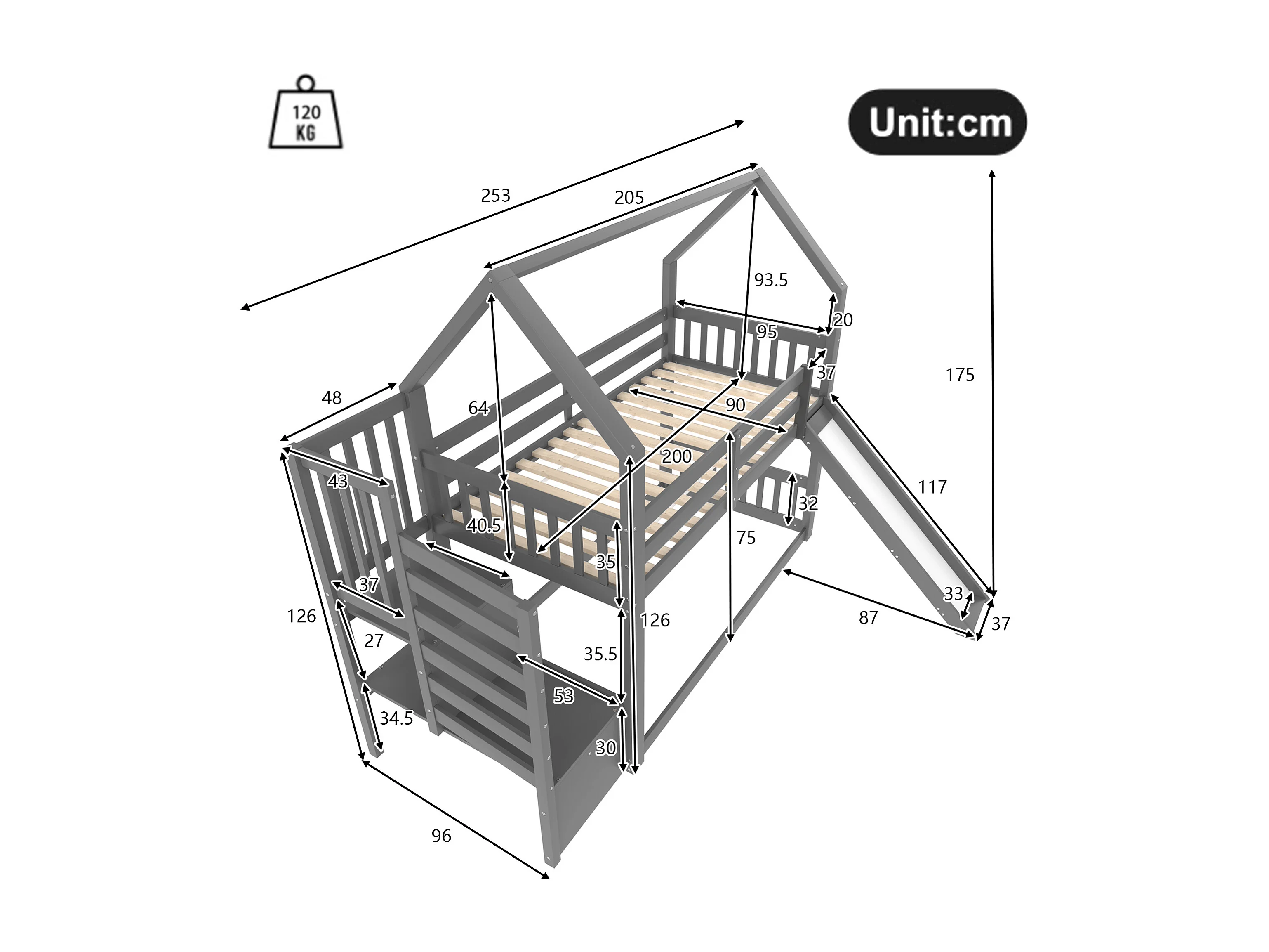 Letto a castello 90x200cm con scala contenitore e scivolo - Letto a soppalco per bambini in legno grigio