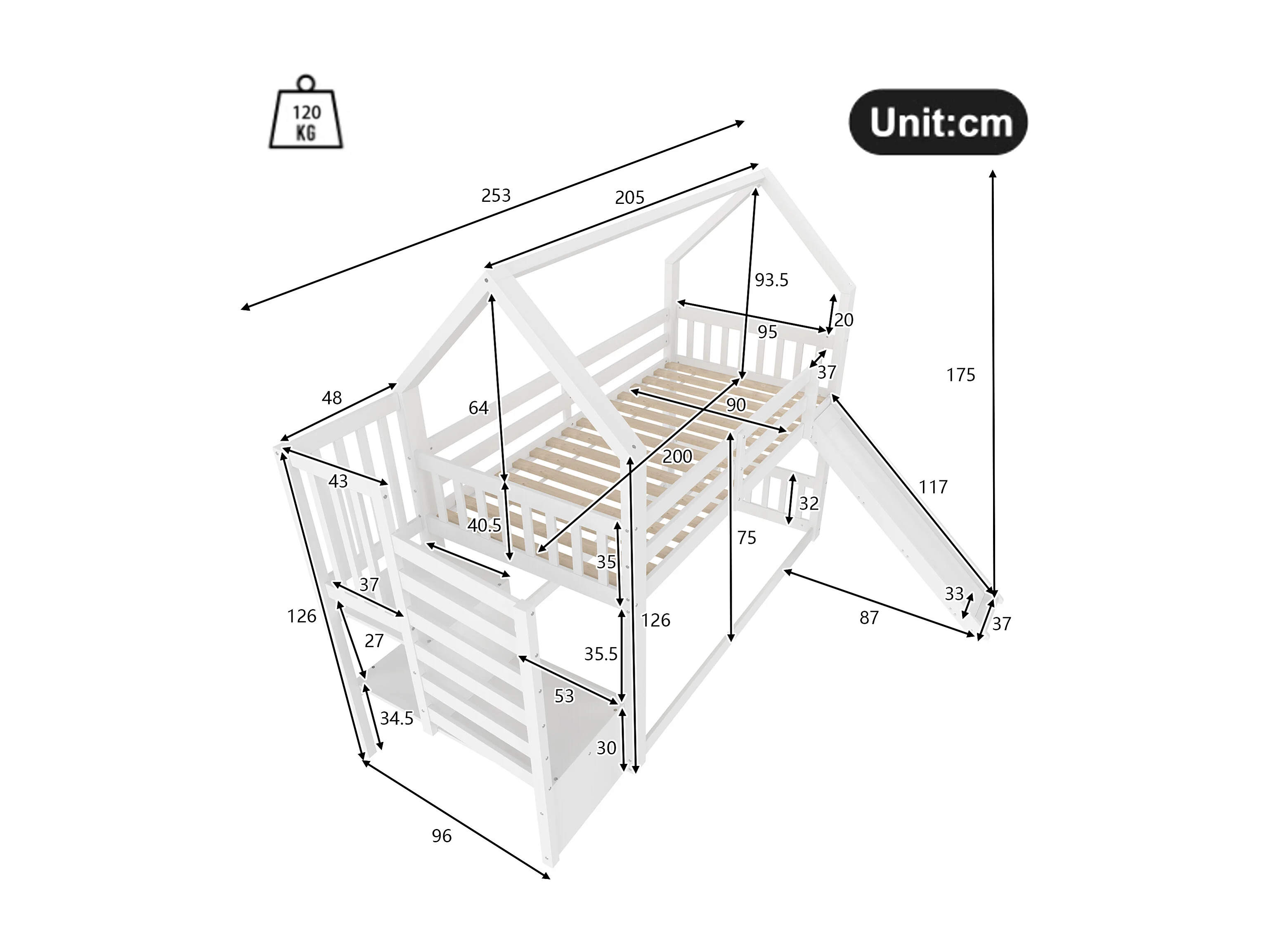 Letto a castello 90x200cm con scaletta contenitore e scivolo - Letto a castello per bambini in legno bianco