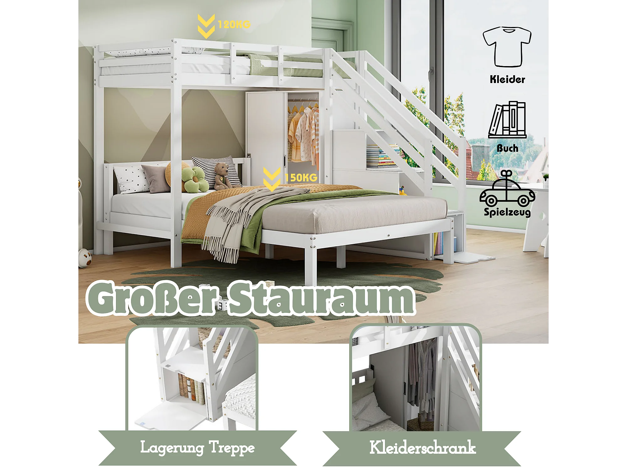 Letto a castello con armadio, scrivania e contenitore, legno massello, bianco (90x200 cm + 140x200 cm)