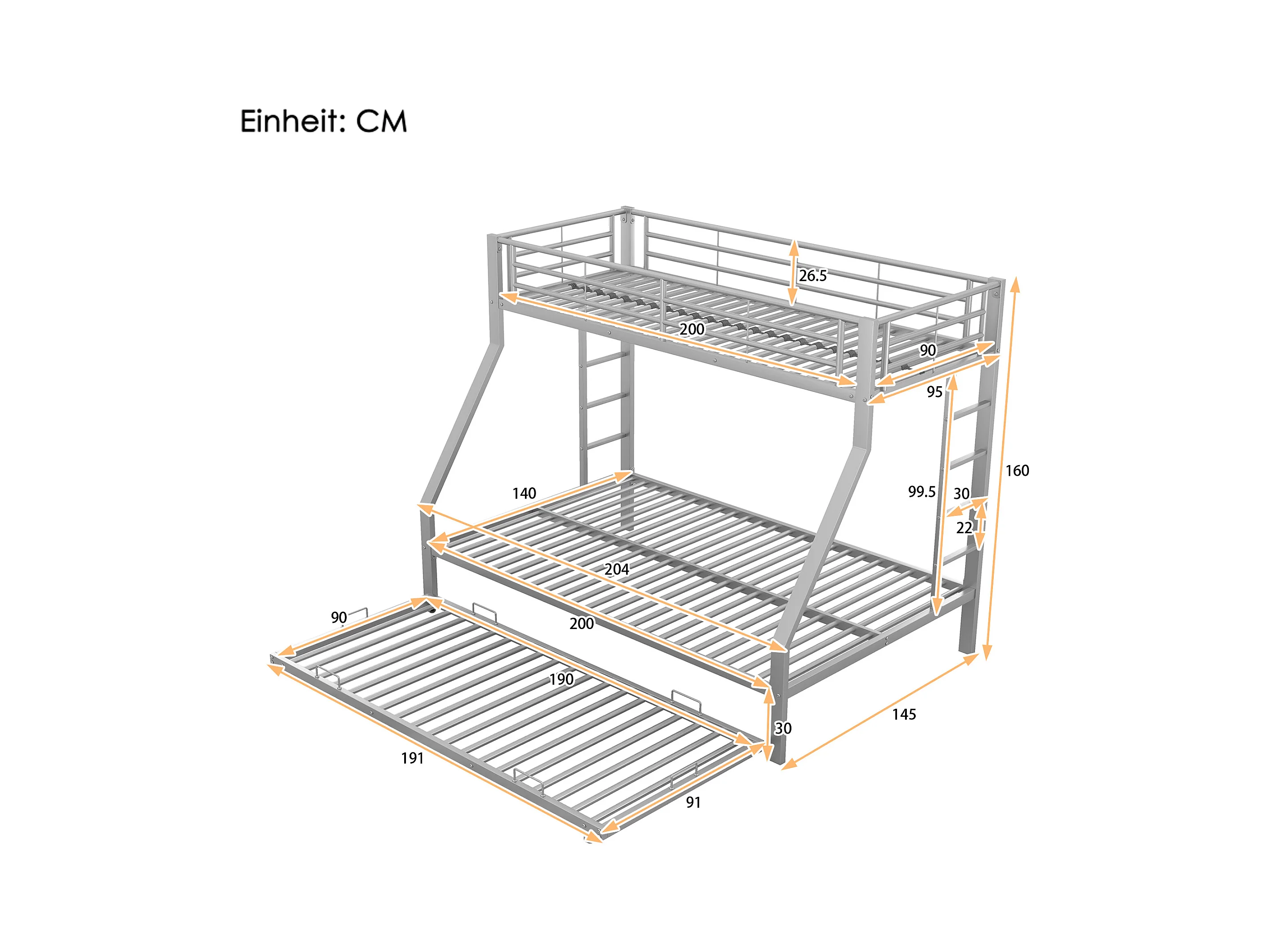 Letto a castello estraibile 4 posti - 140 x 200 cm + 2 x 90 x 200 cm - metallo - rete a doghe - colore grigio
