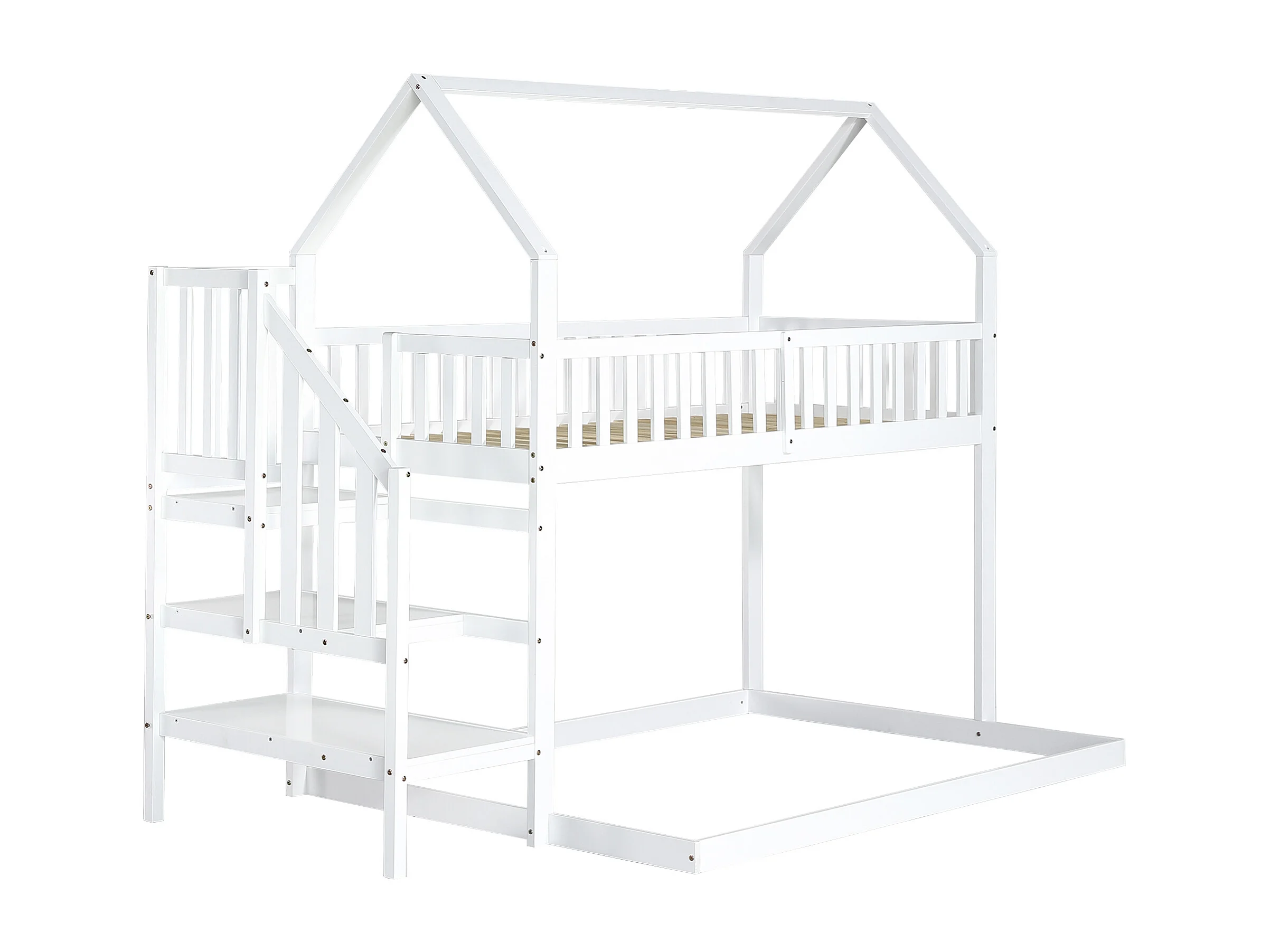 Letto a castello, letto a castello con scaletta, letto per bambini con protezione anticaduta e ringhiere, struttura in pino, bianco (90 x 200 e 140 x 190 cm)