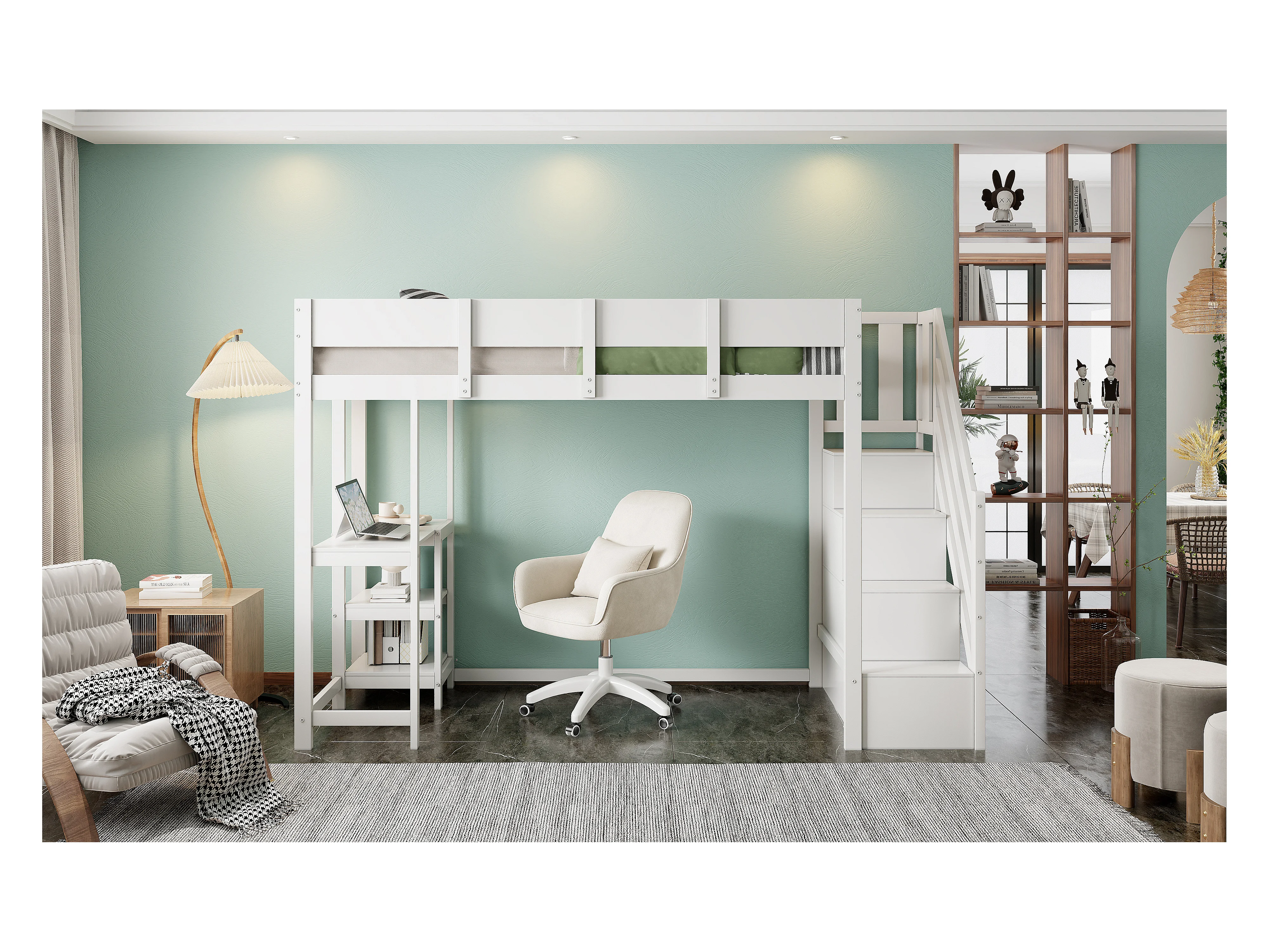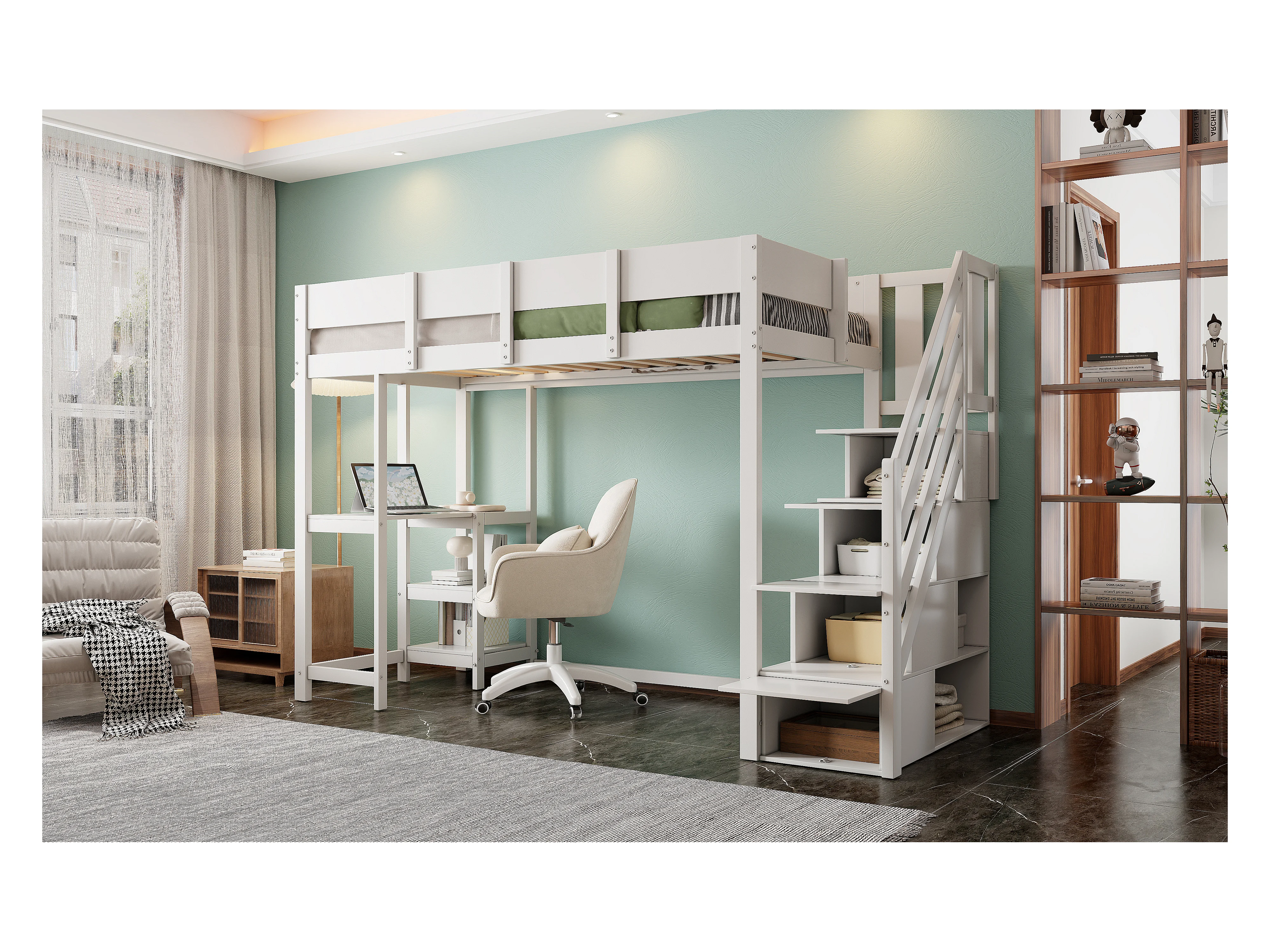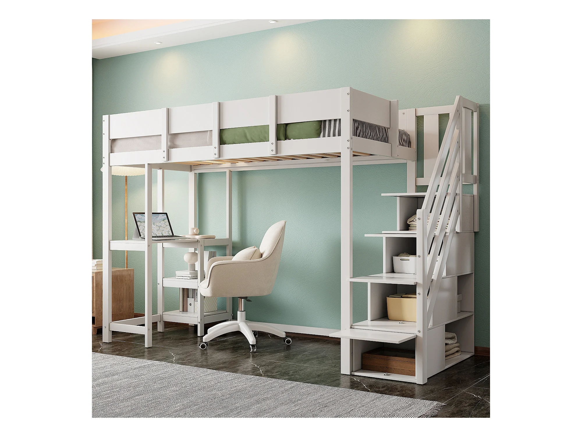 Letto a castello multifunzionale con contenitore e ripiano, in legno massello di pino, bianco (90x200 cm)