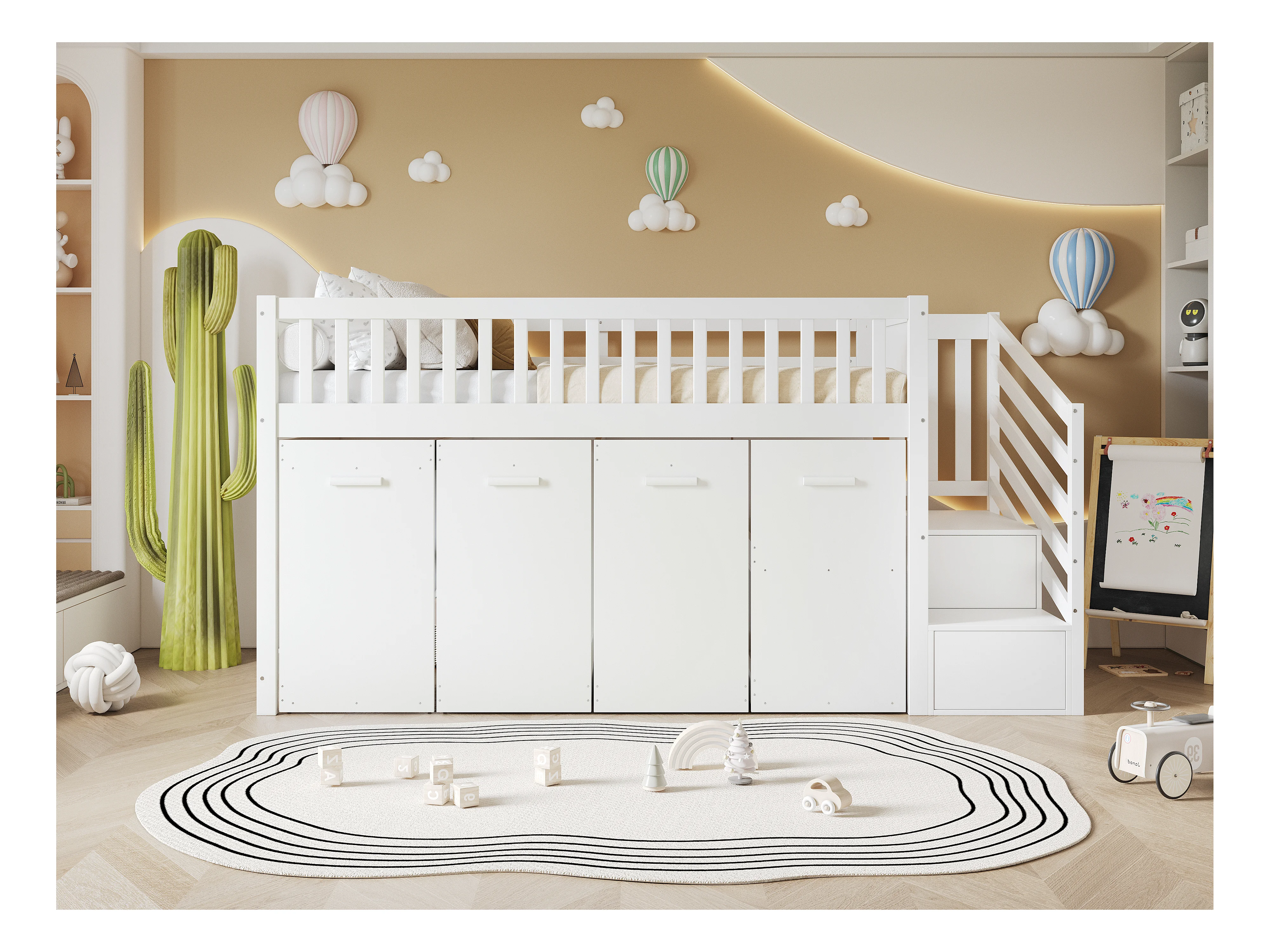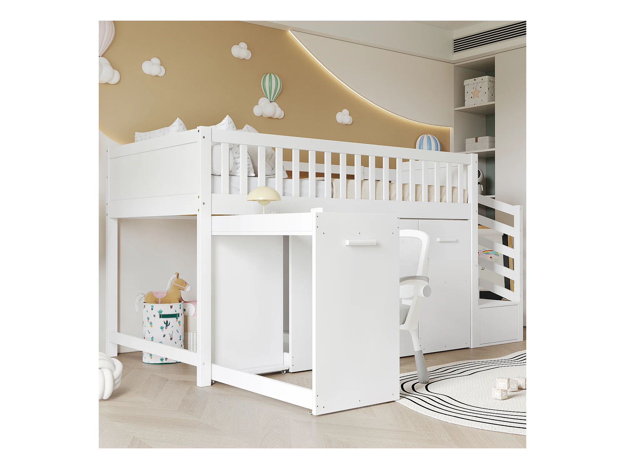 Letto a castello multifunzionale con scrivania, armadio e cassetti portaoggetti, pino e MDF, bianco (254x95x115cm)