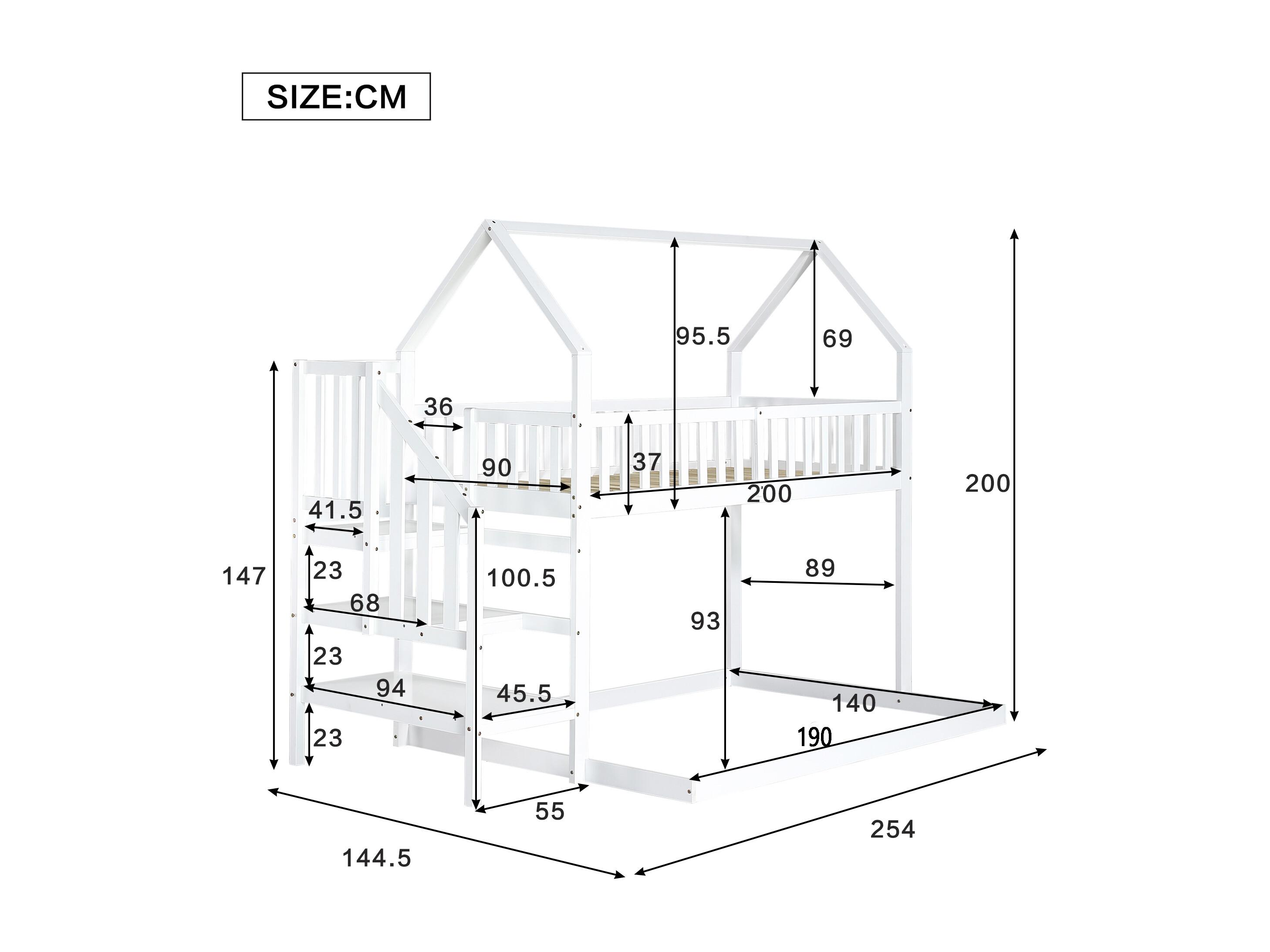 Letto a castello, 90x200cm e 140x200cm, con rete a doghe, letto con cassetto scorrevole e scaletta, pino, bianco (253x240x160 cm)