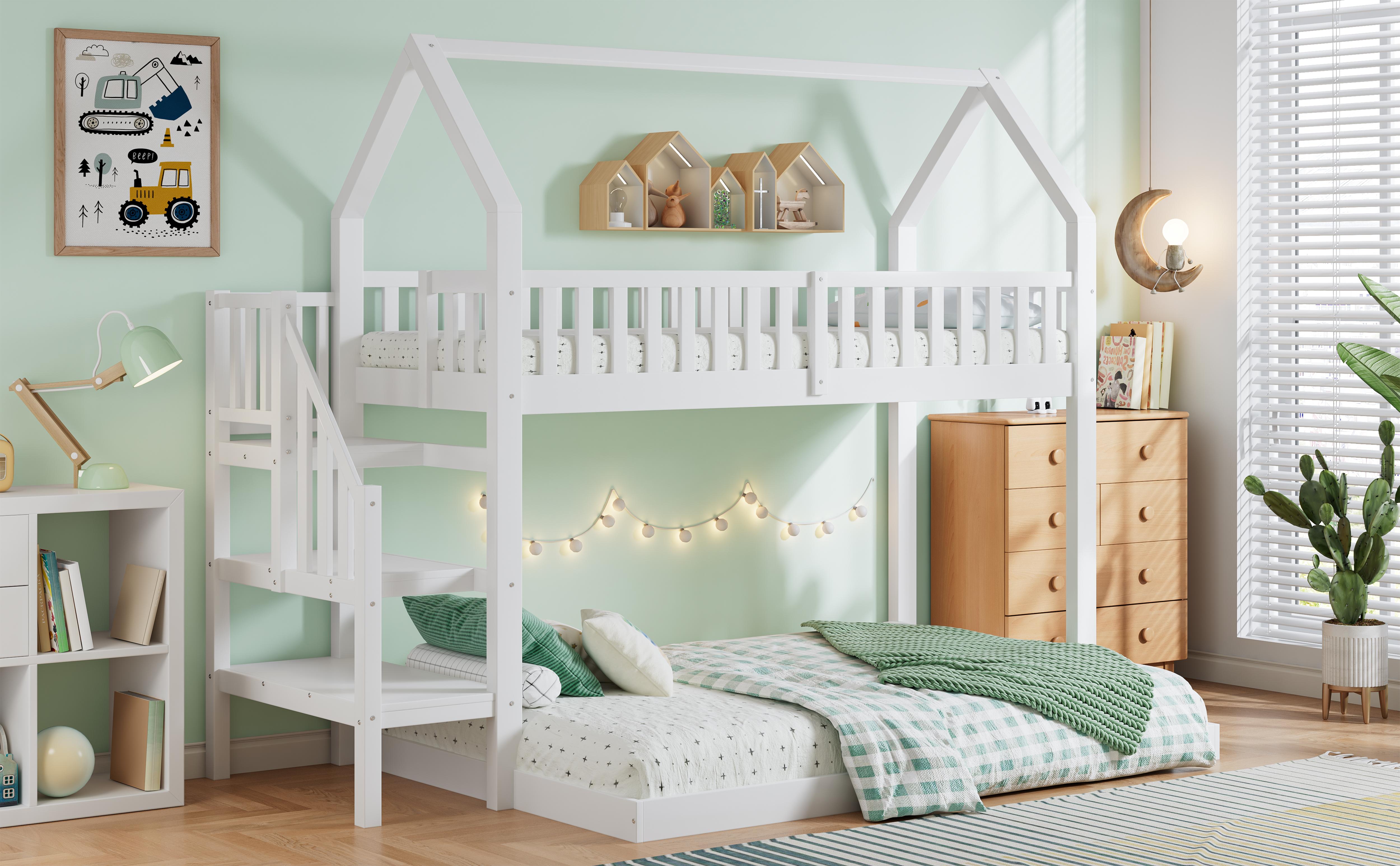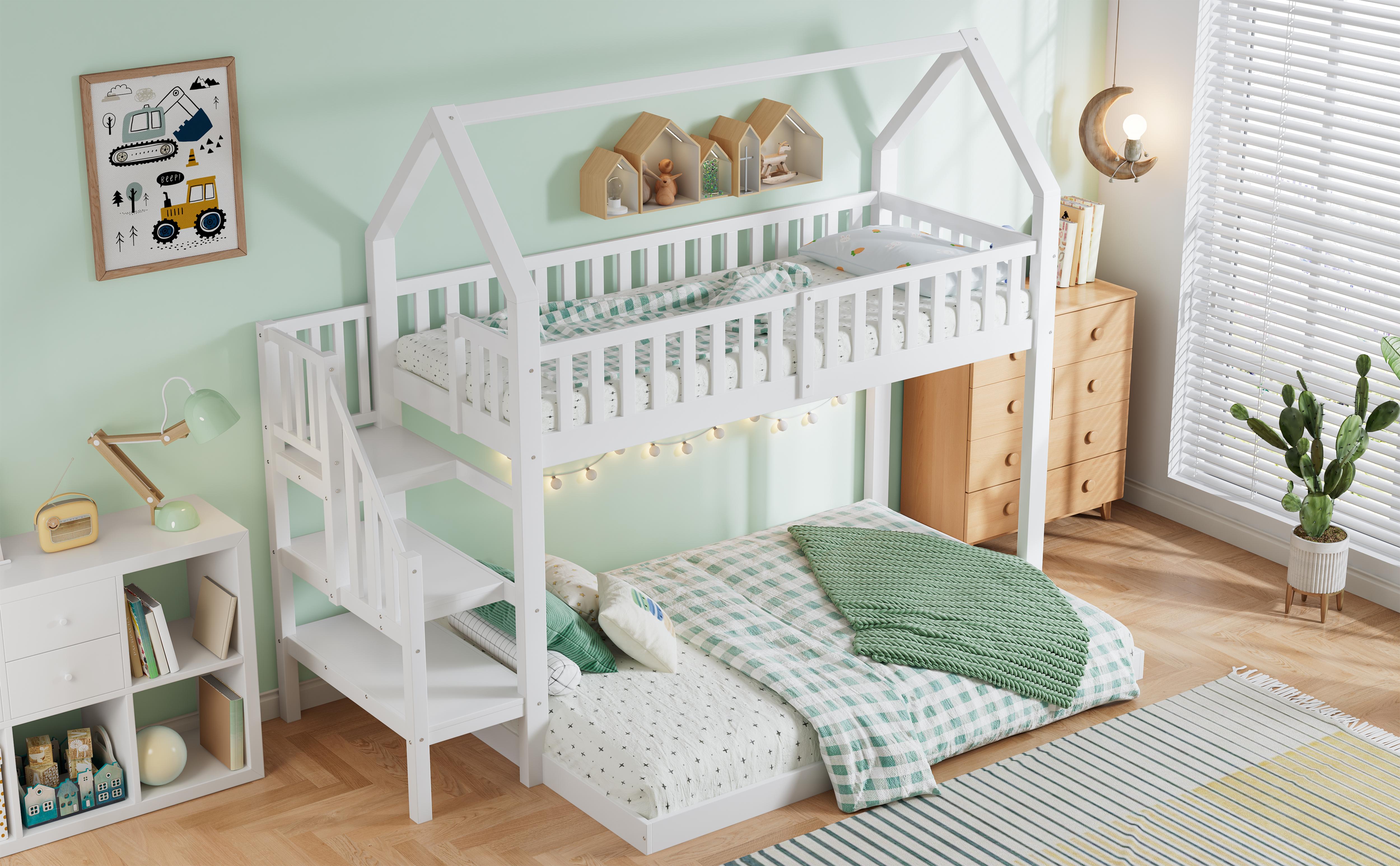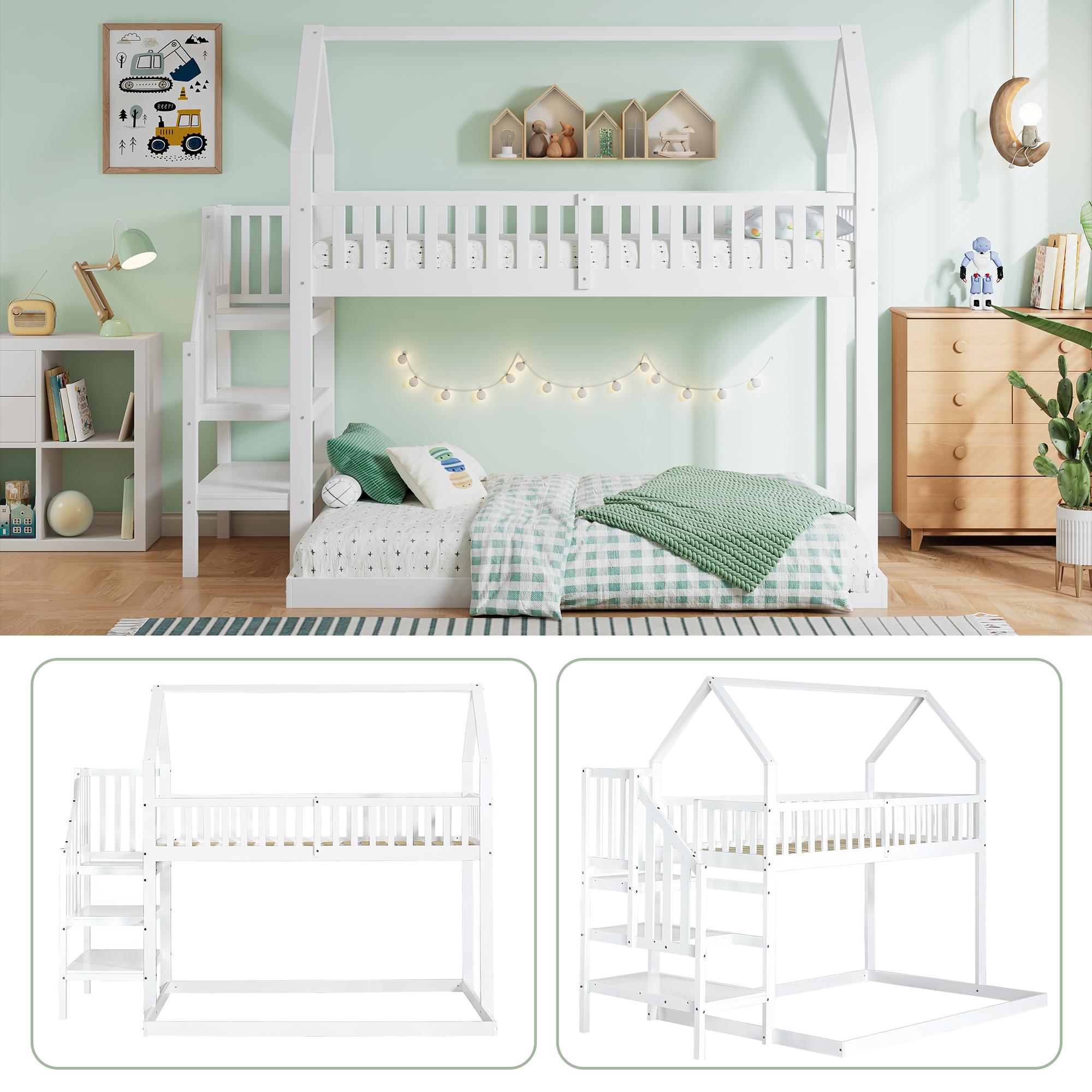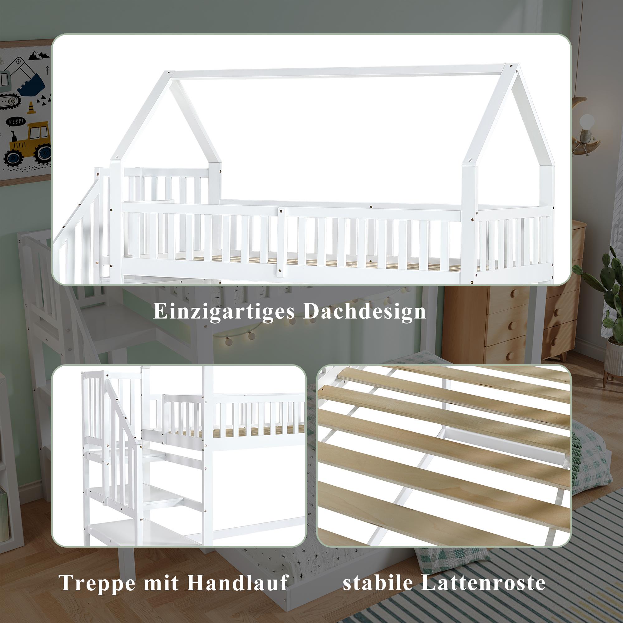 Letto a castello con letto scorrevole, scaletta con contenitore, protezione su 4 lati, MDF + pino, bianco, 90x190 cm + 90/120x200 cm (257x146x145 cm)