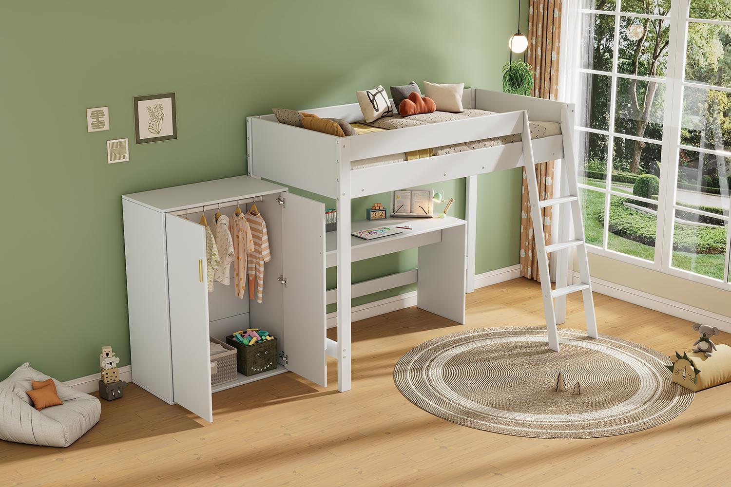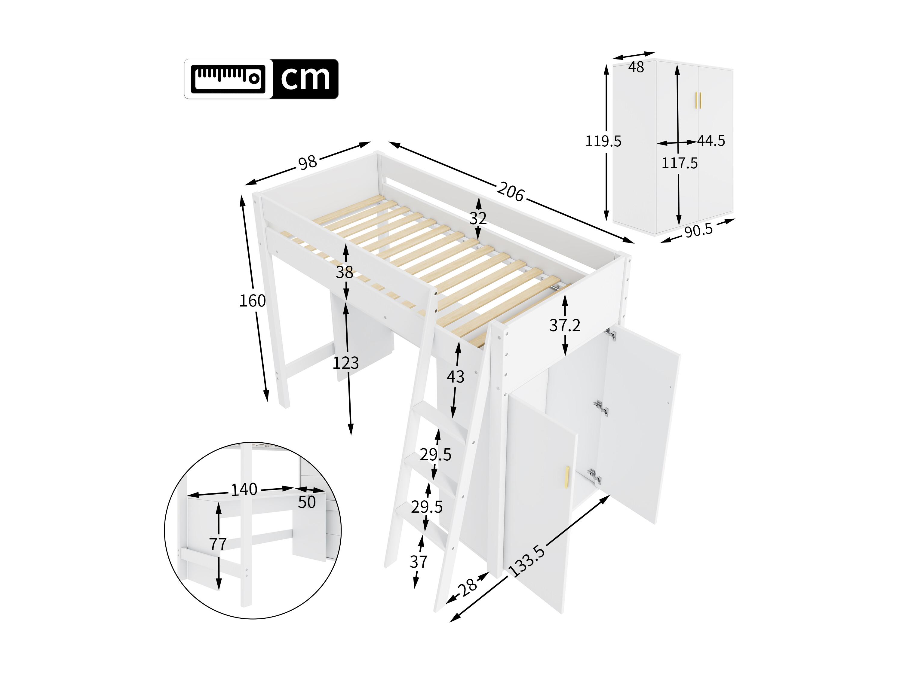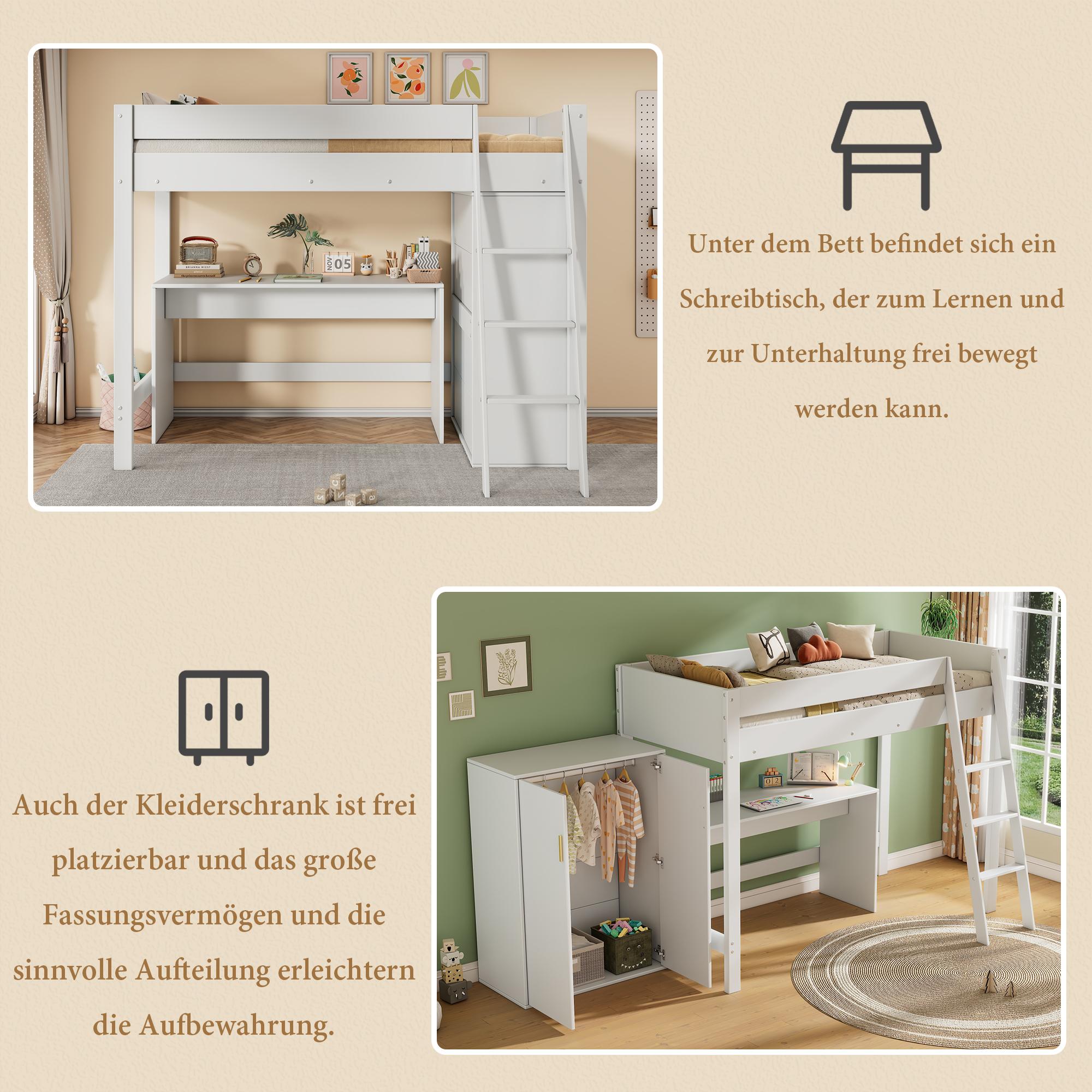 Letto a castello con armadio, scrivania e contenitore, legno massello, bianco (90x200 cm + 140x200 cm)