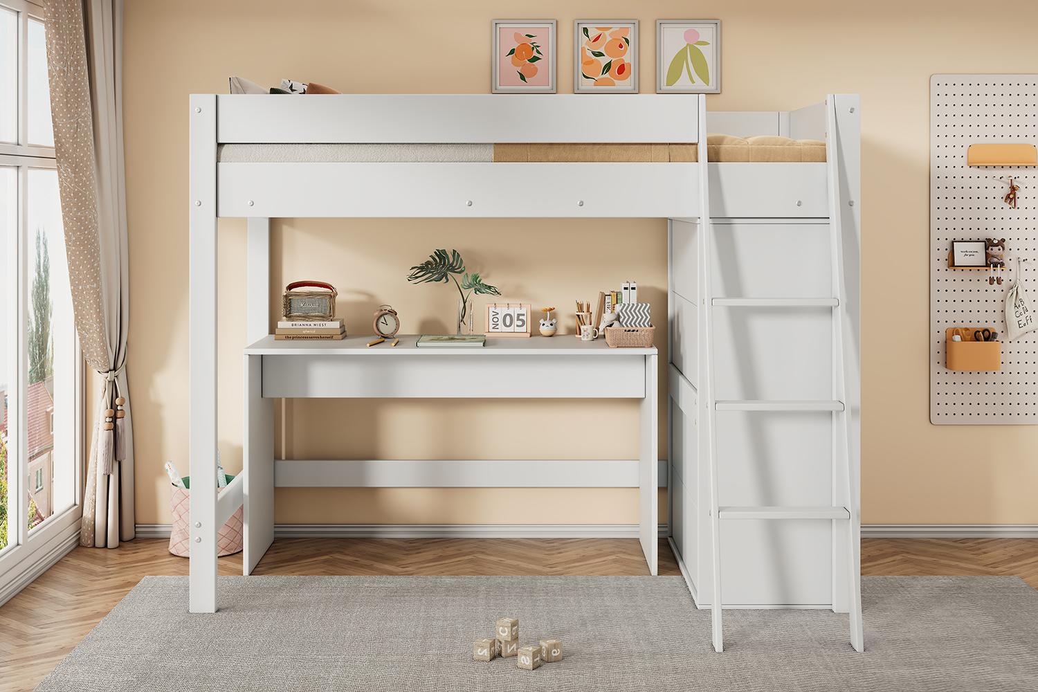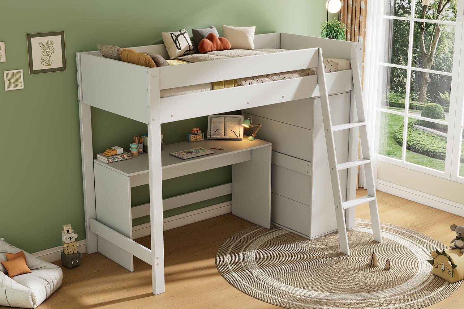 Letto a castello multifunzionale con tavolo e cassetti, in legno massello, bianco (90x200 cm + 140x200 cm)