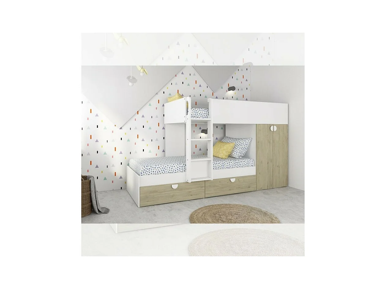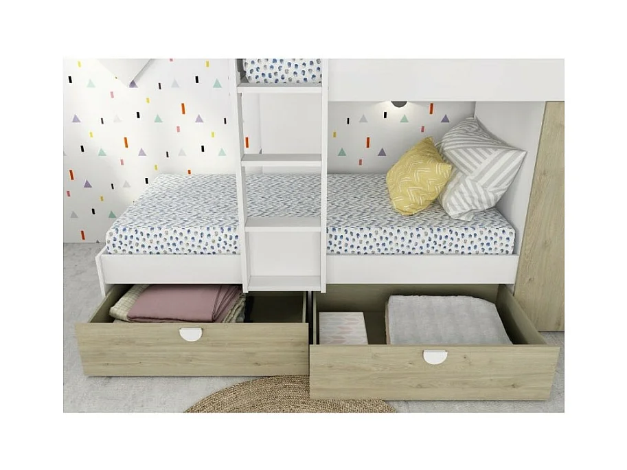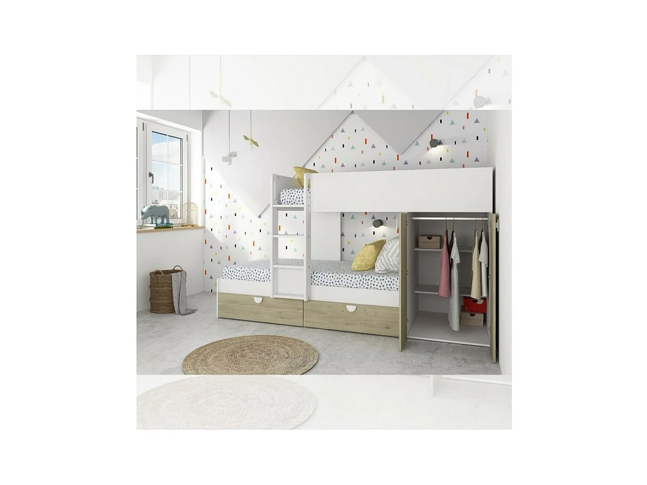 Letto a castello rovere e bianco con armadio 2 ante e cassetti