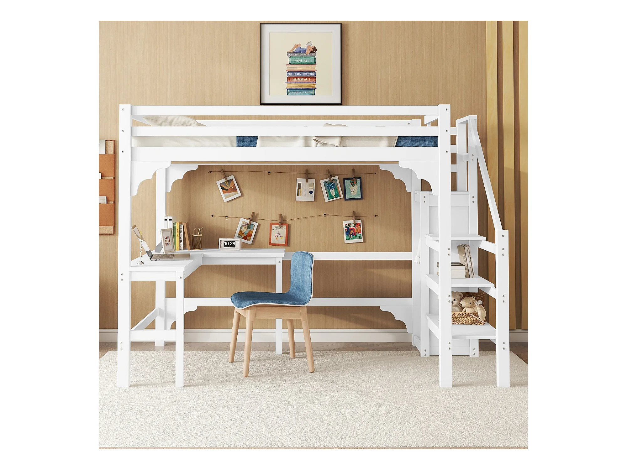 Letto a soppalco 140x200 cm in pino bianco – scrivania a L, armadio a giorno, design minimalista