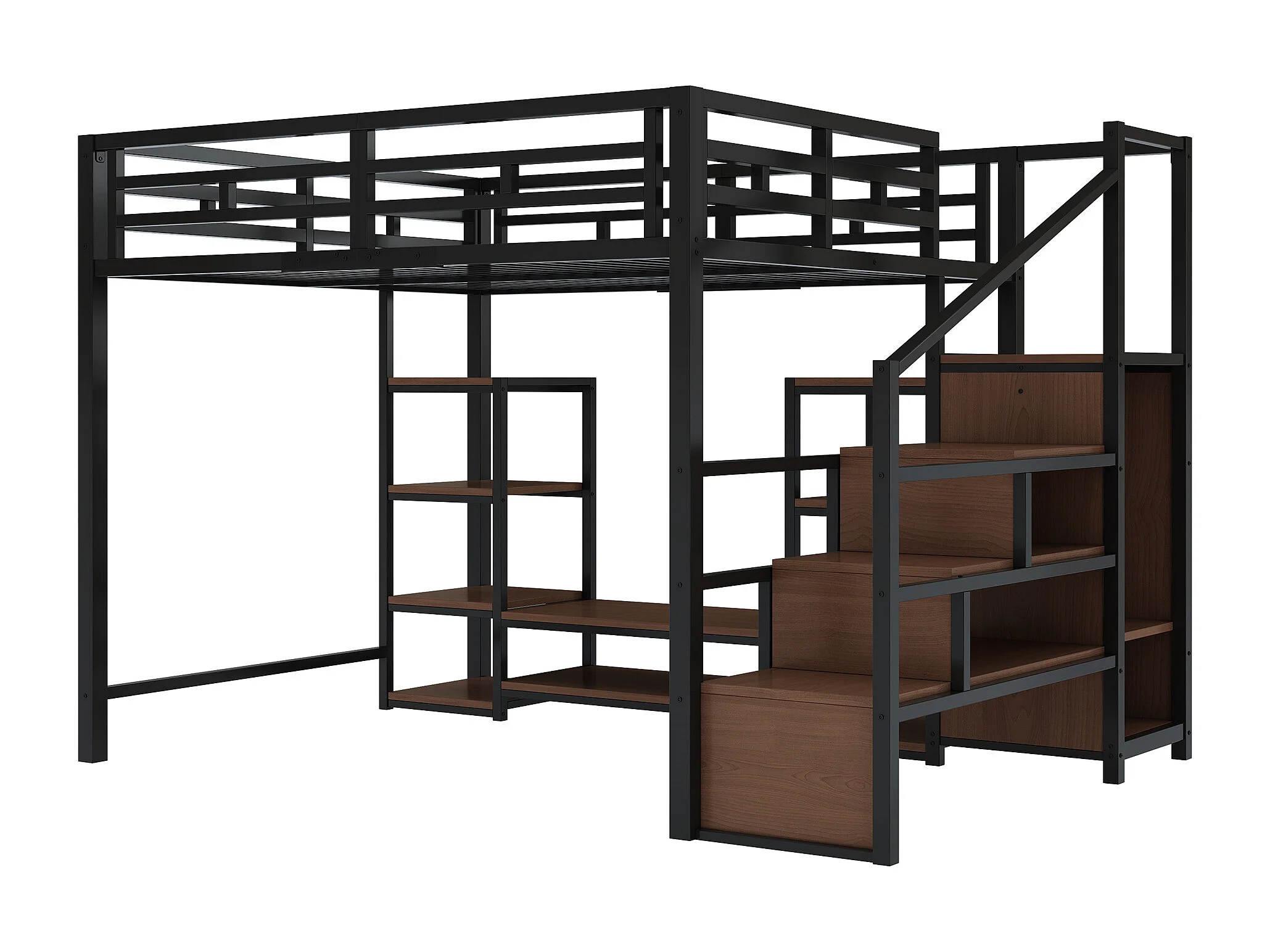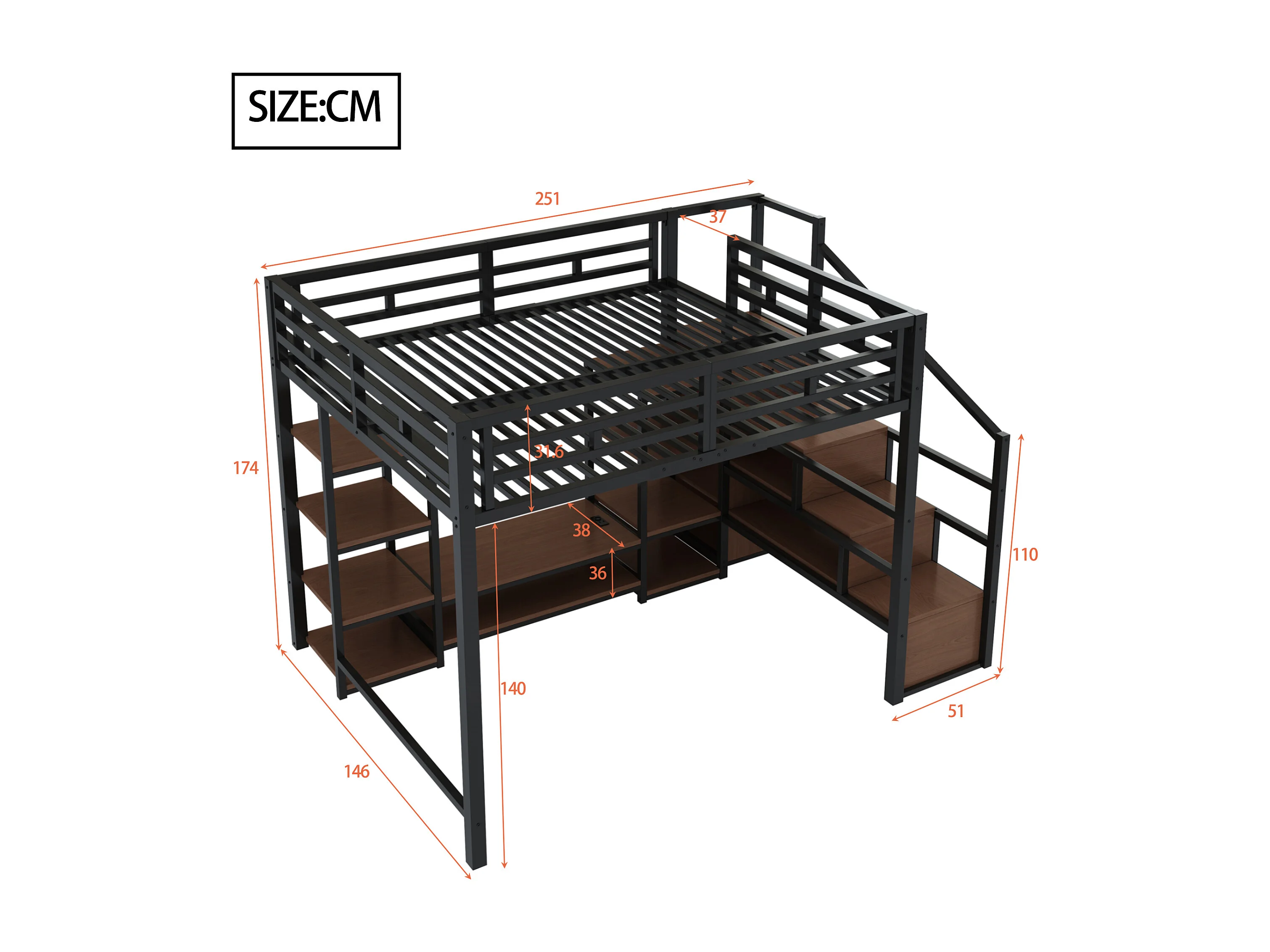 Letto a soppalco 140x200cm con presa elettrica, contenitore e scaletta - Metallo + MDF - Nero e legno scuro