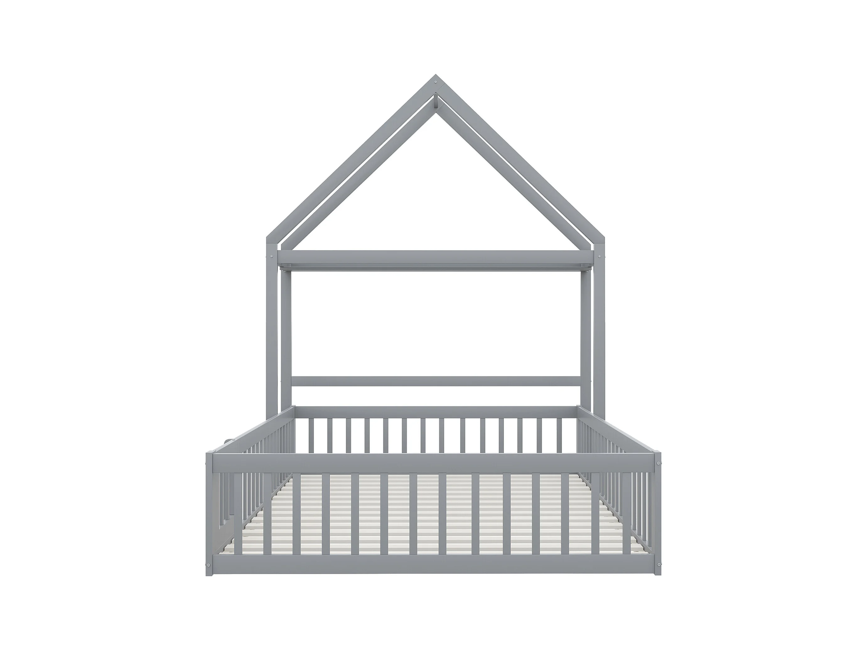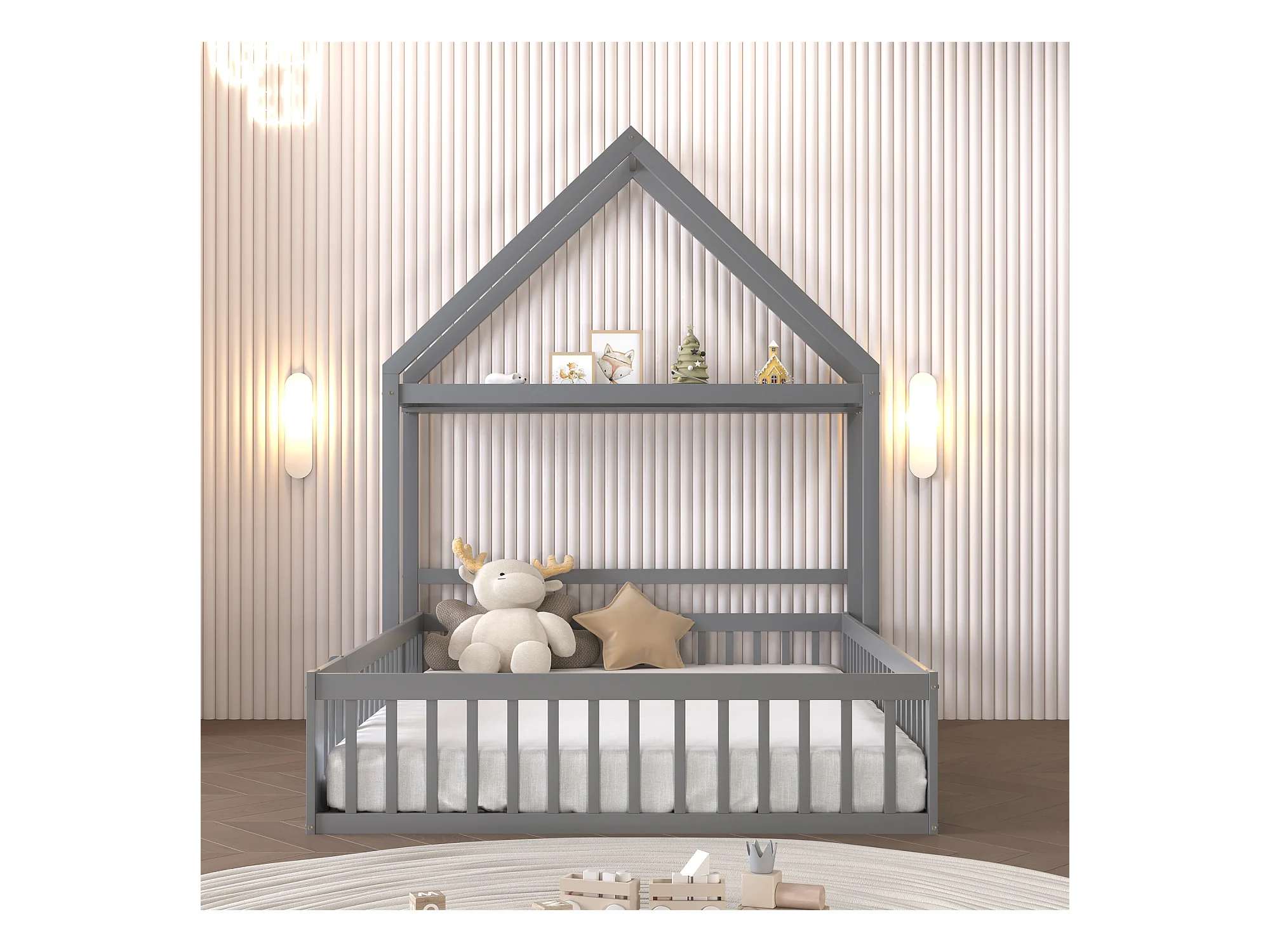 Letto per bambini 140x200 cm a casetta con scaffali portaoggetti, barriera di protezione, grigio, senza materasso