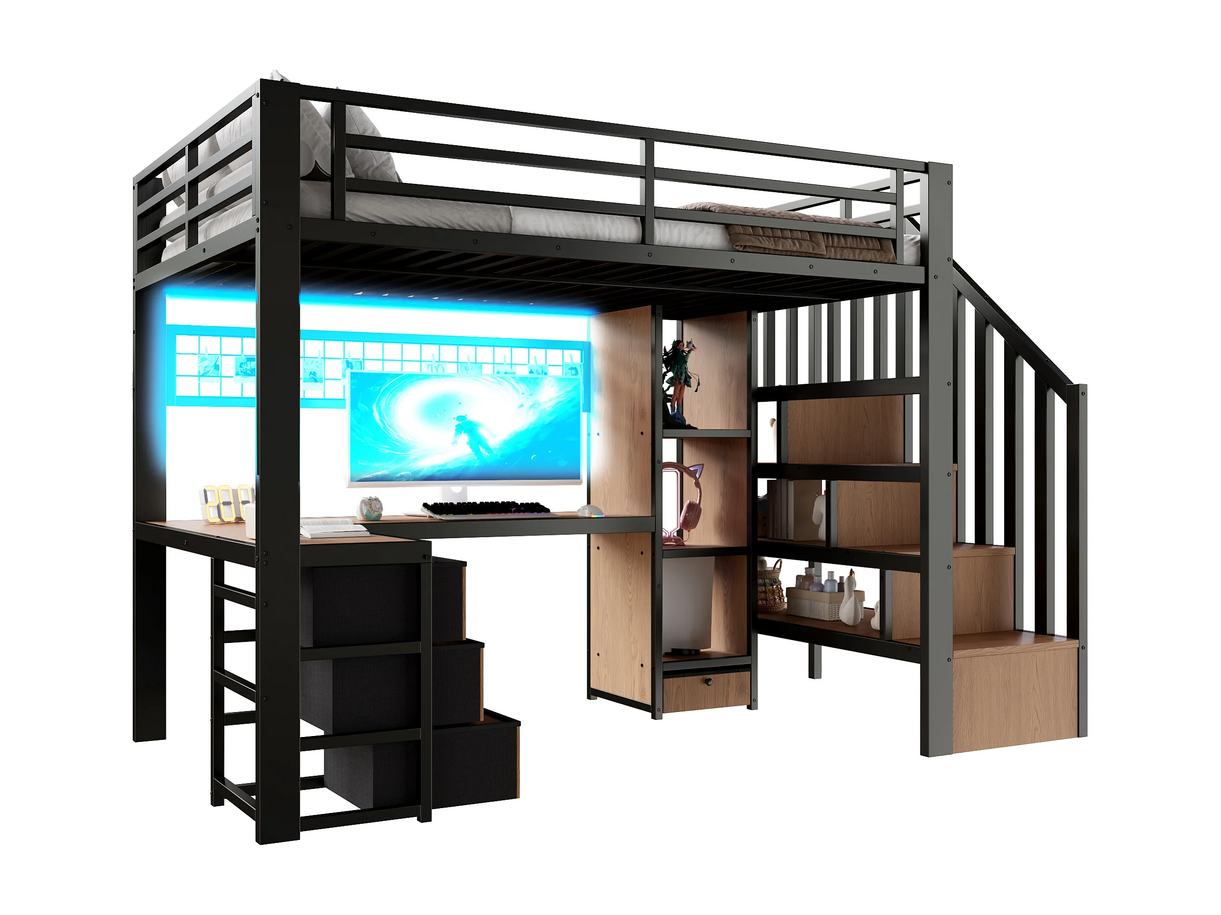 Letto a soppalco 90 x 200 cm con 4 cassetti, scrivania e illuminazione a LED - Metallo nero