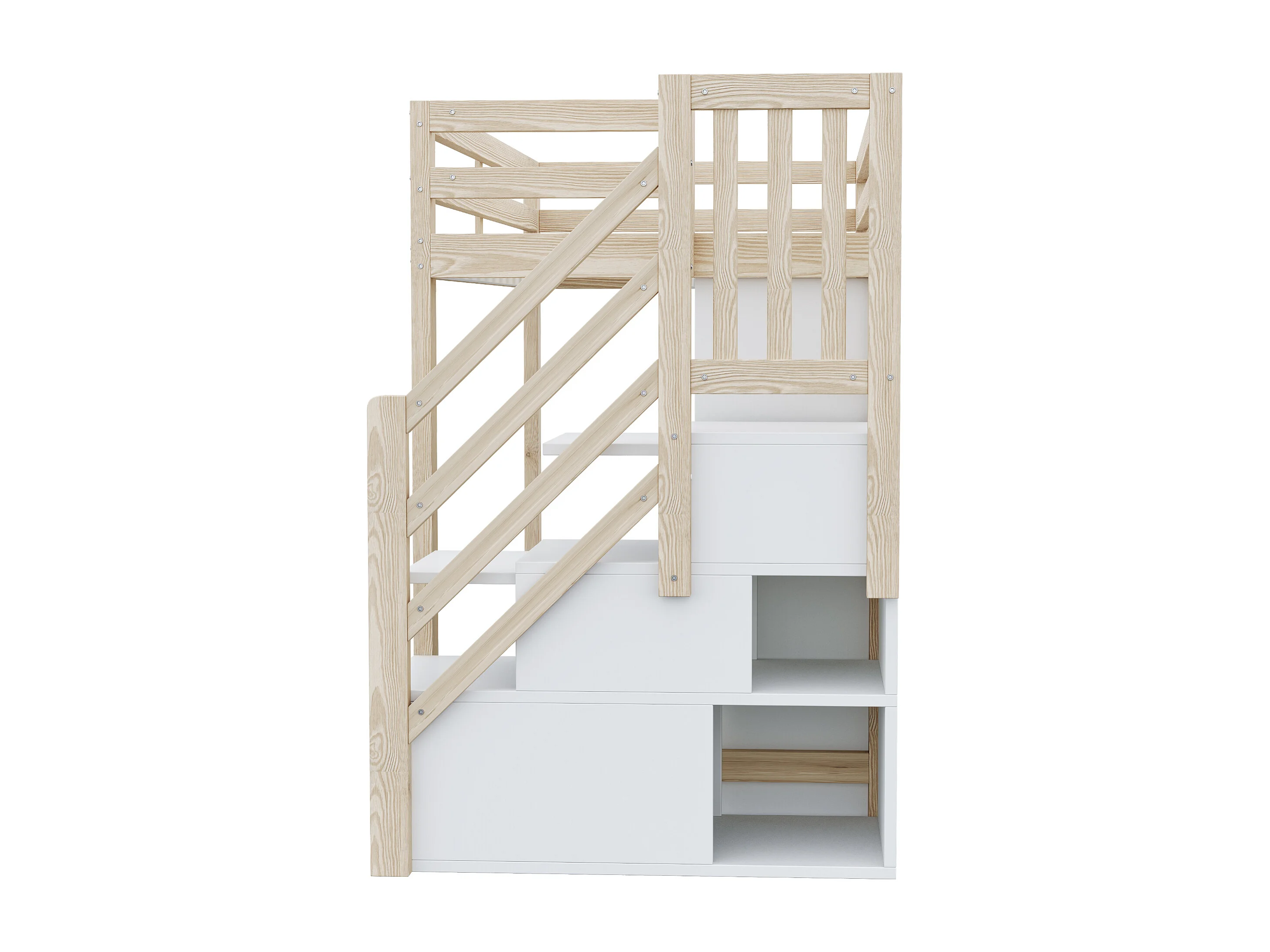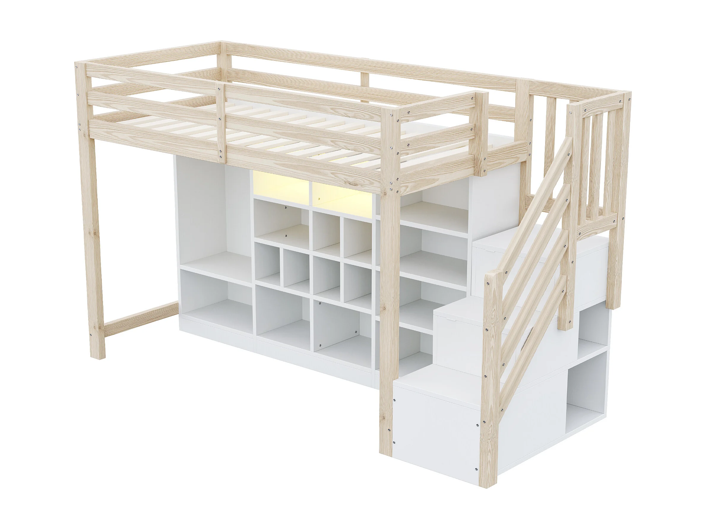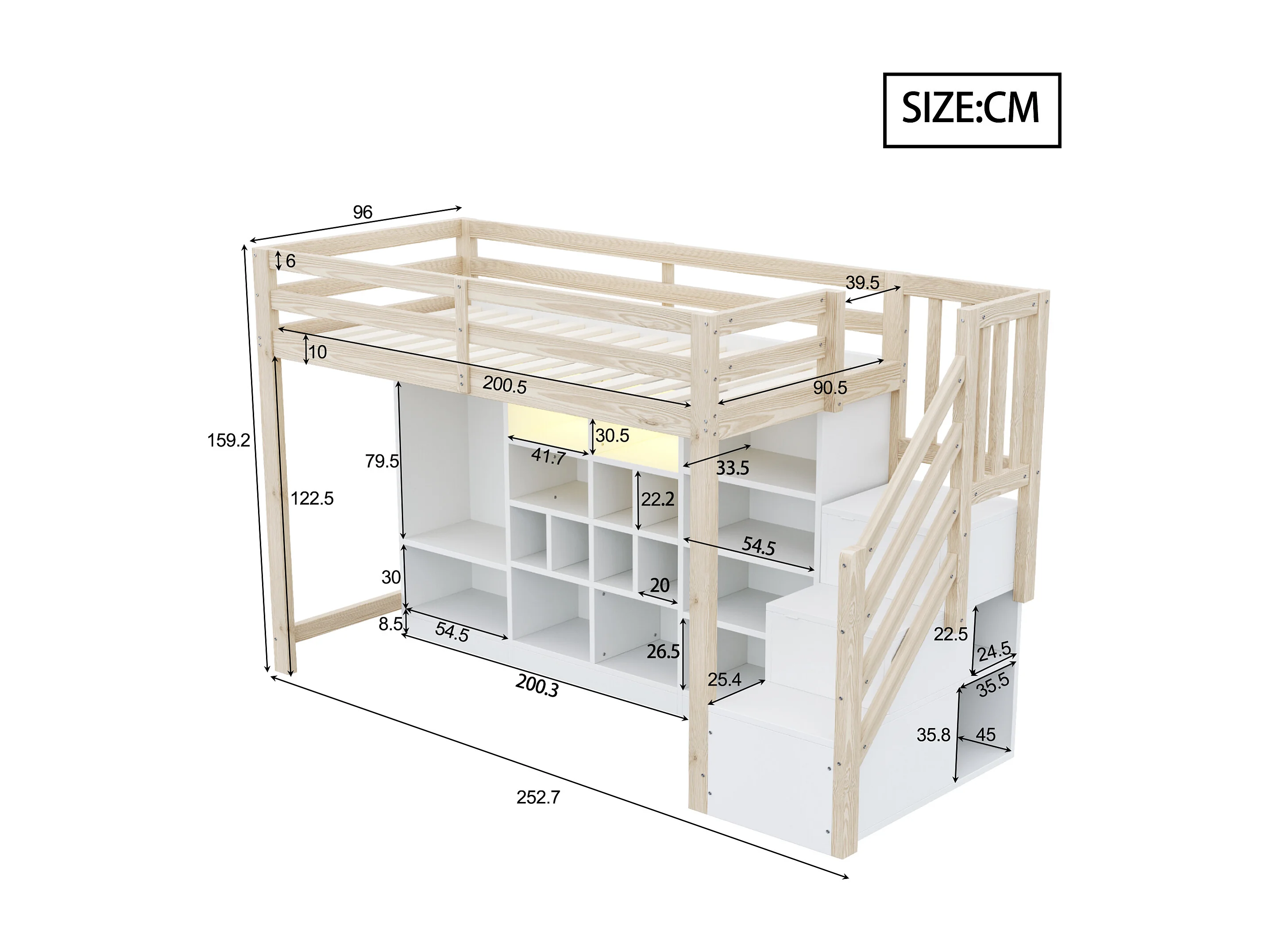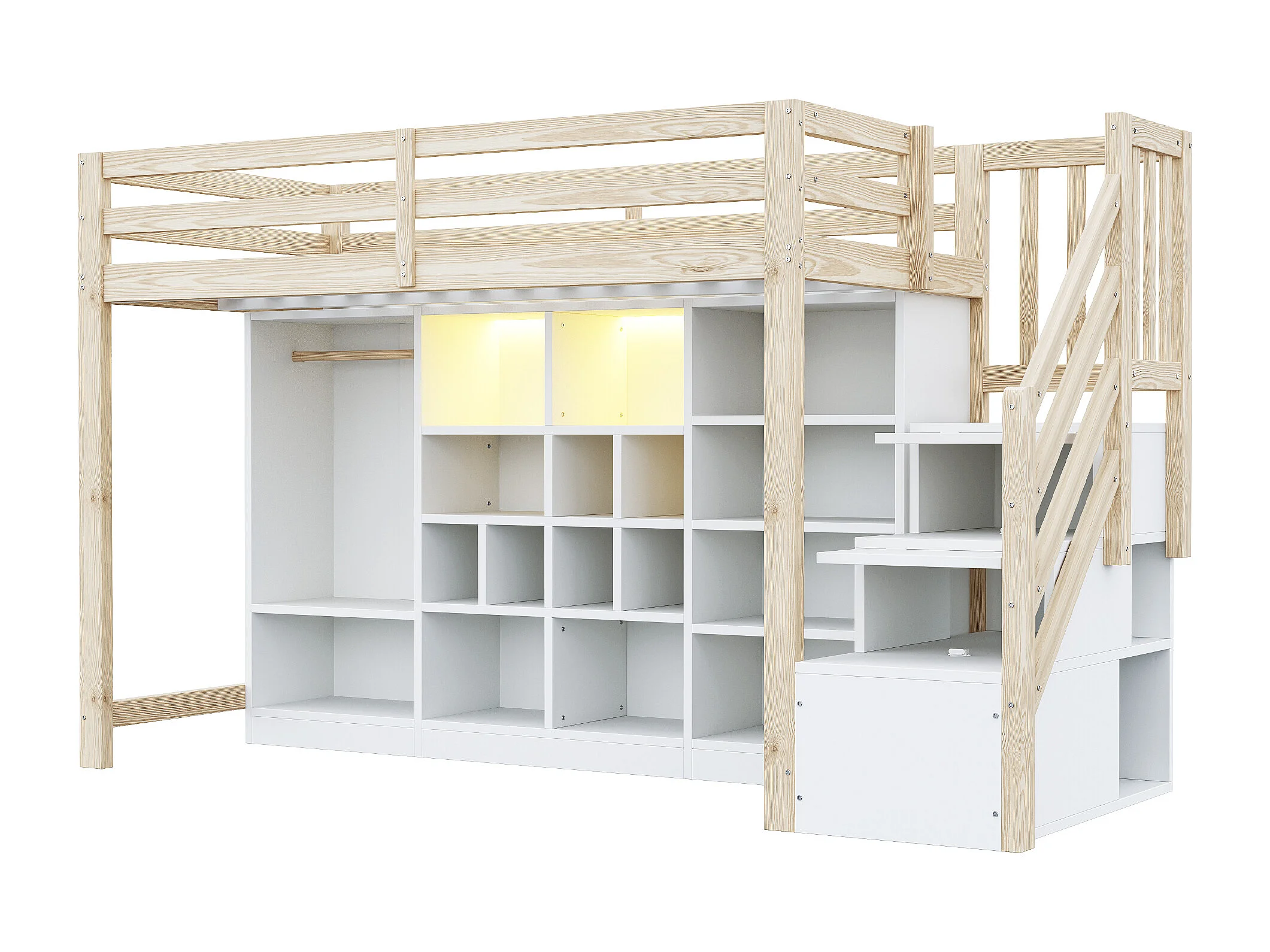 Letto a soppalco 90 x 200 cm con scomparti multipli e armadio, illuminazione a LED - Luce naturale e bianca