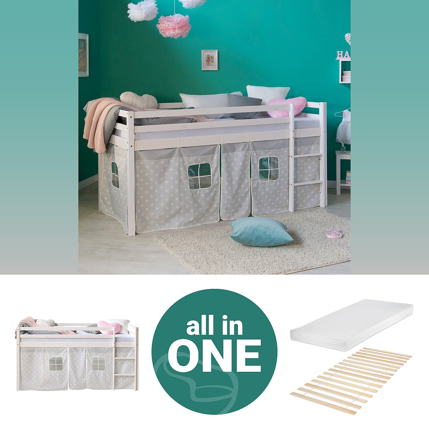 Letto a soppalco 90x200 cm Grigio Legno di pino massiccio Tenda Stelle