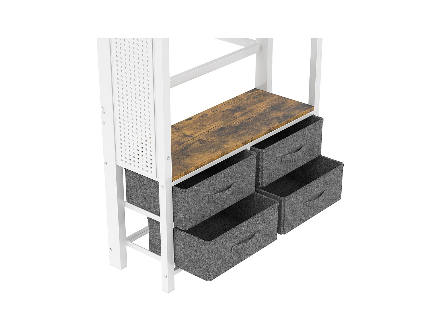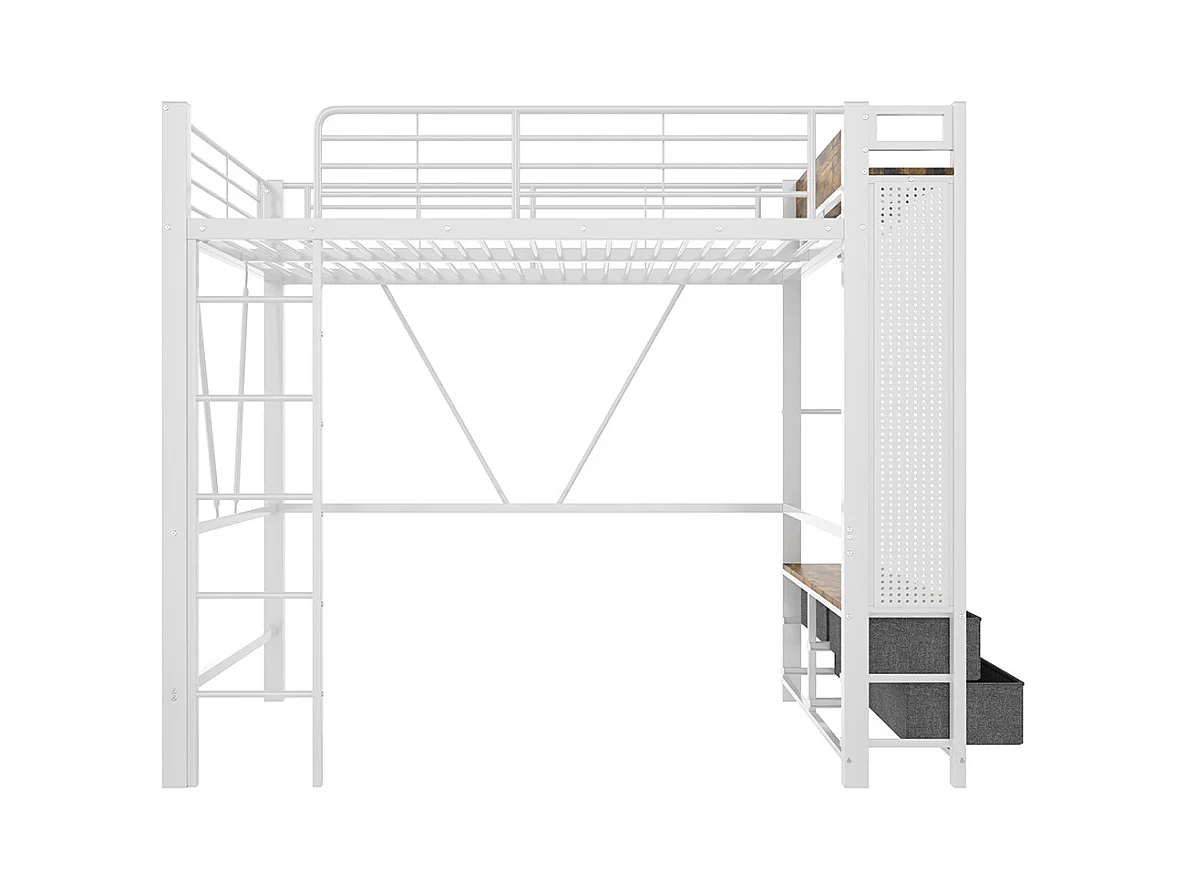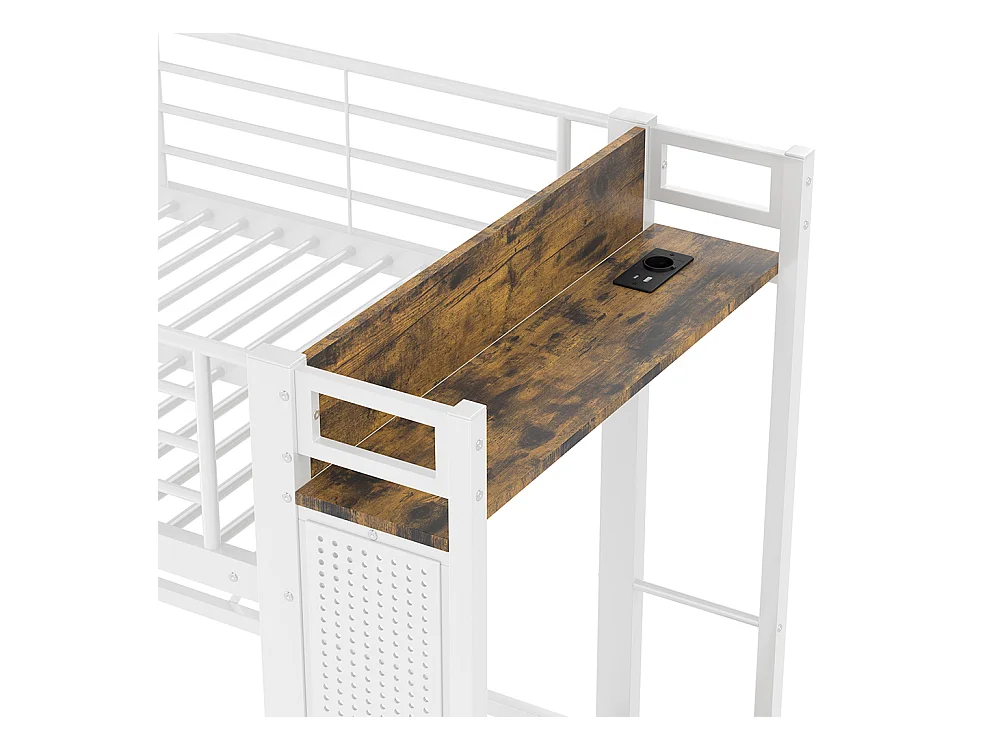 Letto a soppalco 90x200 cm con struttura in ferro barra asciugatrice ripiani 4 cassetti presa USB+TYPE-C striscia LED ringhiera scala asse forata bianco