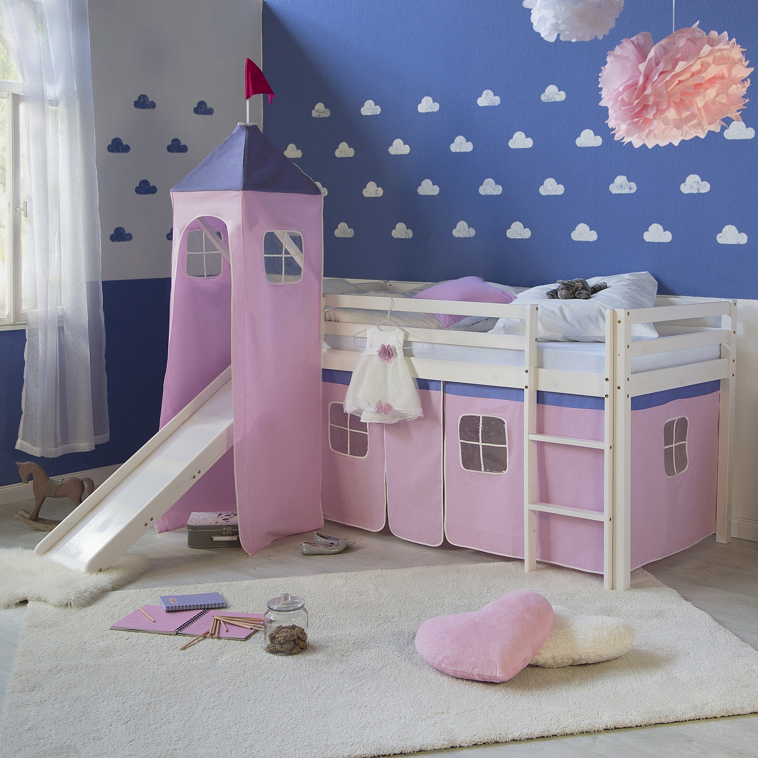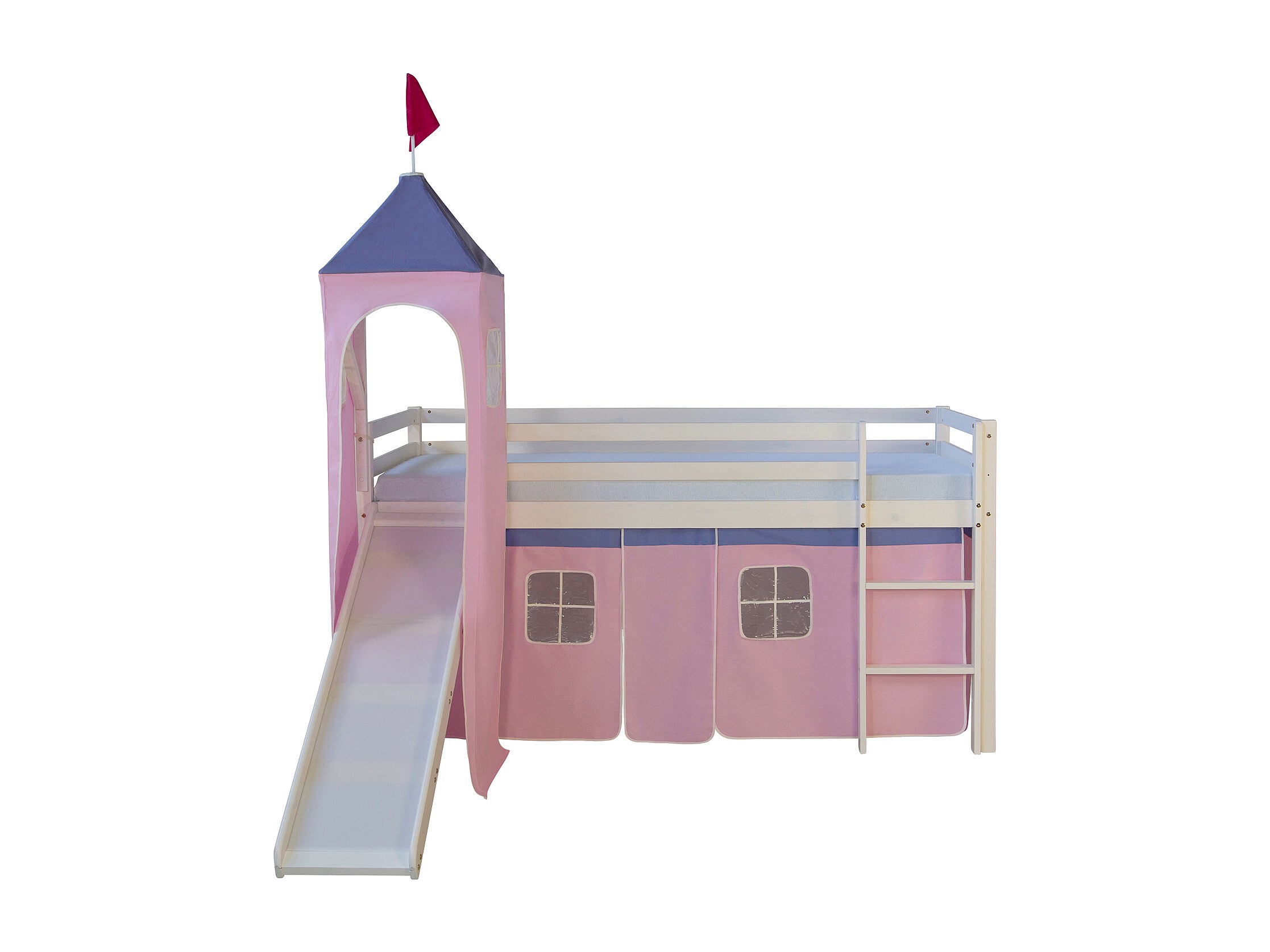 Letto a soppalco con scivolo 90x200 cm Torre rosa doghe Letto a castello