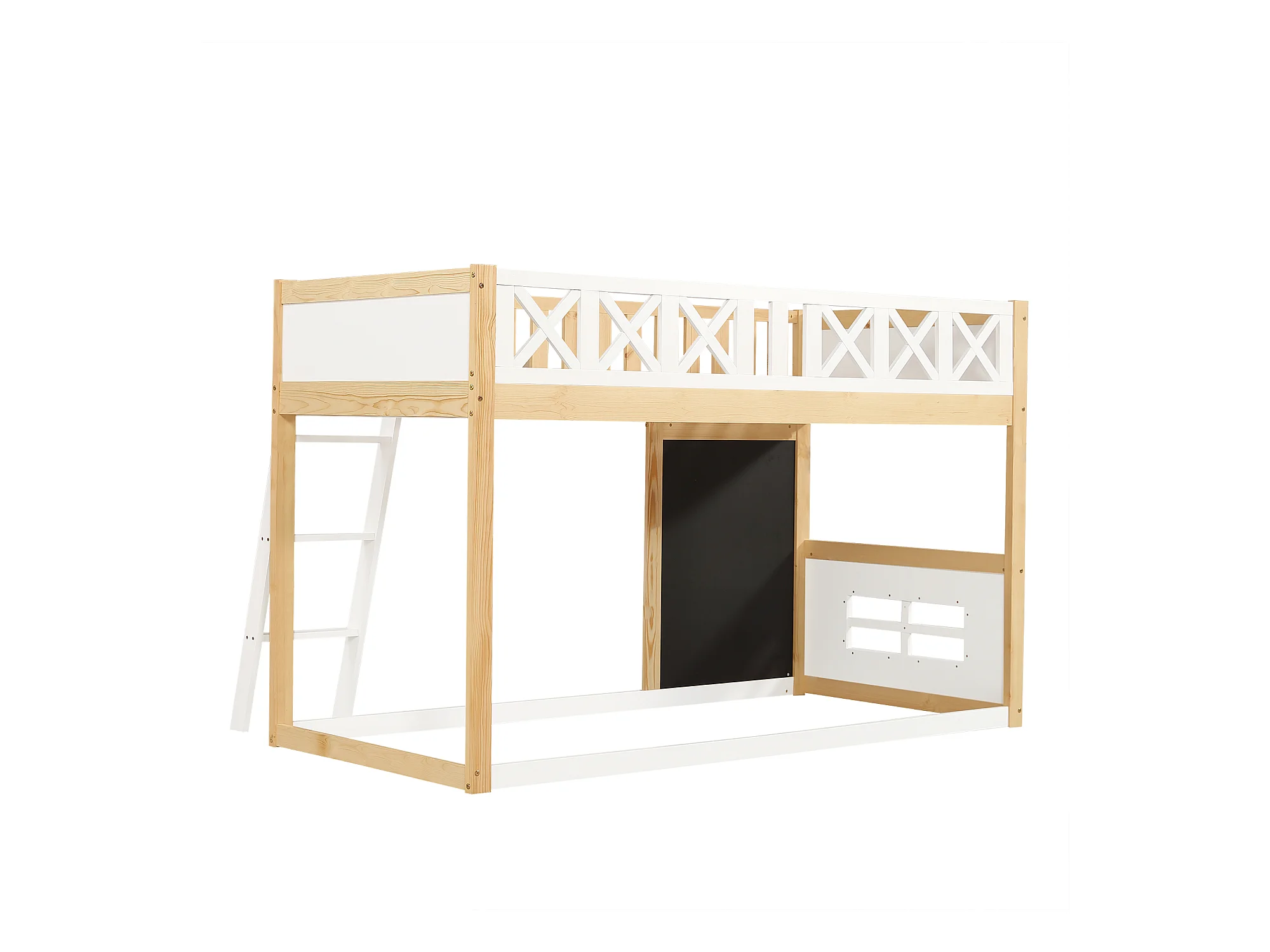 Letto a soppalco 90x200cm con lavagna e sponda di sicurezza, colore bianco + naturale, pino + MDF