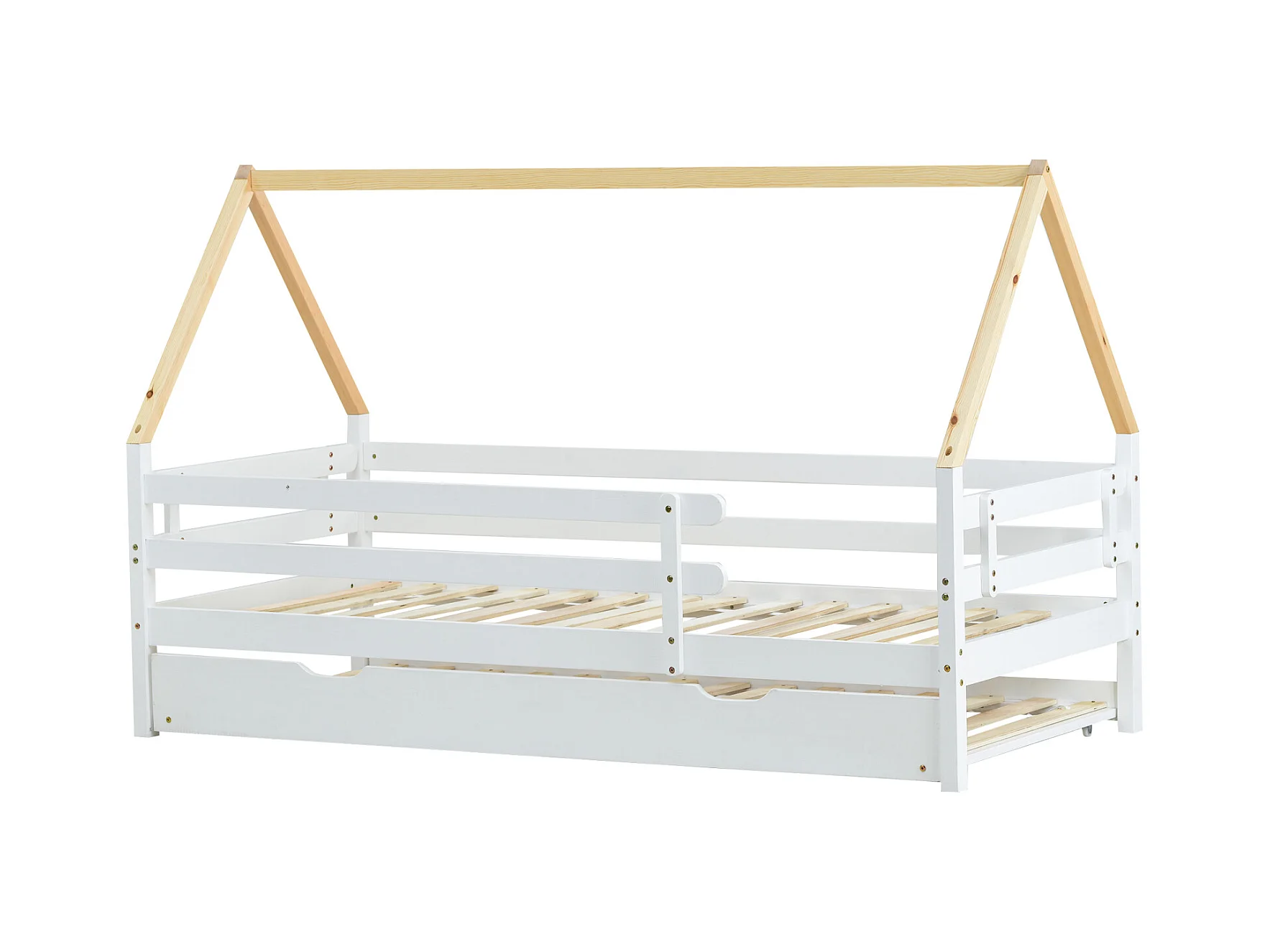 Letto a castello 90x200cm, letto per bambini piatto a forma di casa con rete a doghe, in pino massiccio, bianco