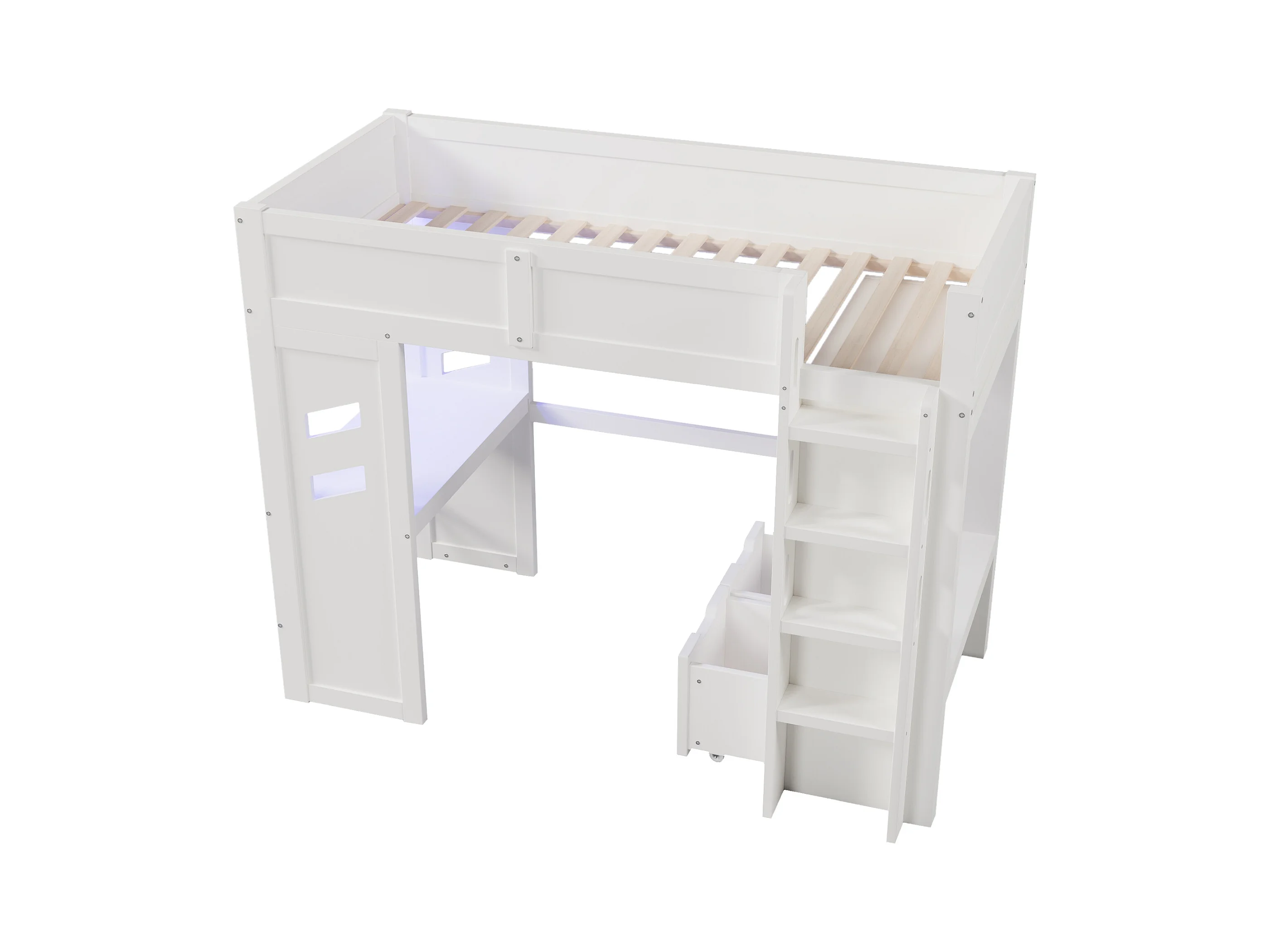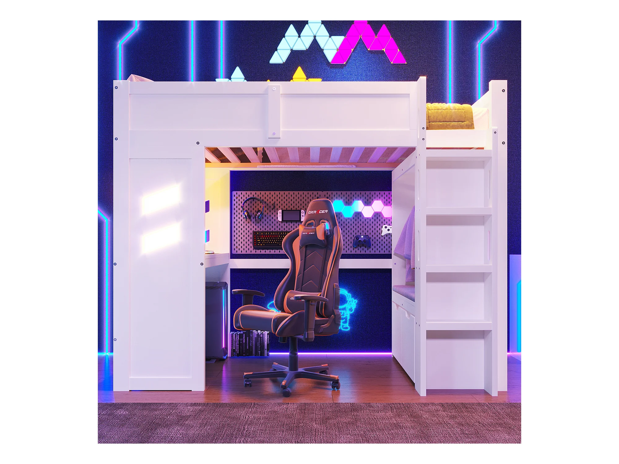 Letto a soppalco bianco 90x200cm con scrivania, 2 cassetti, illuminazione LED, USB e Type-C, stendibiancheria, pino + MDF