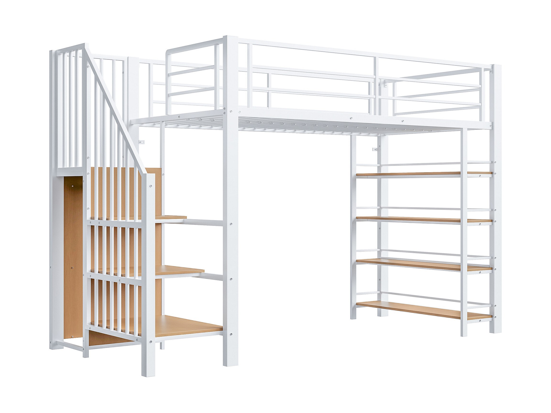 Letto a soppalco bianco e legno 90x200cm con scaletta di sicurezza, piccolo armadio, ripiani e barriera (senza materasso)