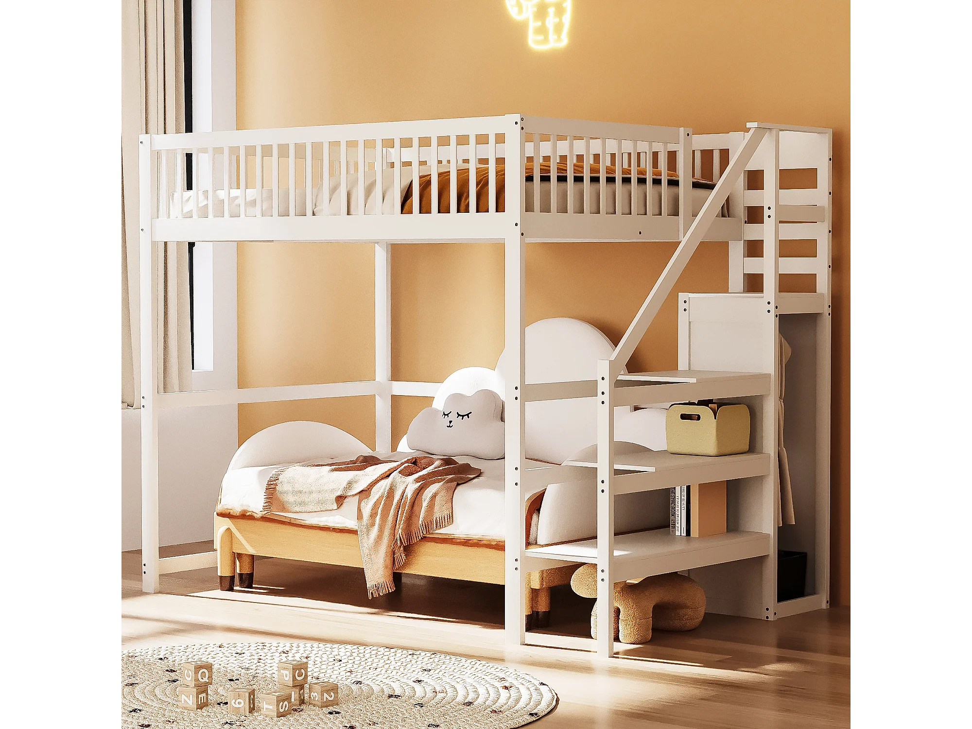 Letto a soppalco con scaletta e contenitore, legno massello, bianco, 140x200 cm (245x145x179,7cm)