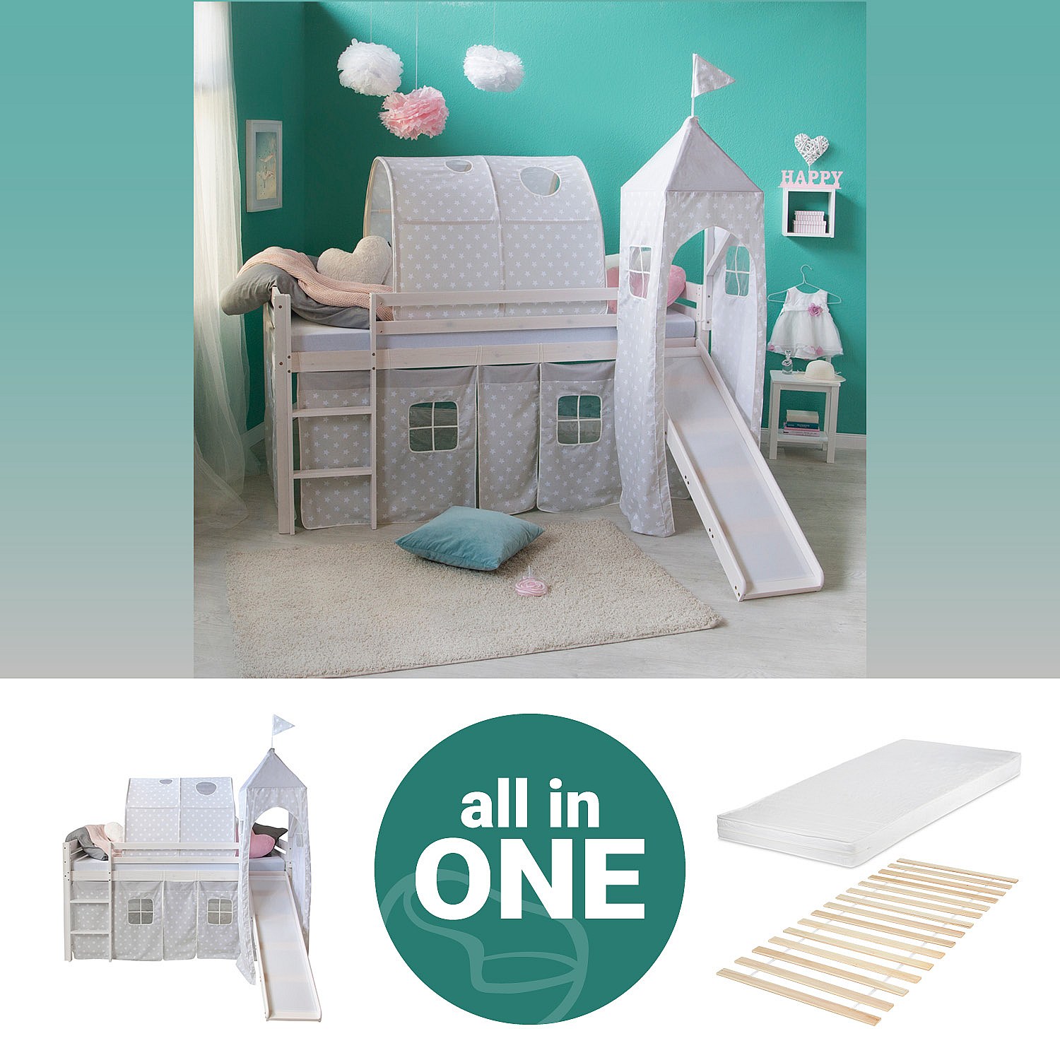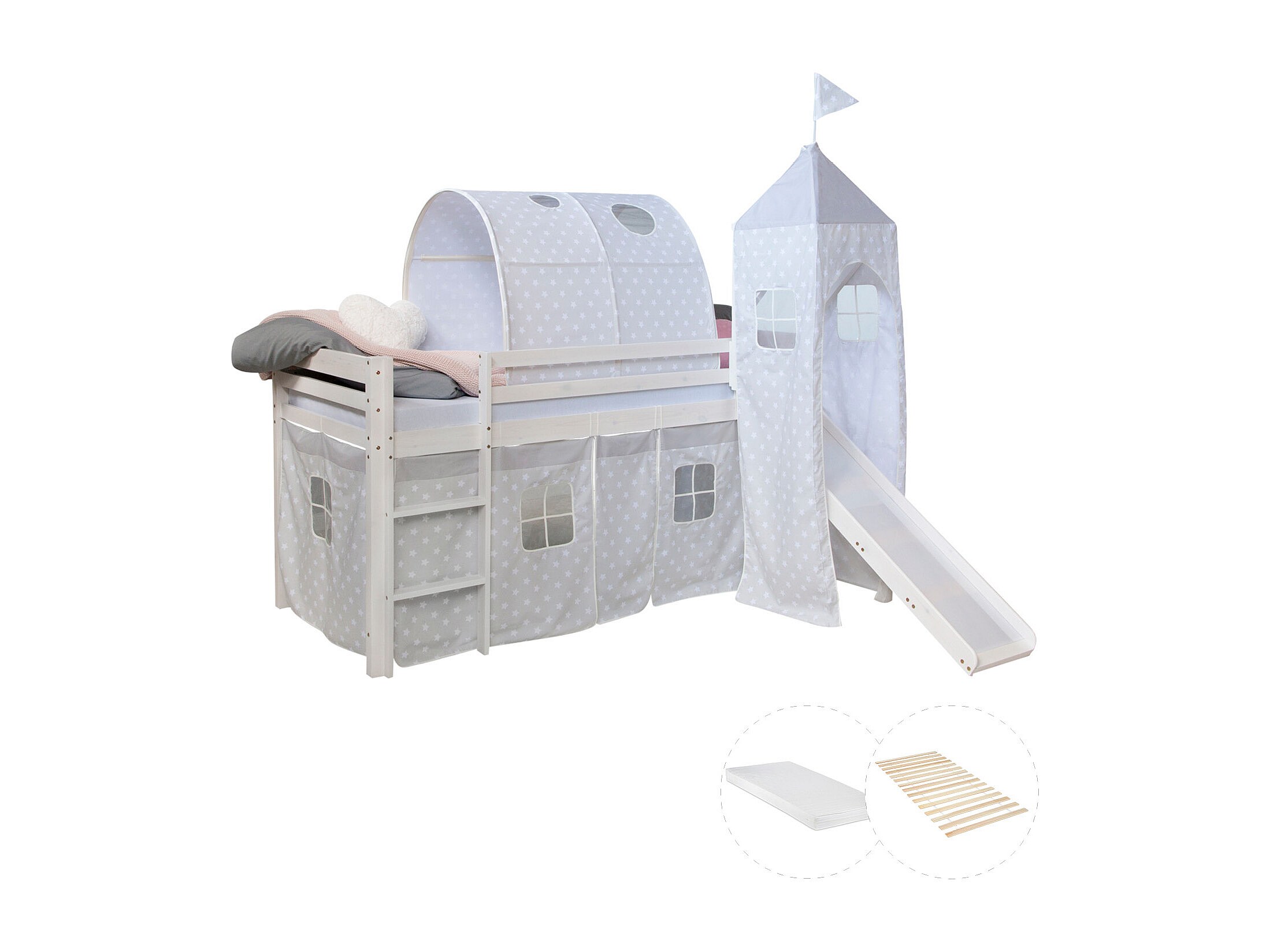 Letto a soppalco 207,5x110x219,5 cm Grigio con scivolo, legno massello di pino, tenda stelle, doghe
