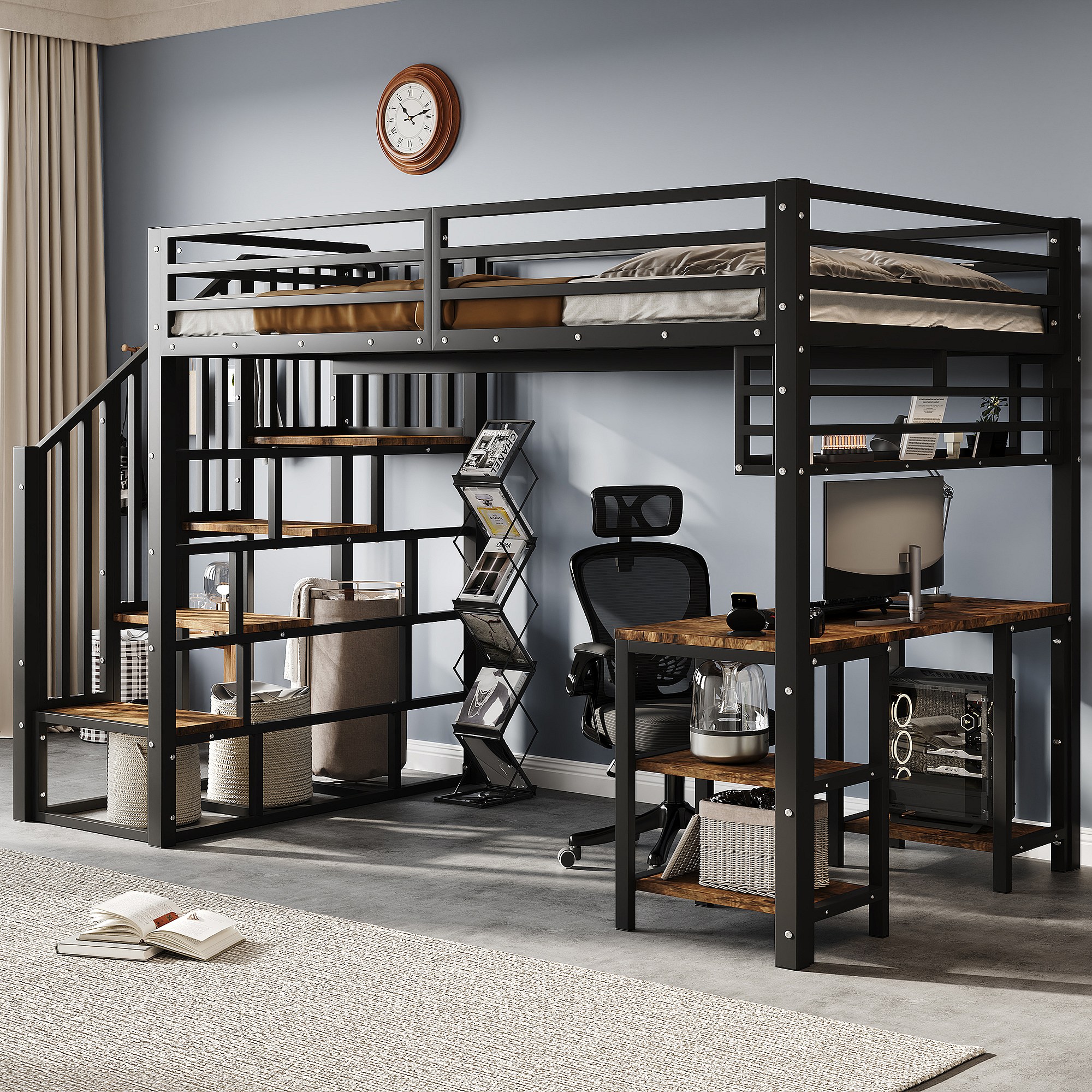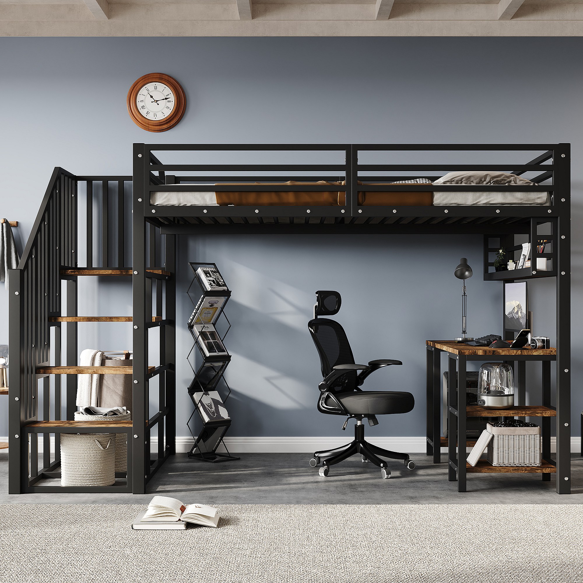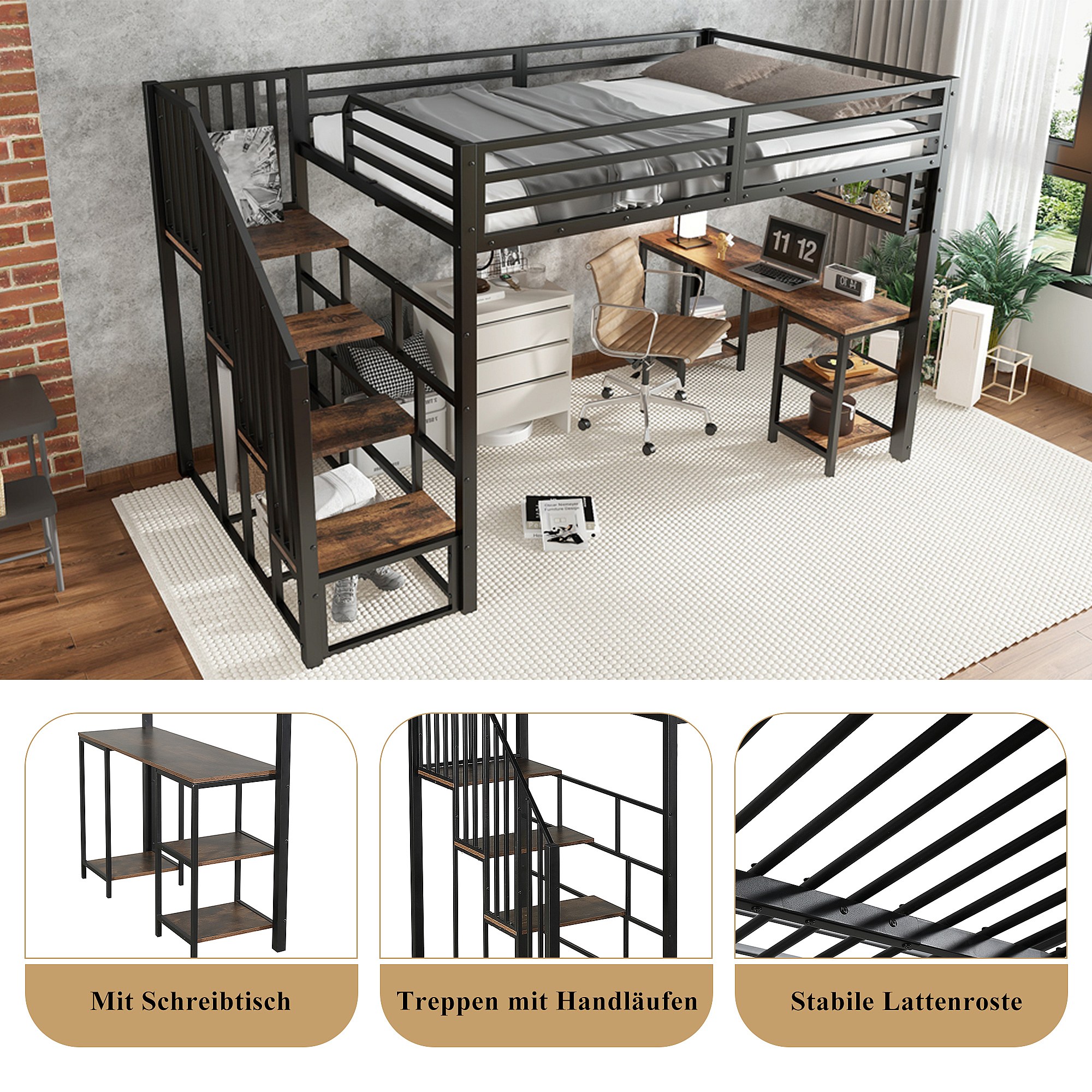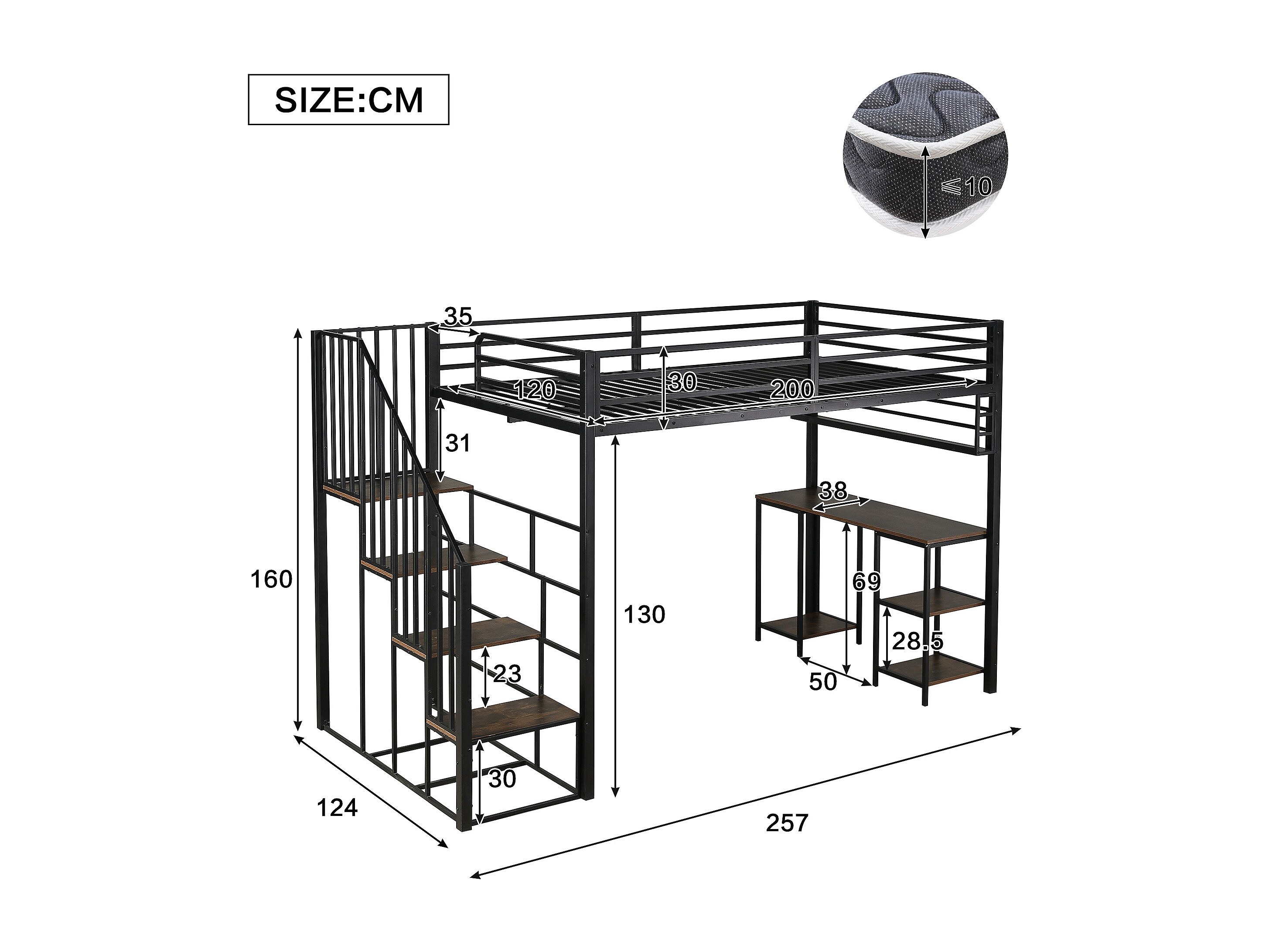 Letto a soppalco in ferro - 120 x 200 cm - con scaletta contenitore + scrivania e ripiano - ferro + truciolato - nero