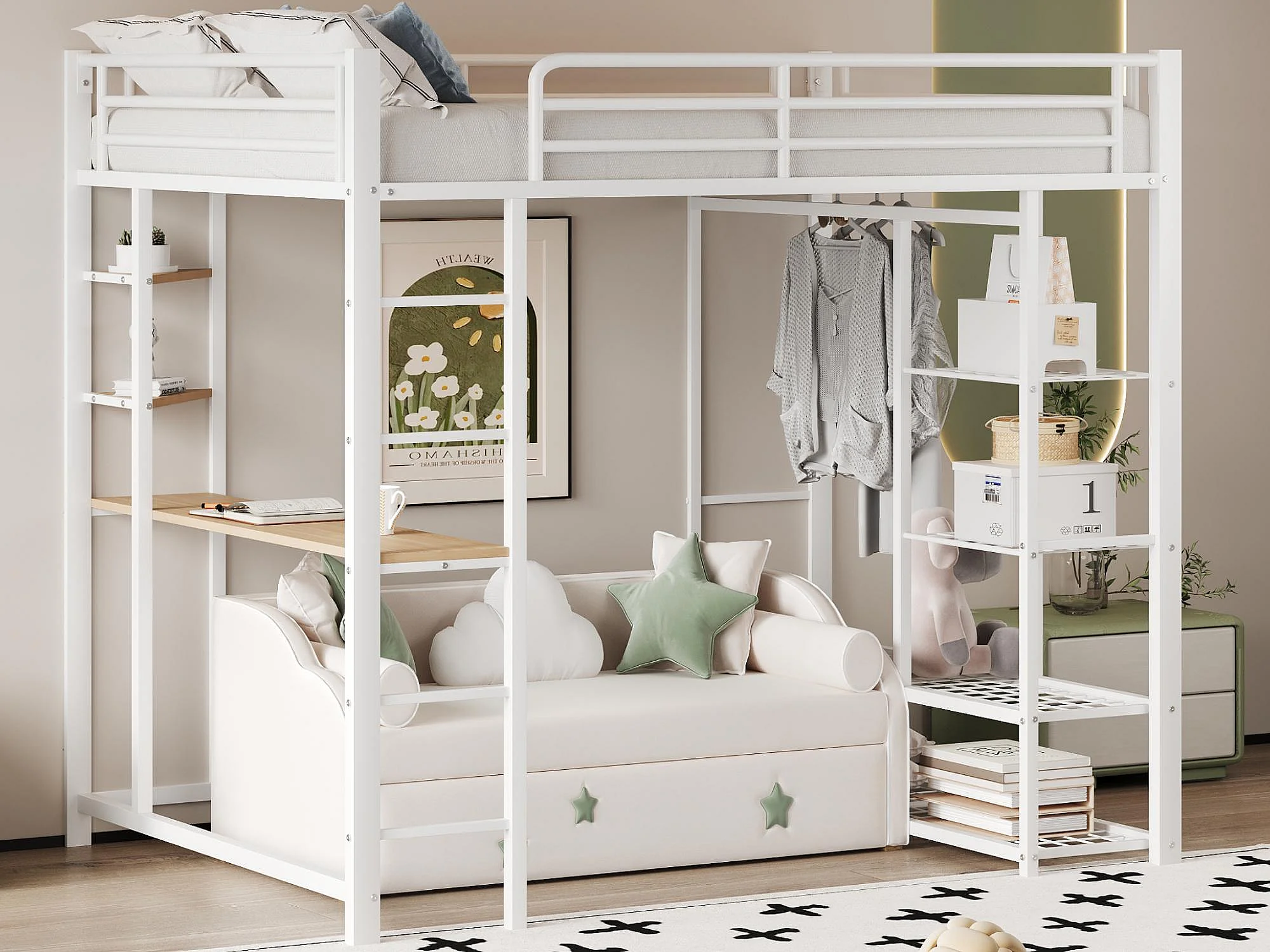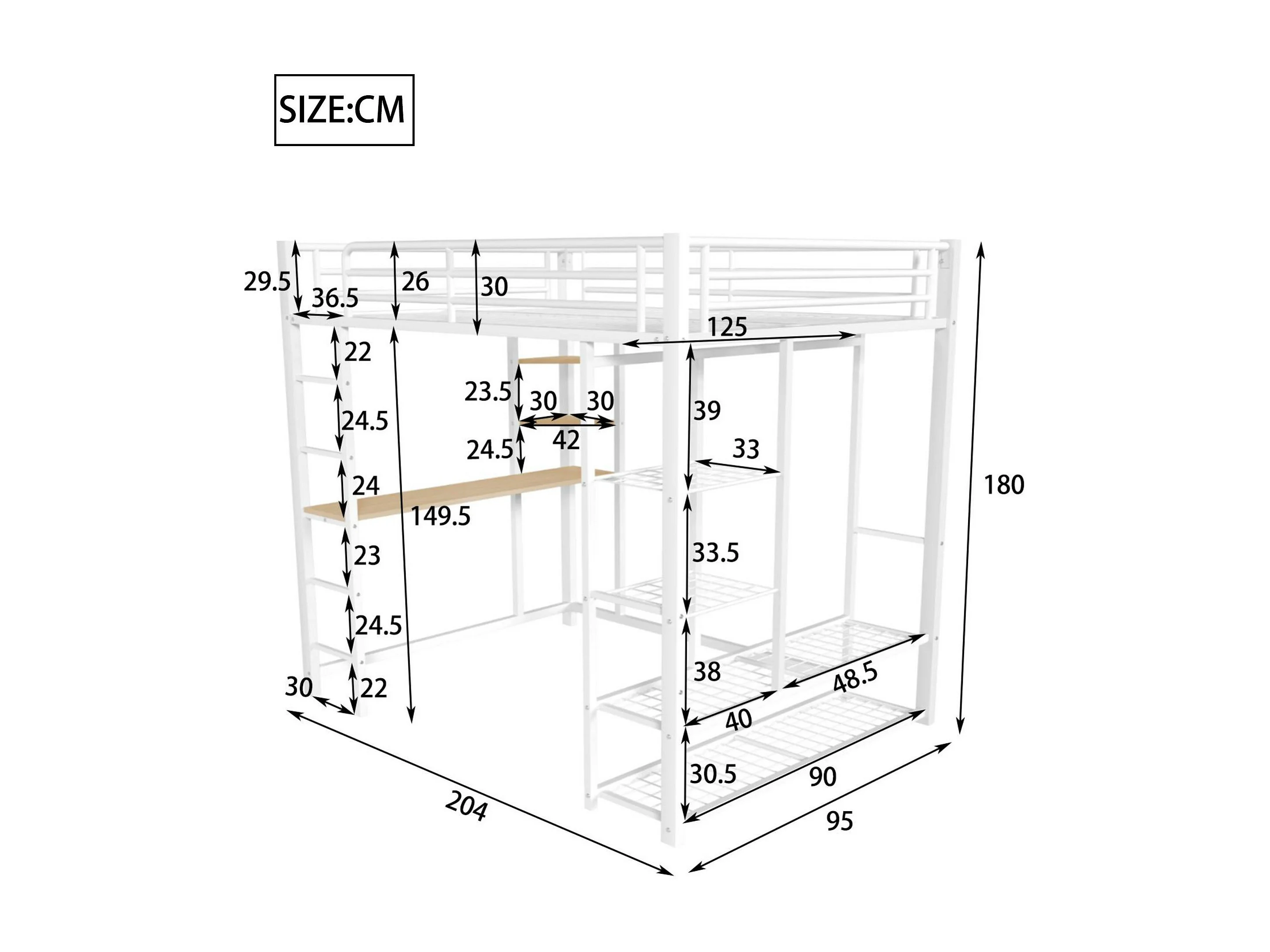 Questo letto a soppalco semplice combina funzioni di riposo, lavoro e archiviazione per sfruttare al meglio lo spazio della stanza. Inoltre, la finitura metallica minimalista completerà lo stile di qualsiasi stanza, dando un tocco moderno e luminoso.