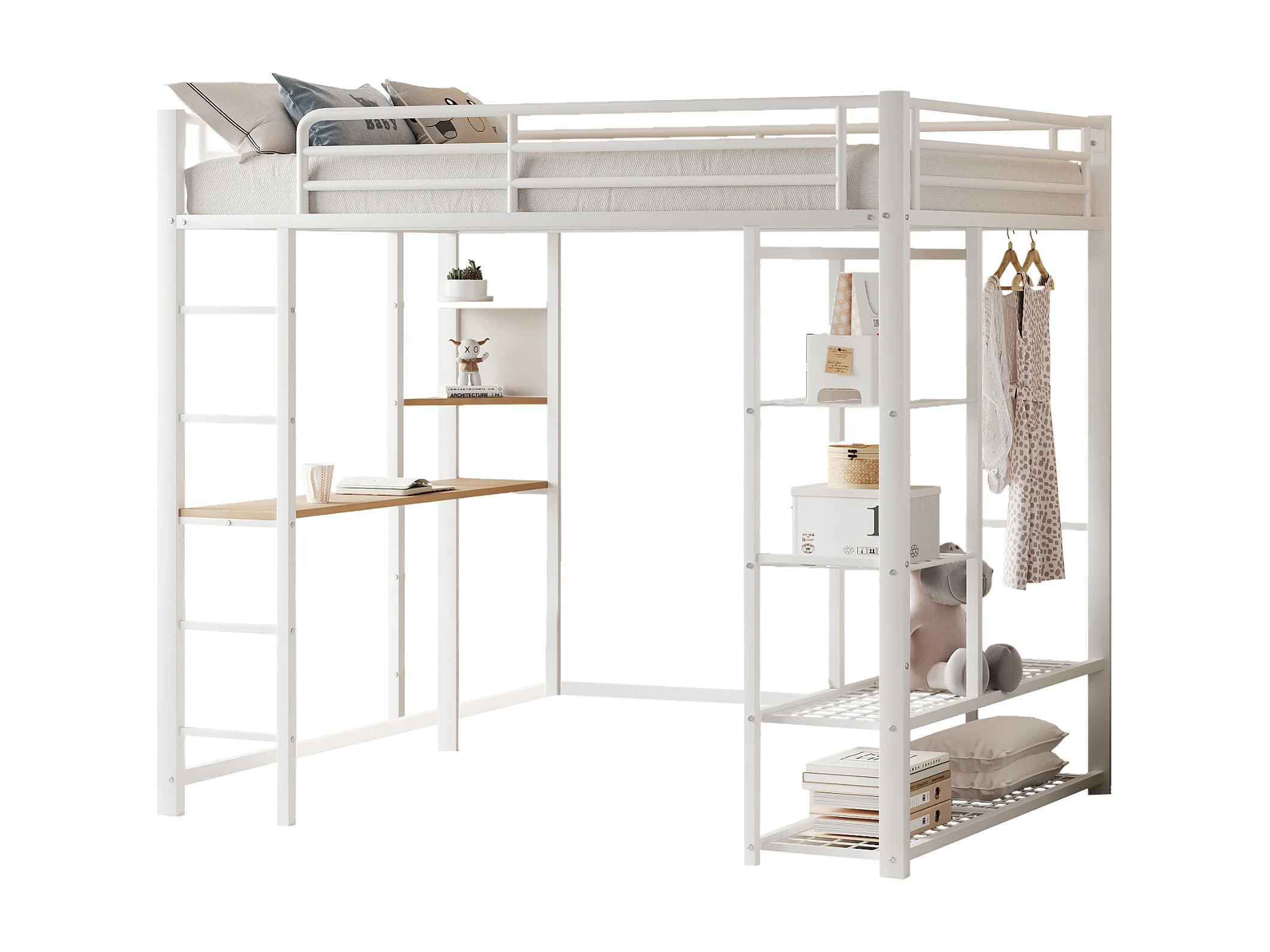 Questo letto a soppalco in metallo è dotato di un tavolo e di uno scaffale in legno per studiare, fare lavori manuali o giocare.