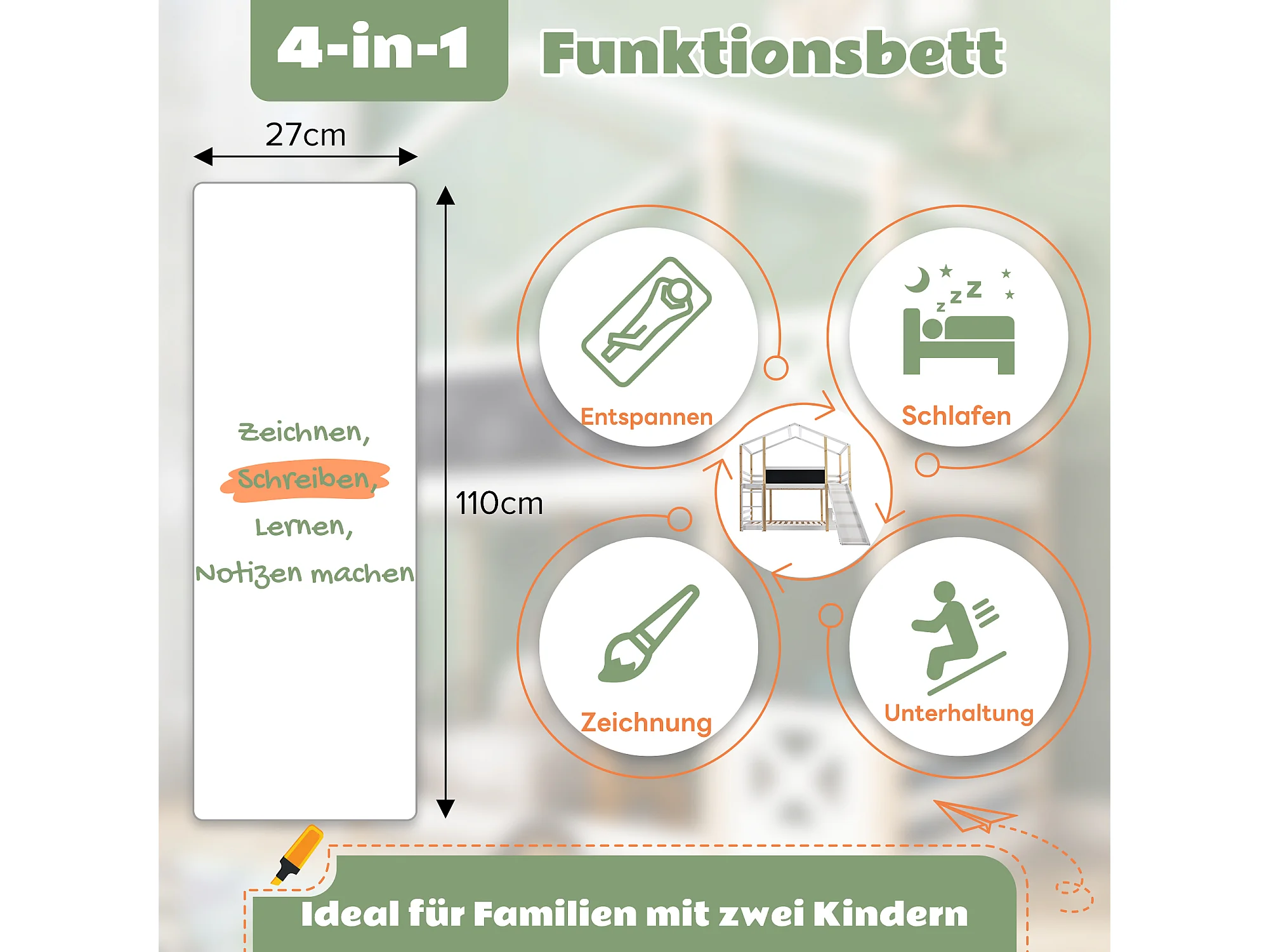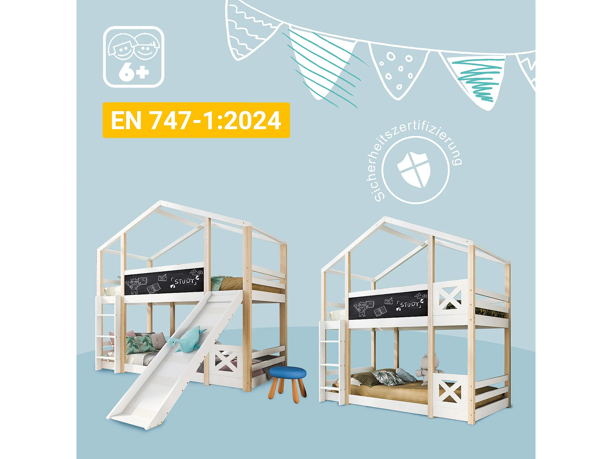 Letto a soppalco per bambini 90x200 cm con scivolo e scaletta di sicurezza, design del tetto, contenitore multifunzionale, legno massello, bianco (208x219x219cm)