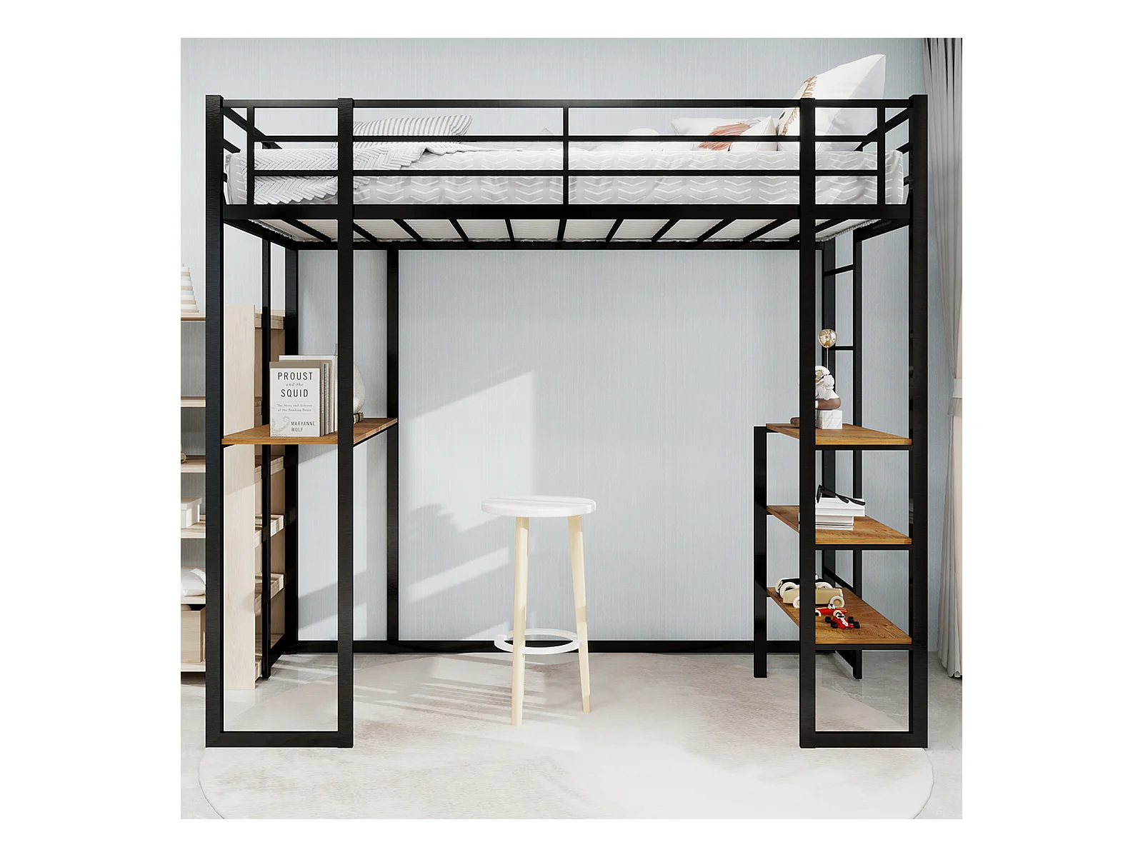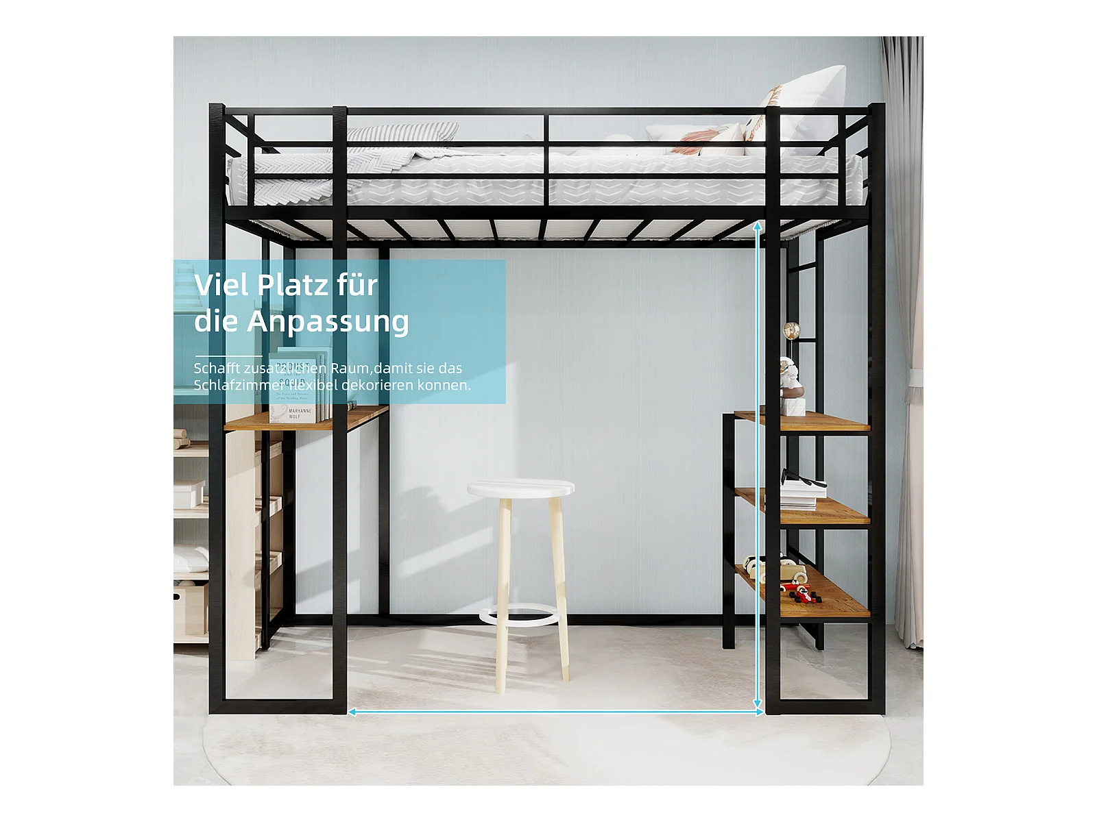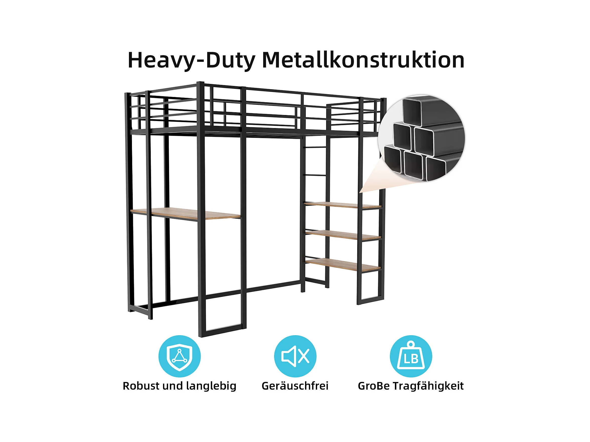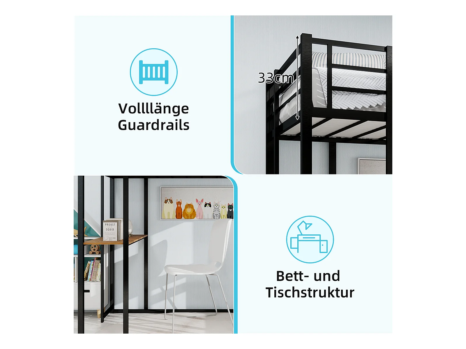 Letto a soppalco nero 90x190cm con scrivania e ripiano, metallo + legno, senza materasso