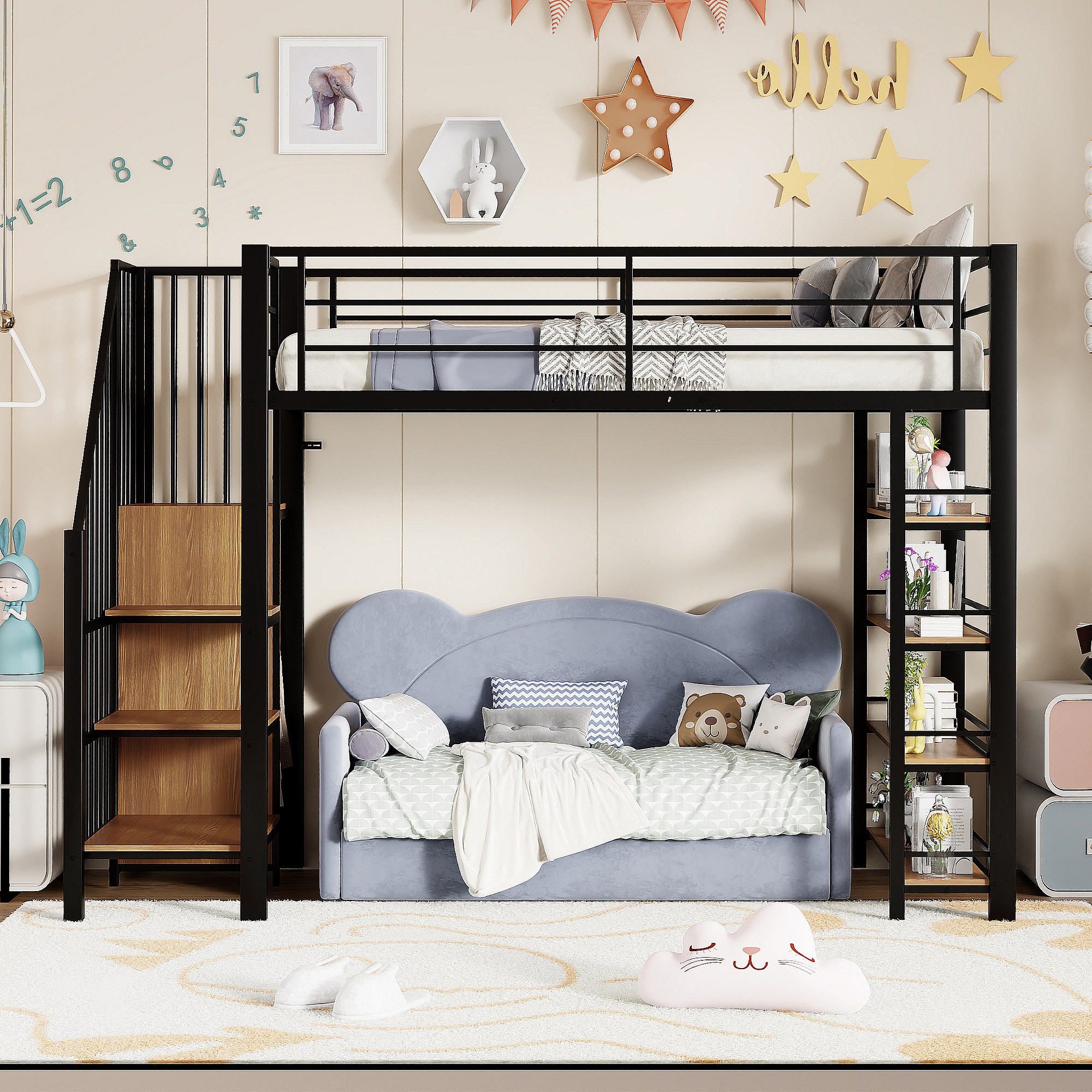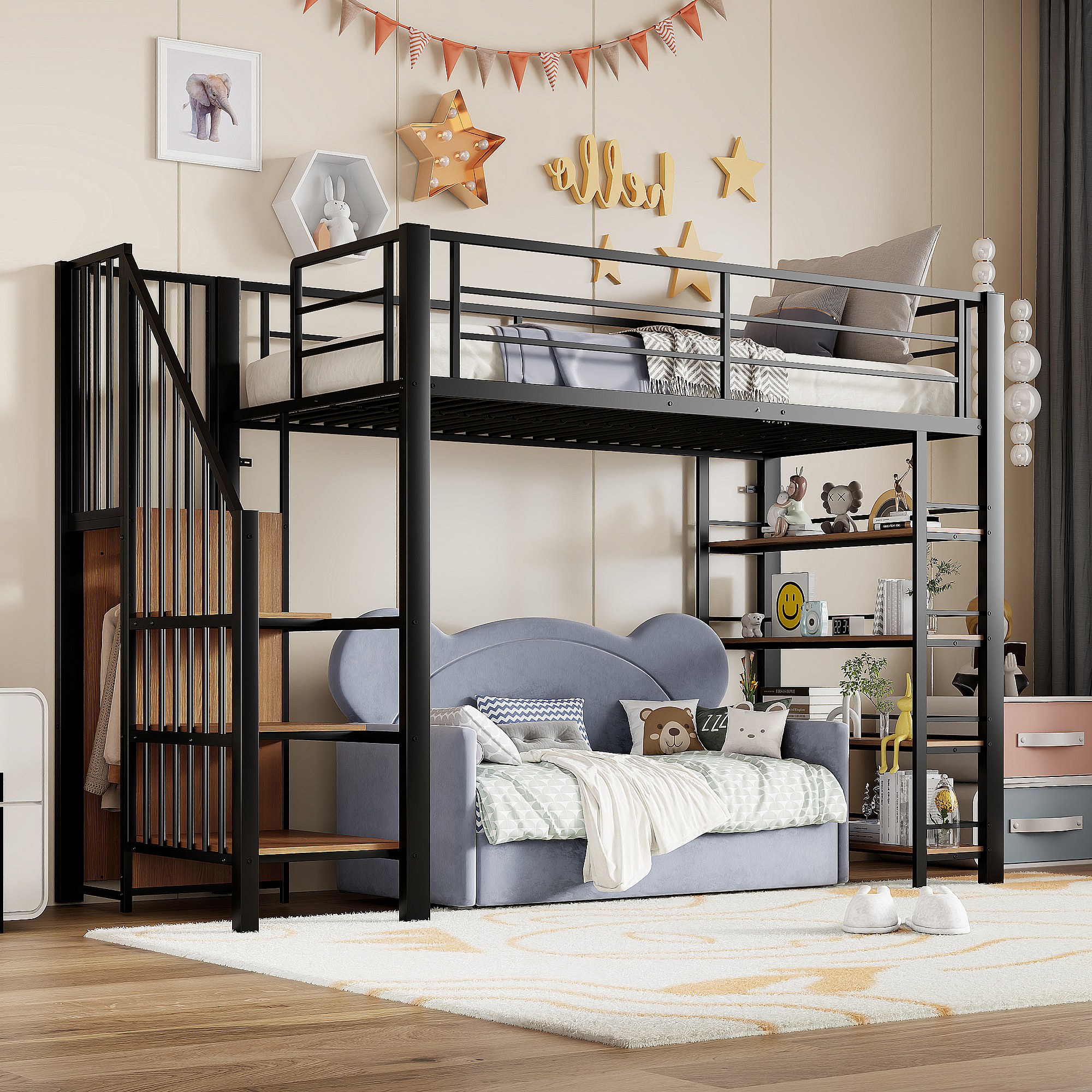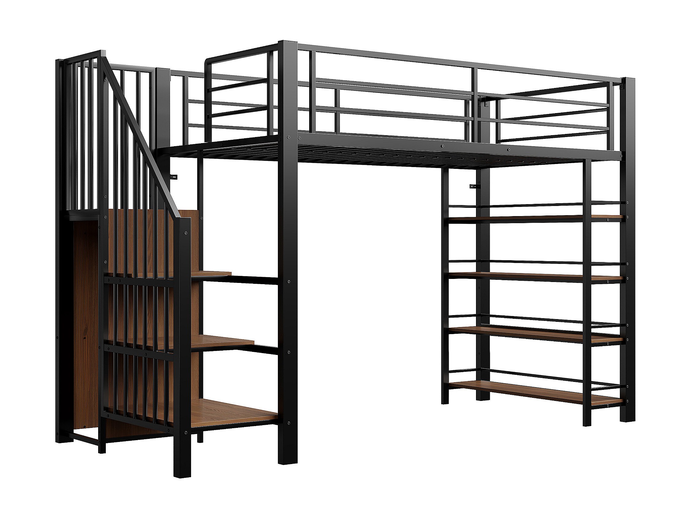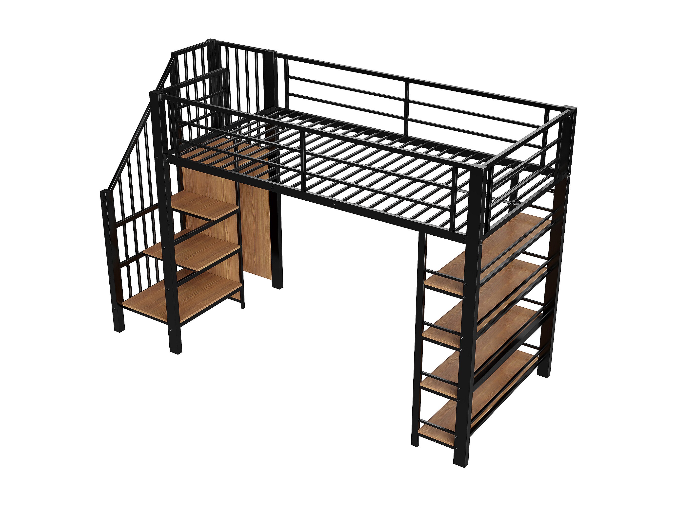 Letto a soppalco nero e legno 90x200cm con scaletta di sicurezza, piccolo armadio, ripiani e barriera (senza materasso)