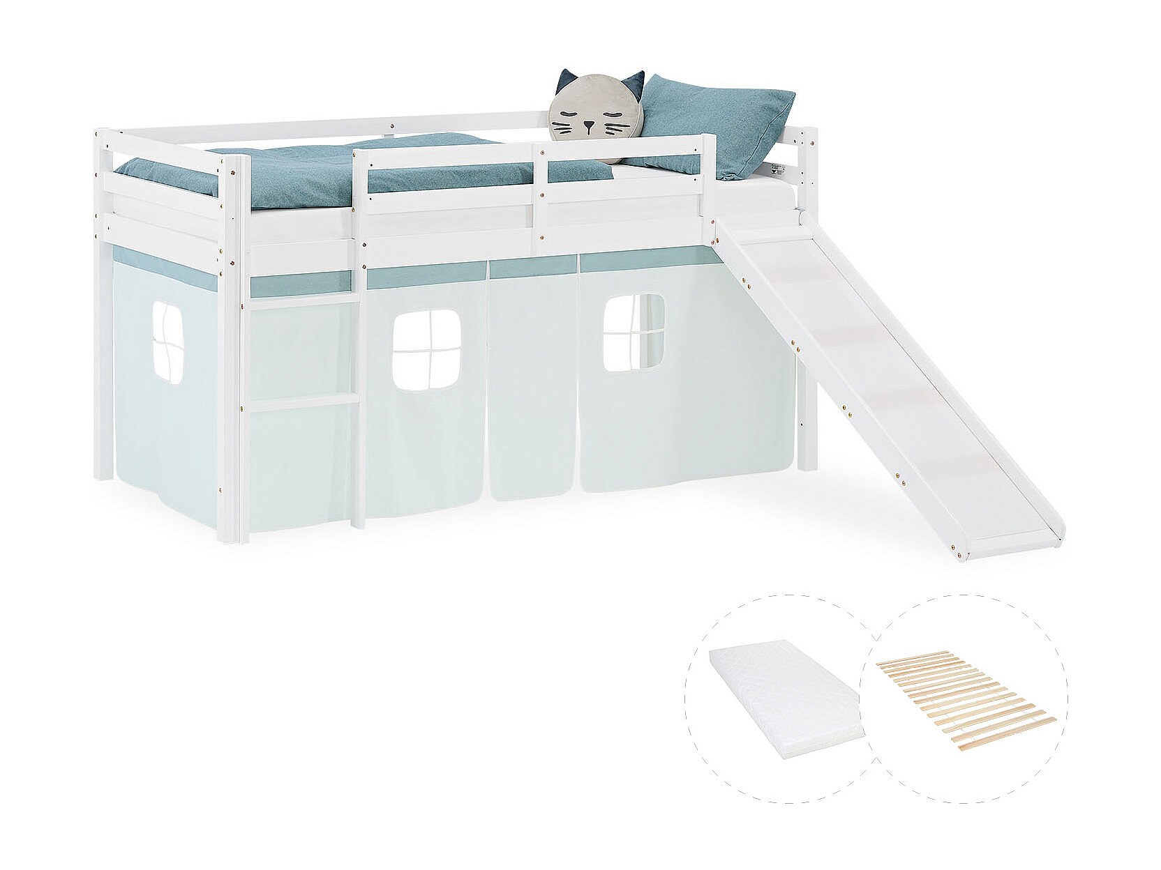 Letto a soppalco per bambini 90x200 cm bianco con tenda verde, scivolo, rete a doghe e materasso