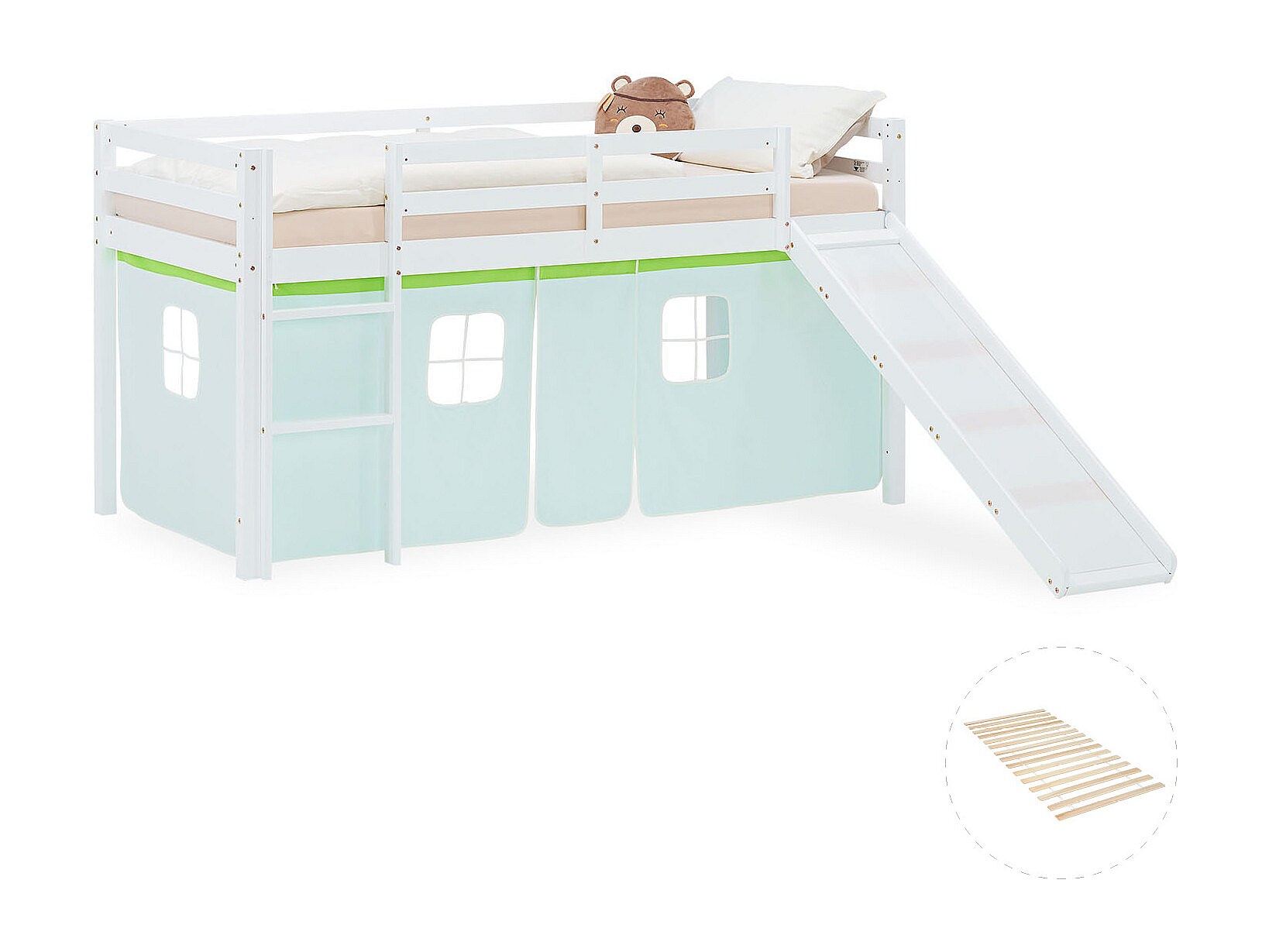 Letto a soppalco per bambini 90x200 cm bianco con tenda verde, scivolo, rete a doghe e materasso