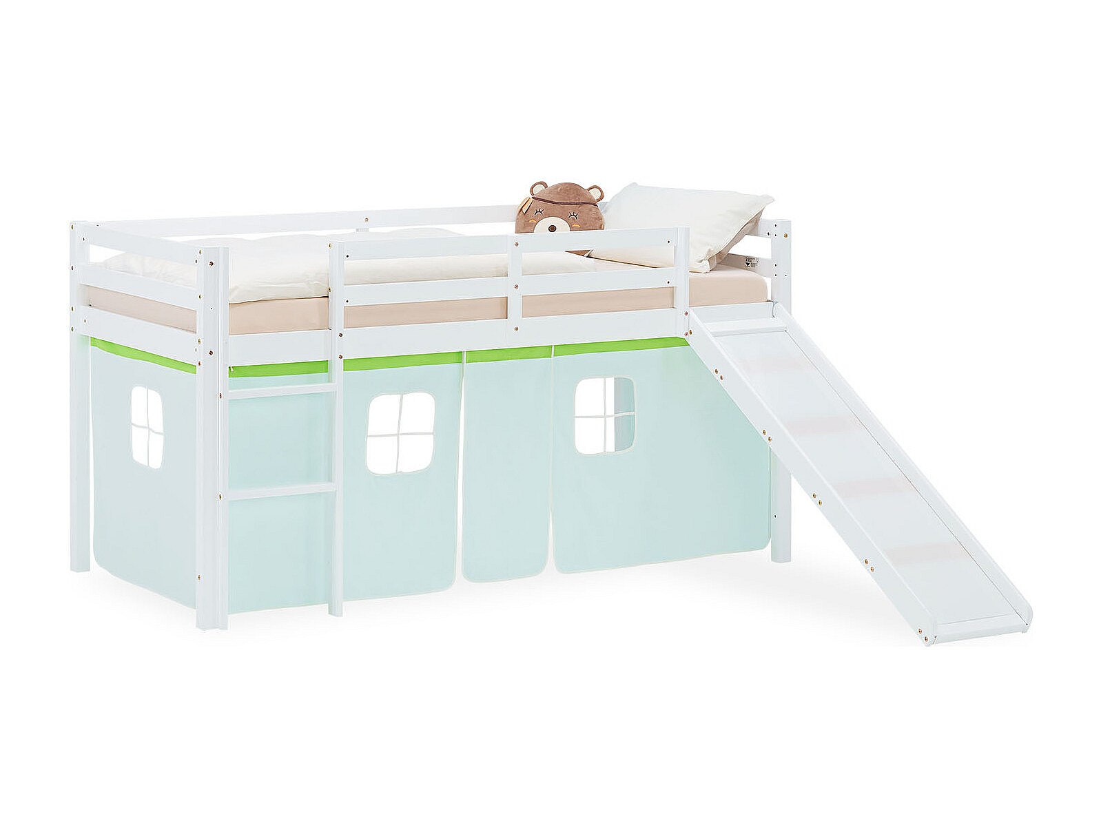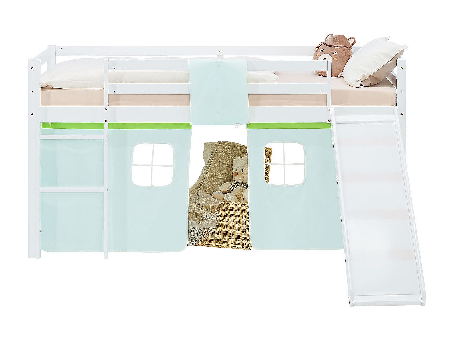 Letto a soppalco per bambini 90x200 cm bianco con tenda verde, scivolo, rete a doghe e materasso