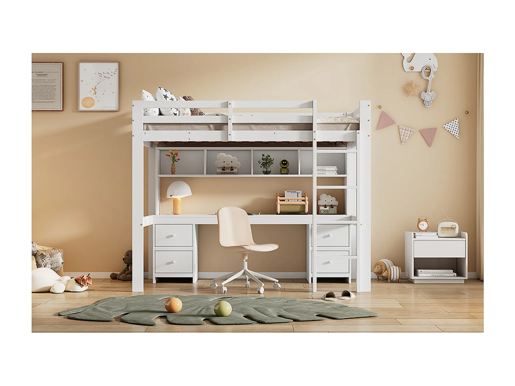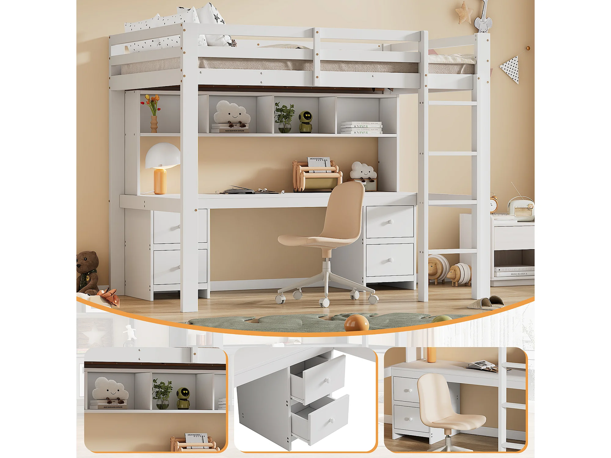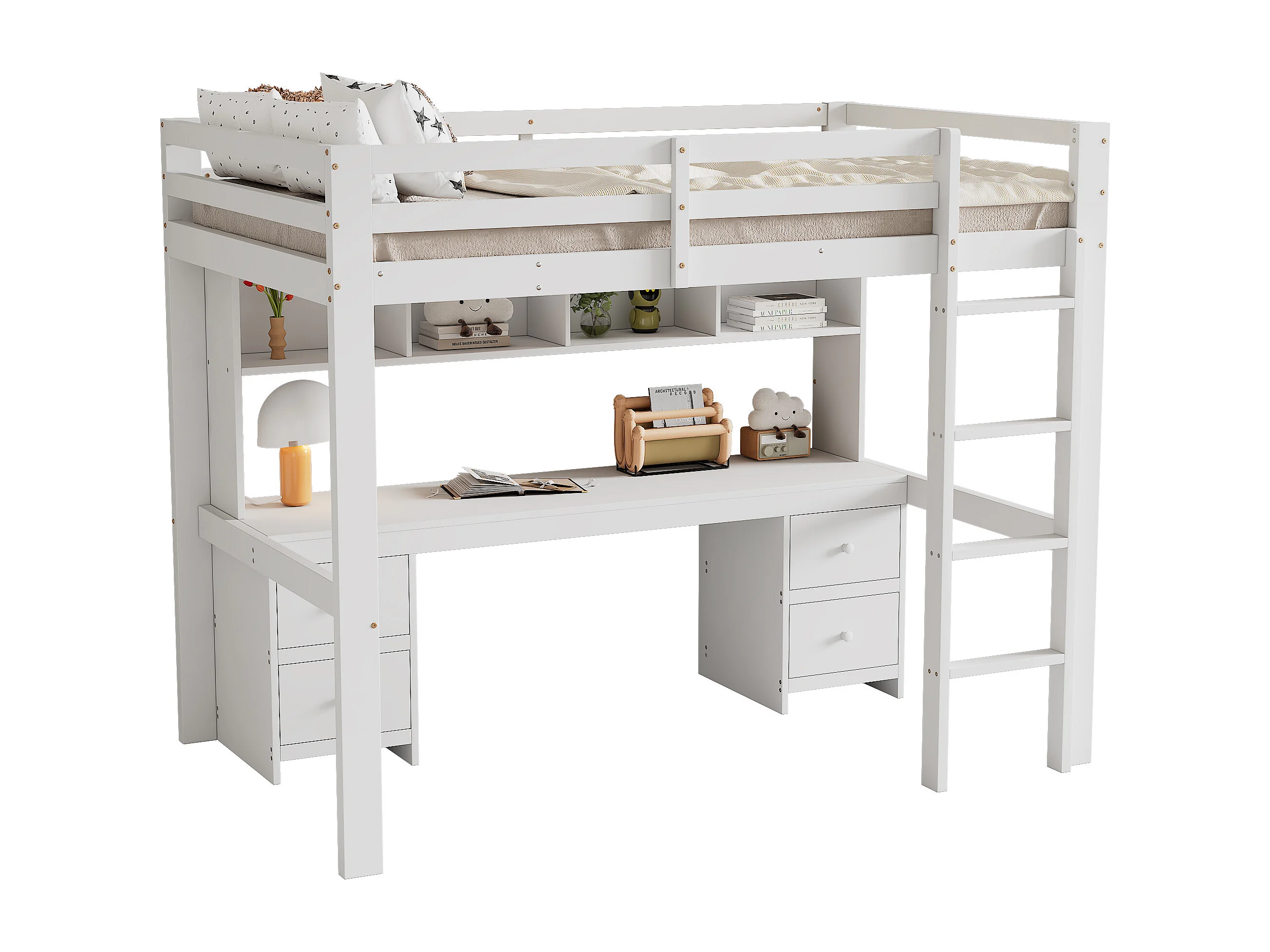 Letto a soppalco per bambini 90x200 cm con 4 cassetti e scrivania - Legno di pino e MDF - Bianco (materasso non incluso)