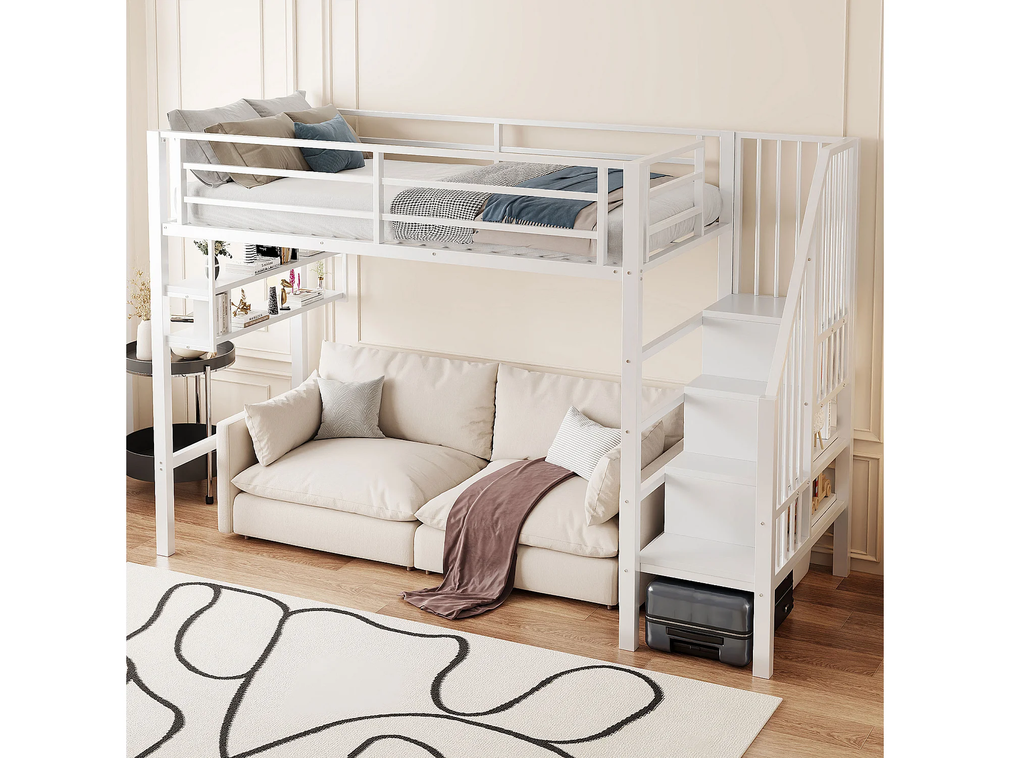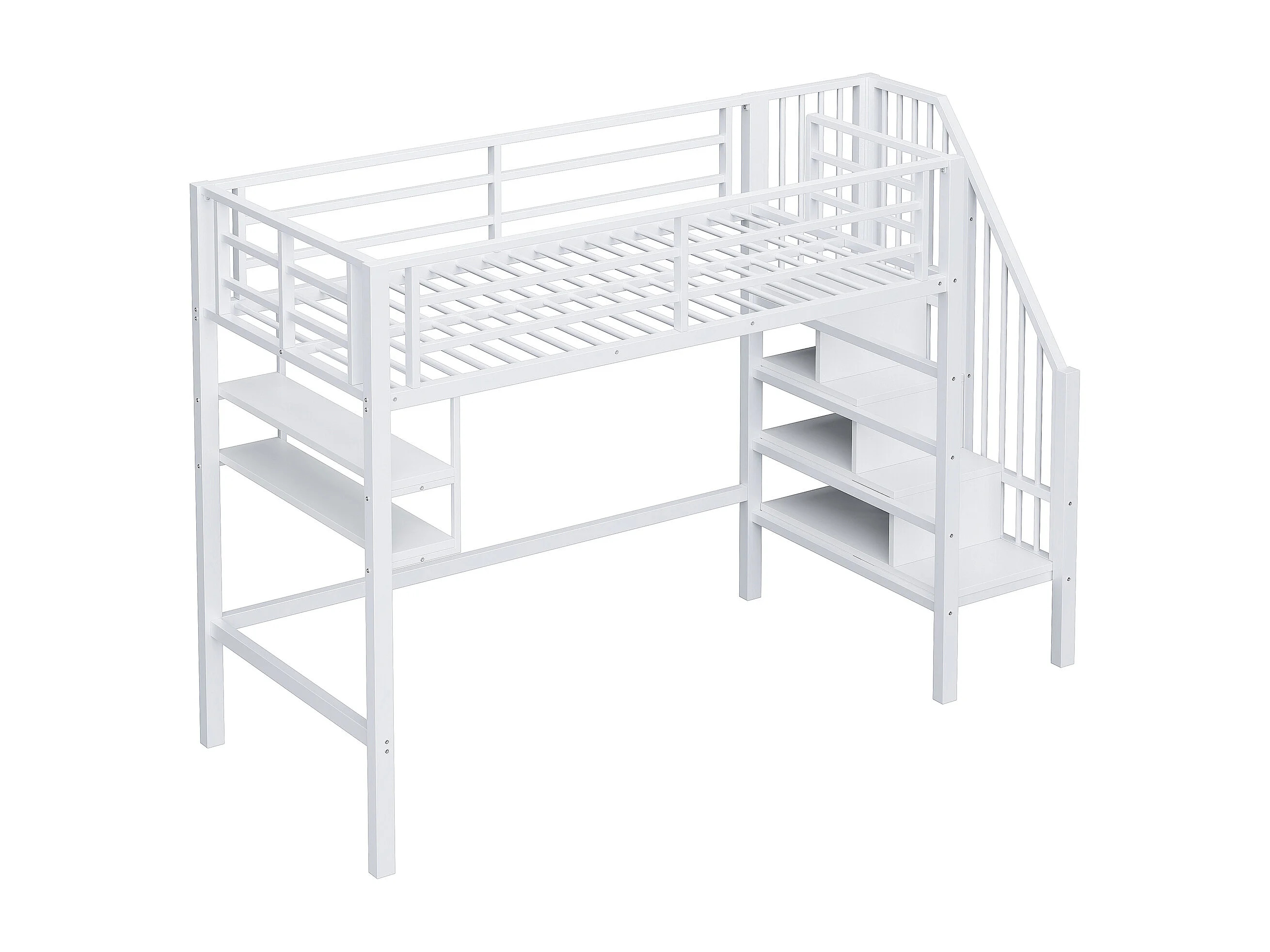 Letto a soppalco per bambini 90x200cm in metallo bianco, con scale e ripiani portaoggetti, rete inclusa, senza materasso