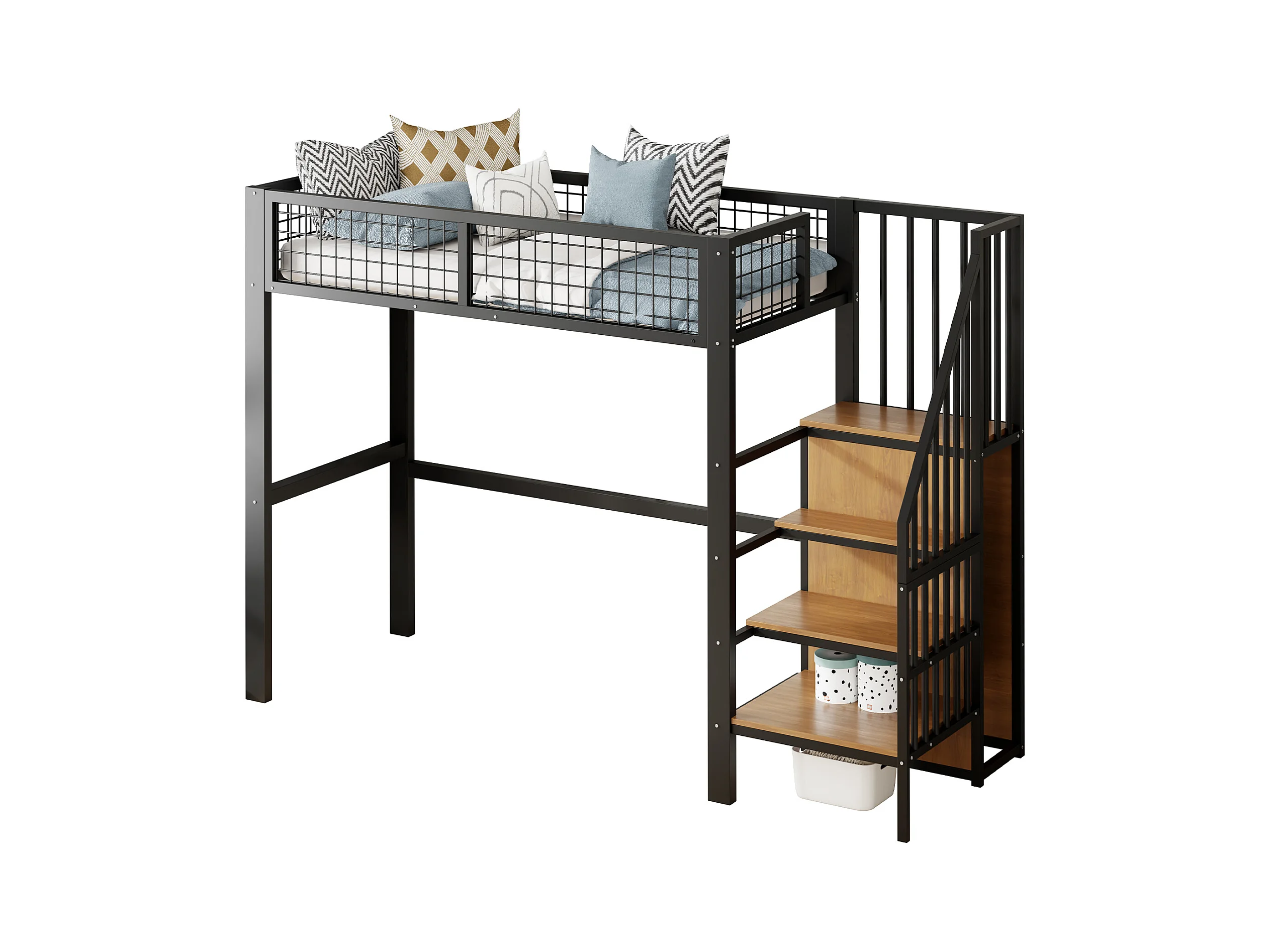 Letto alto 90x200 con scaletta, struttura in metallo, vano contenitore e armadio, colore nero (255x95x176 cm)