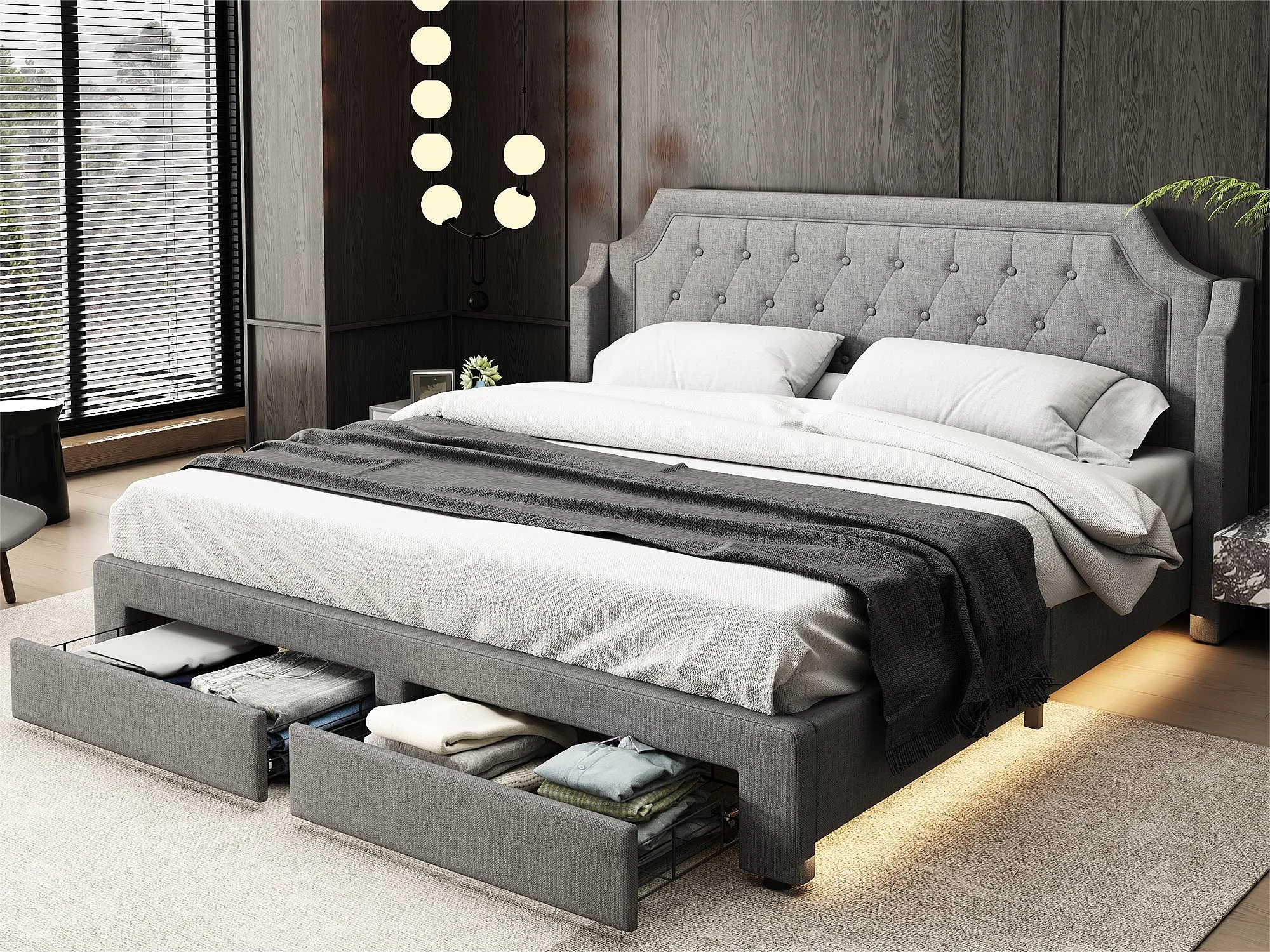 Letto con 2 cassetti - 180 x 200 cm - LED - tessuto di lino - rete a doghe - Grigio