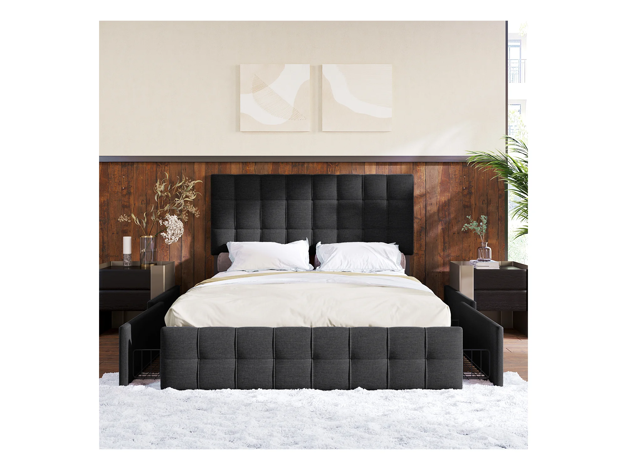 Letto con testiera e 4 cassetti - 140 x 200 cm - tessuto di lino - nero