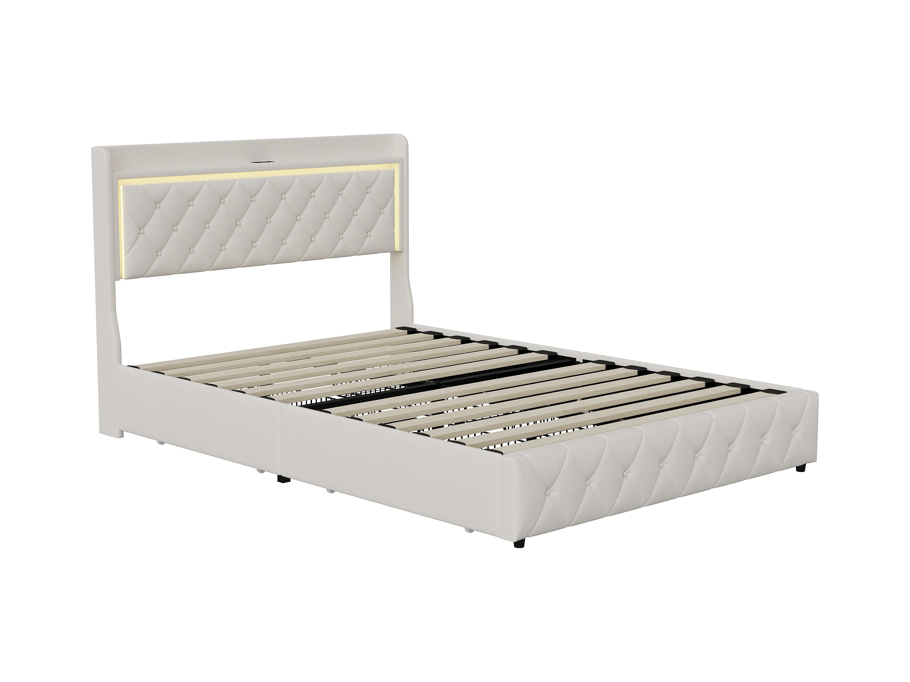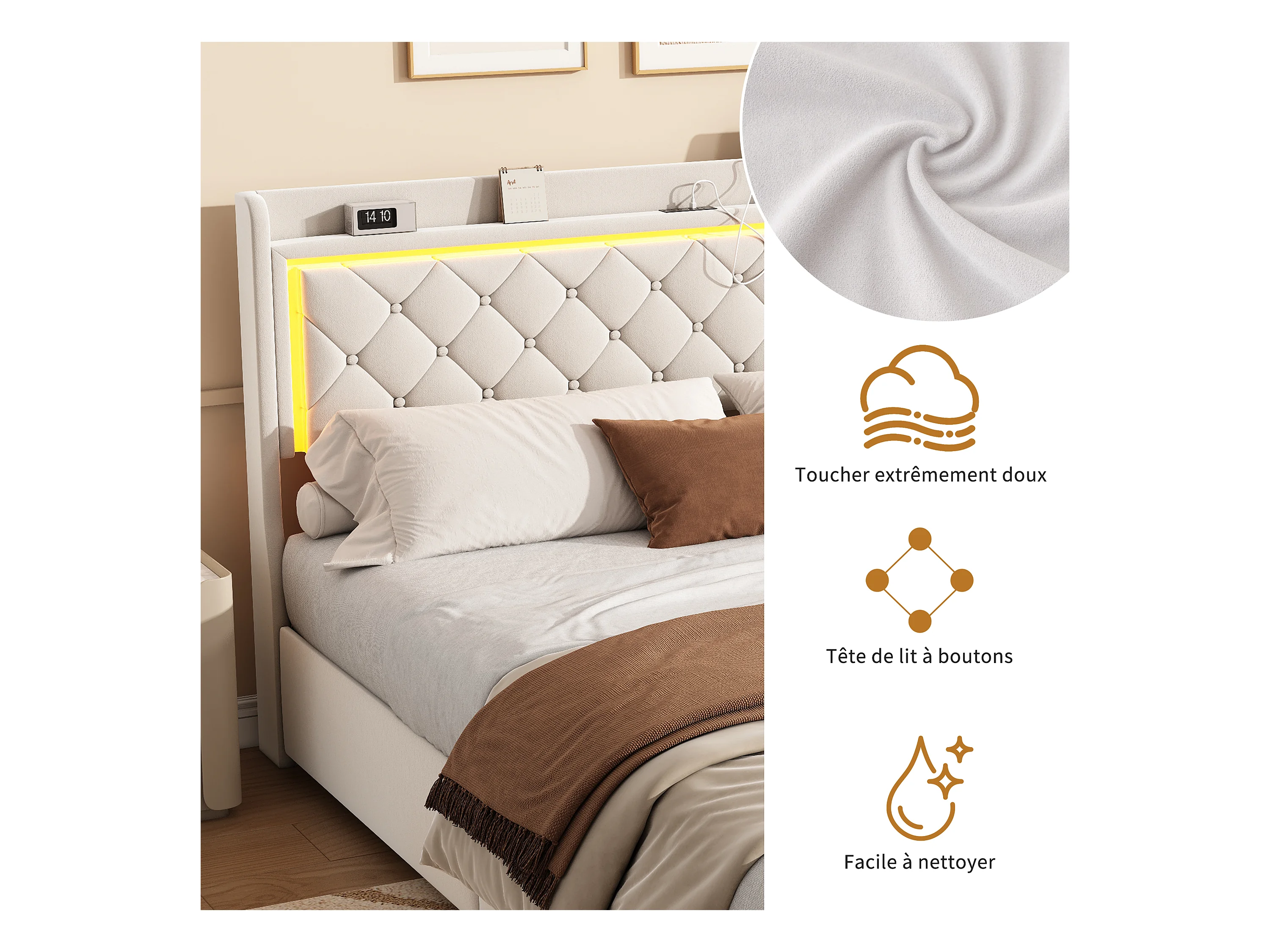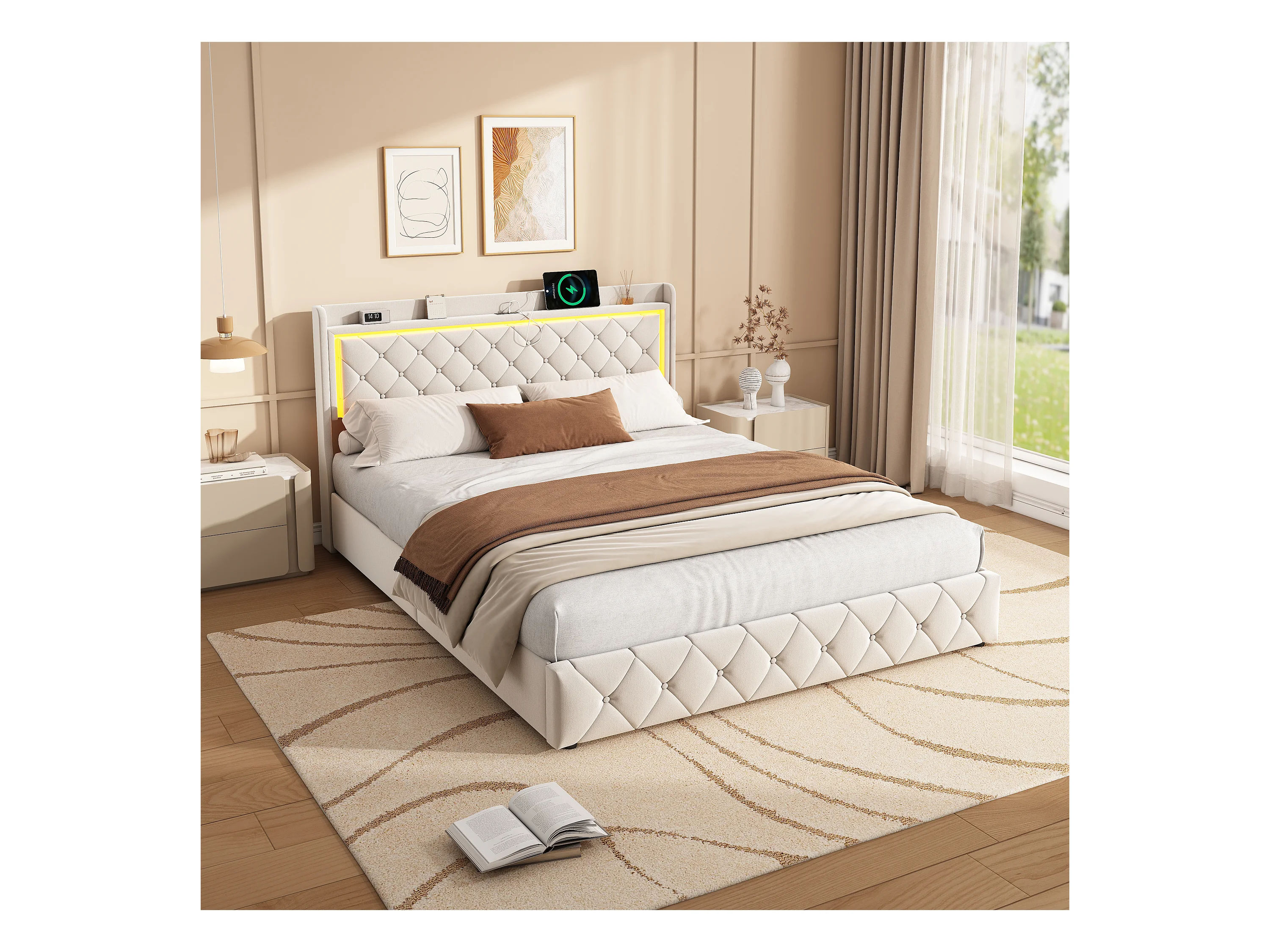 Letto con cassetti 140x200 cm in velluto beige, testiera e contenitore a gas, luce LED, porta USB + Type-C, design moderno e confortevole