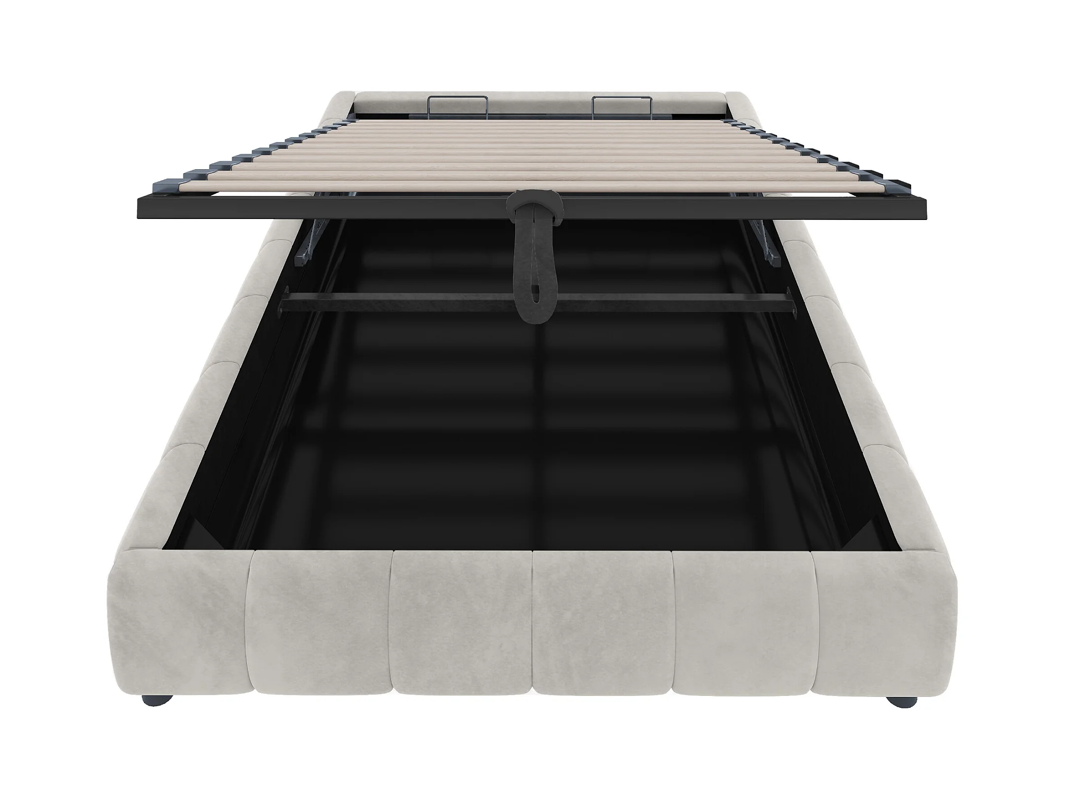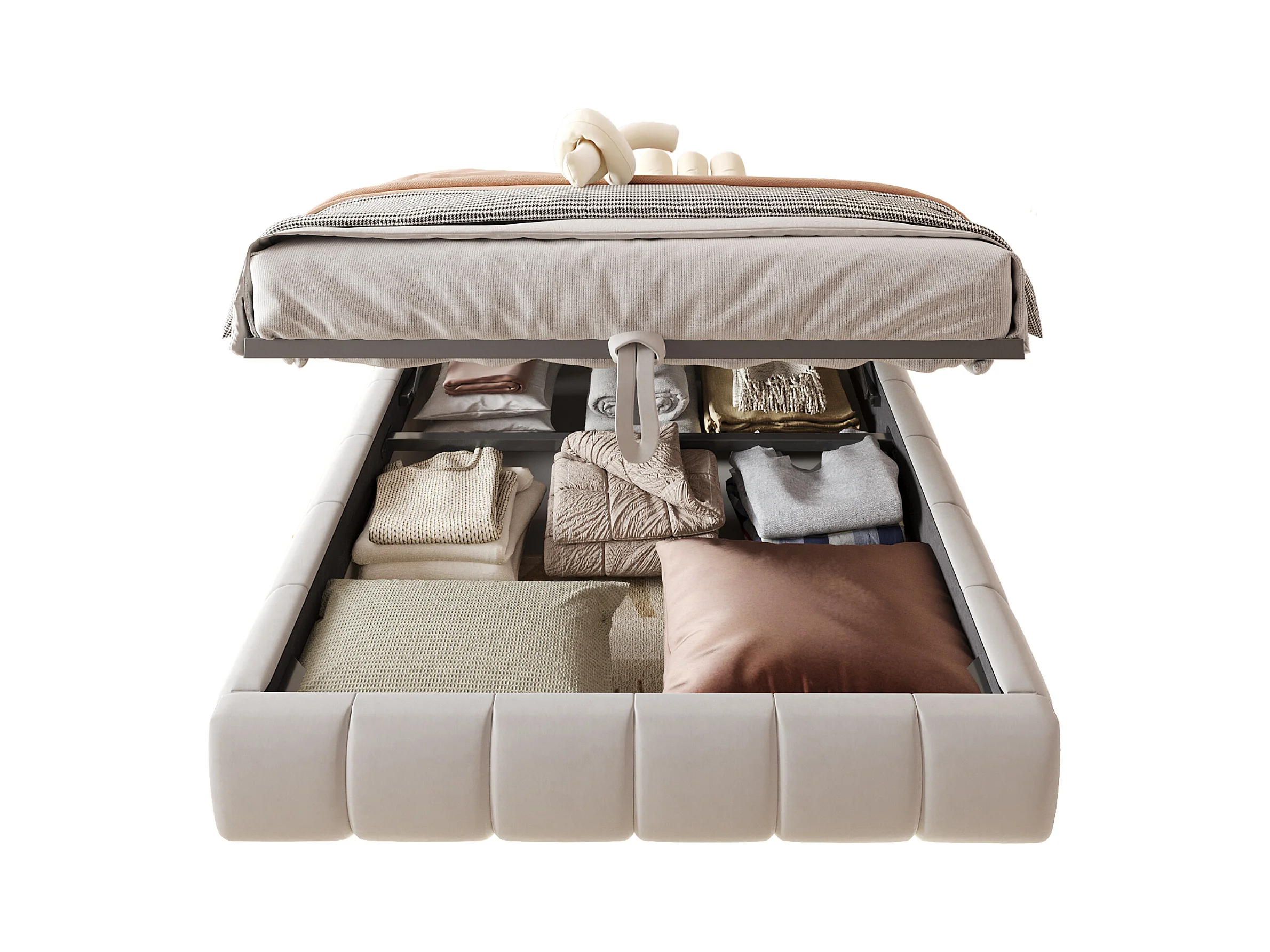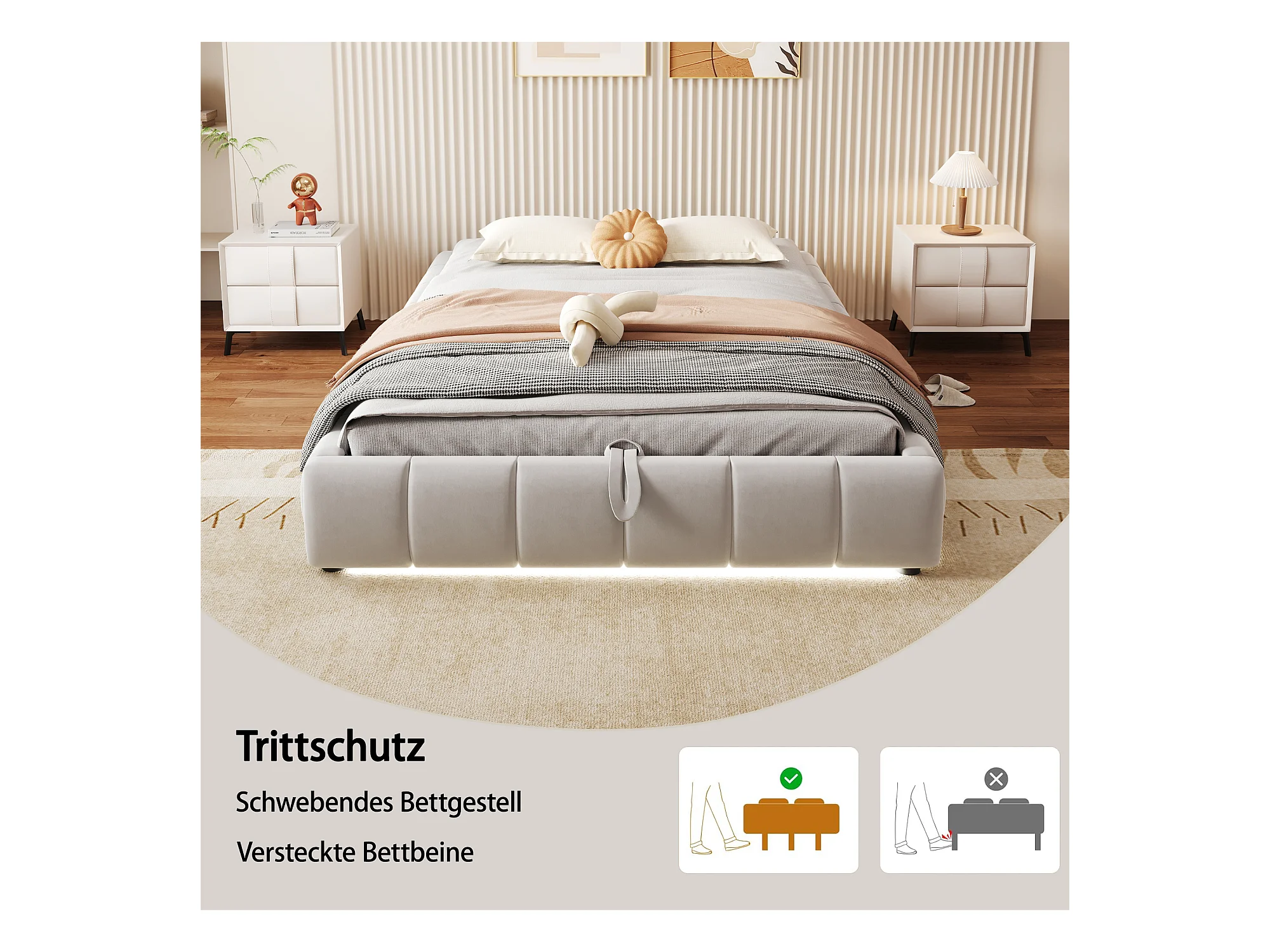 Letto con contenitore idraulico 140x200 cm, senza testiera, con LED integrato, rete flottante, beige (214,5x155x29,5 cm)