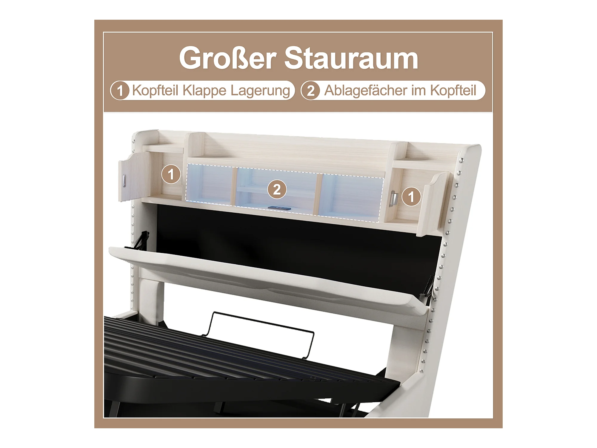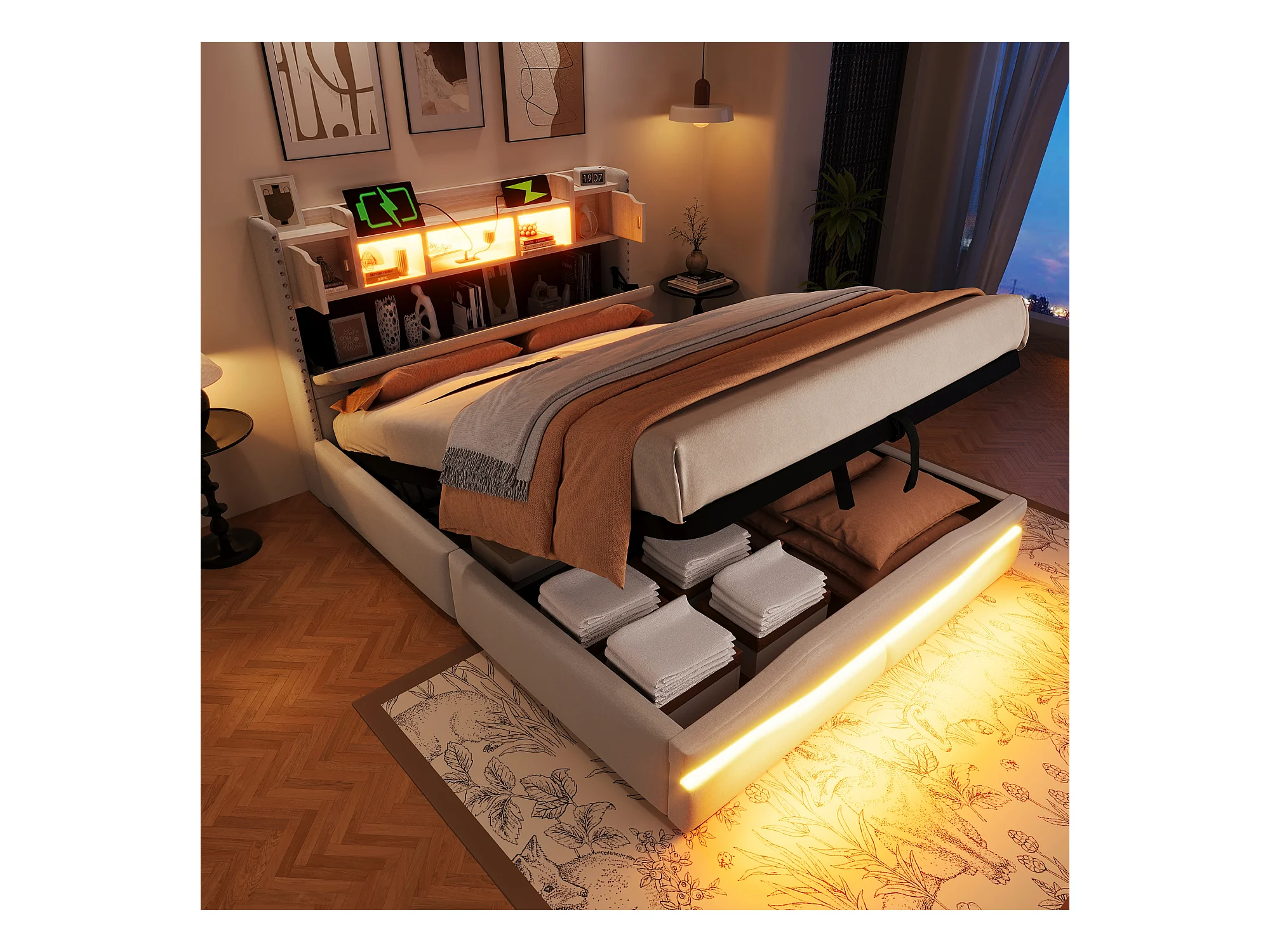 Letto matrimoniale con contenitore, luce di lettura e caricabatterie USB, lenzuola beige (206x145x107cm)