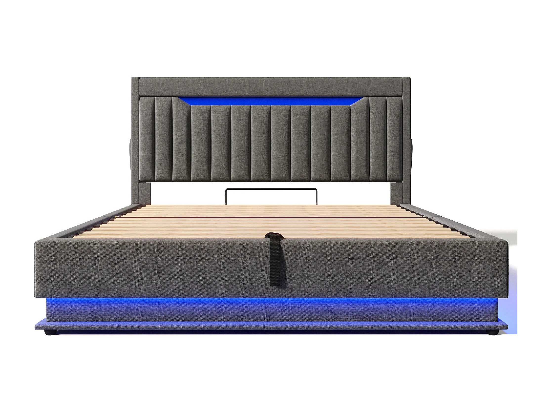 Letto con contenitore imbottito 140x190 cm - con LED - con porte USB e Type-C - Tessuto di lino - Testata con spazio di archiviazione - Grigio